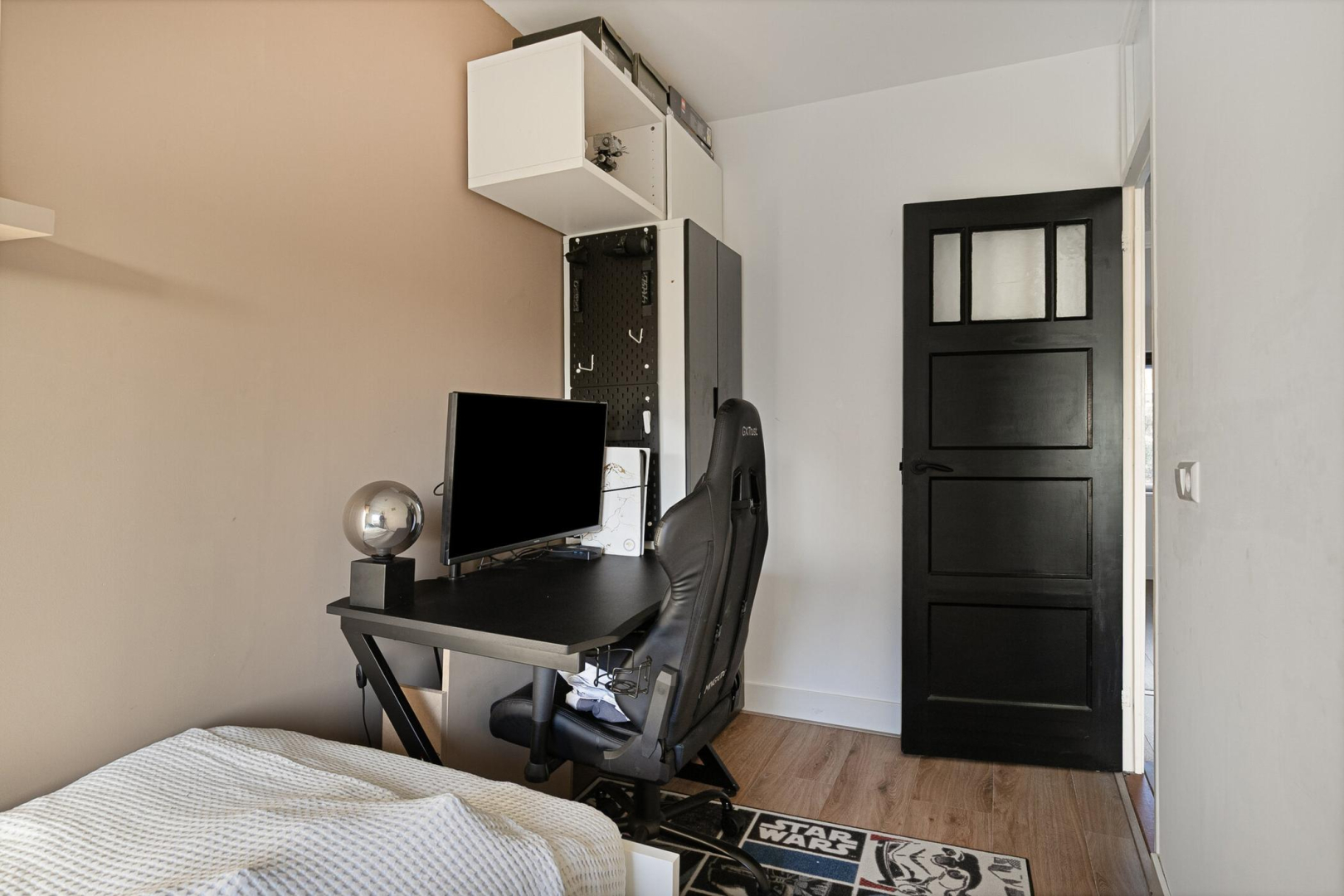 De zolderruimte heeft een dakkapel en biedt extra bergruimte achter de knieschotten. Deze ruimte is ideaal als hobbykamer, werkplek of extra logeerplek en ook hier ligt een nette laminaatvloer.