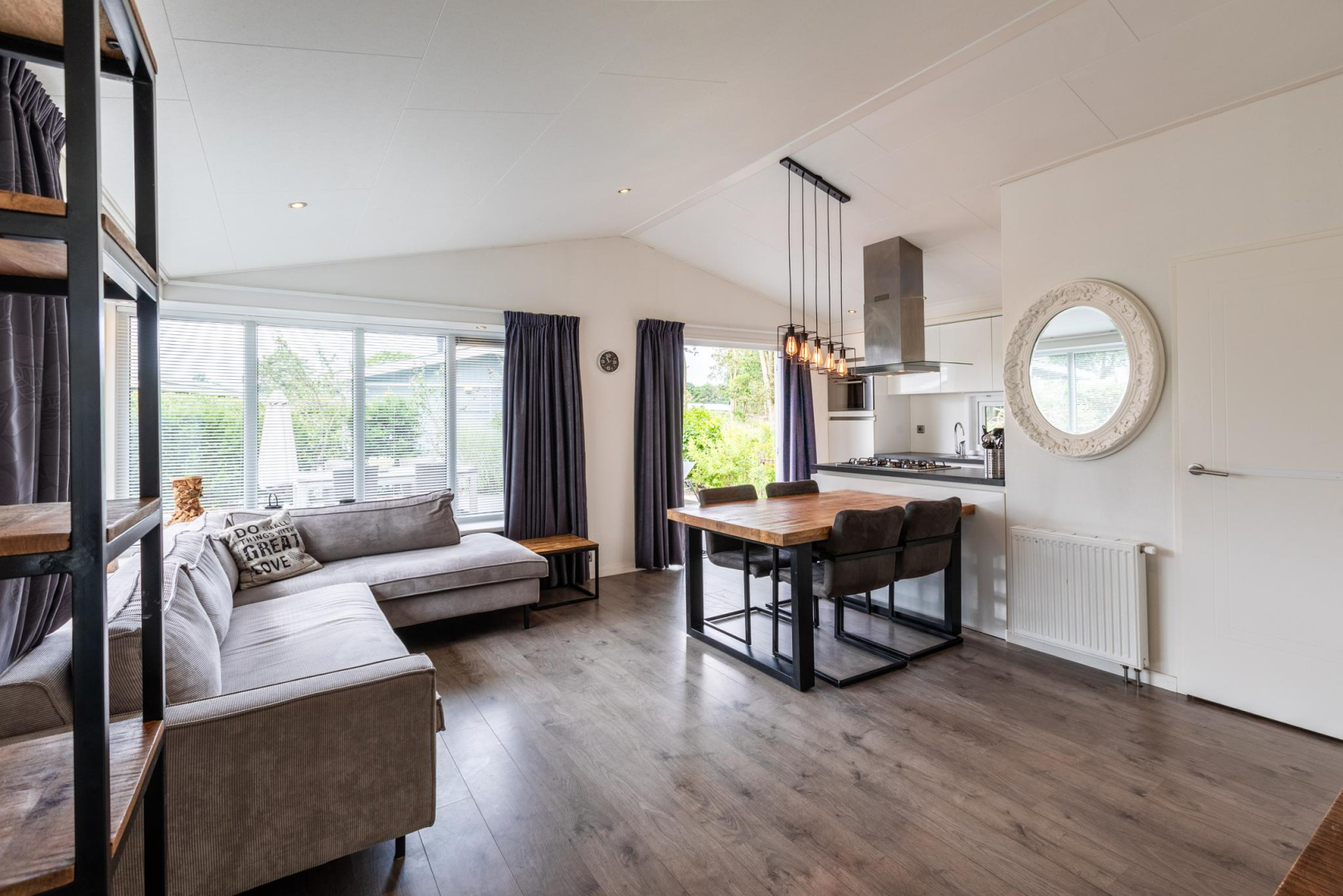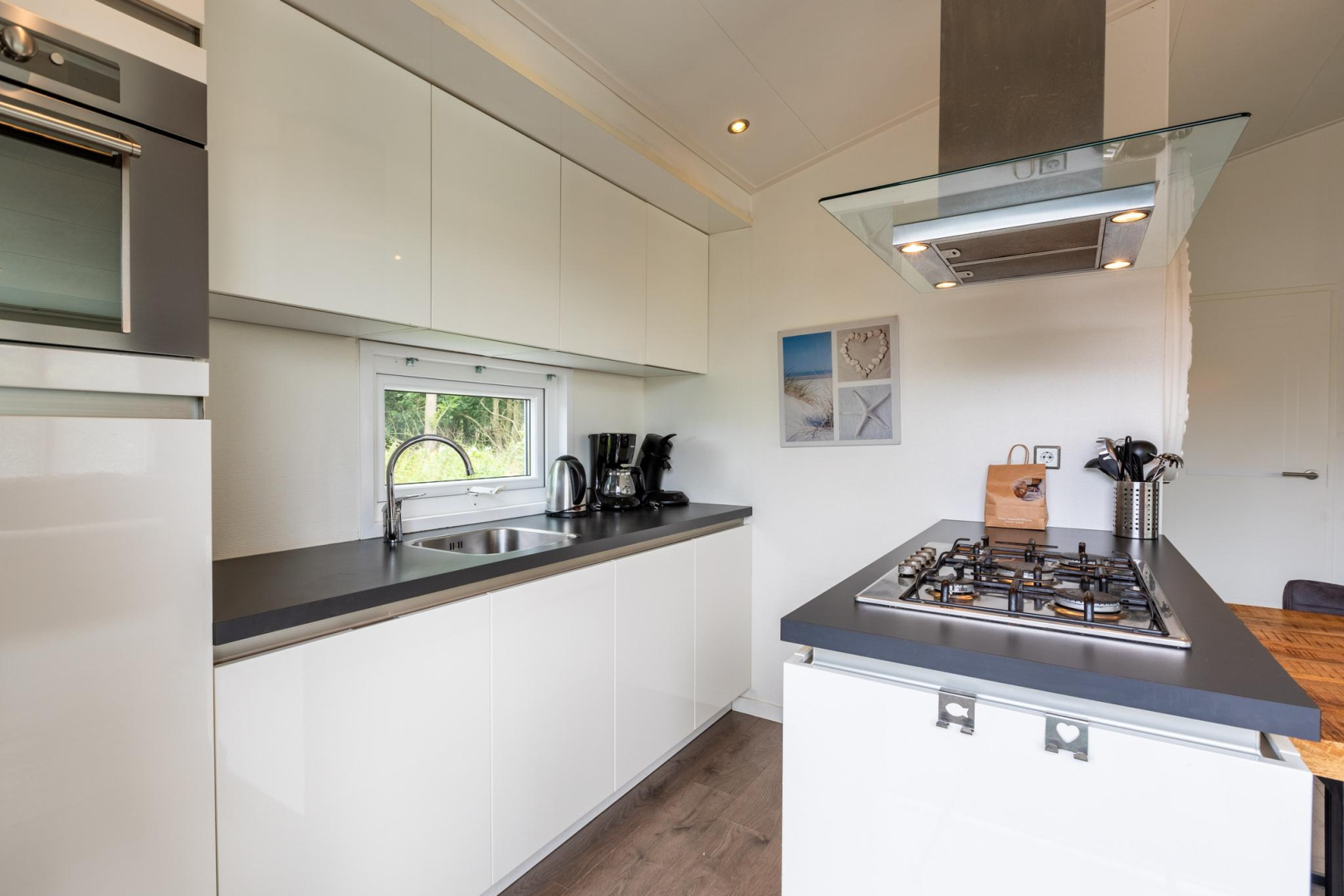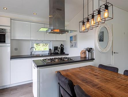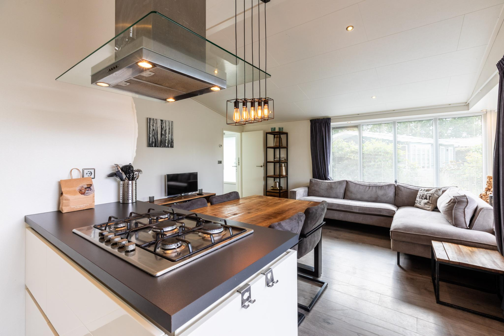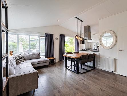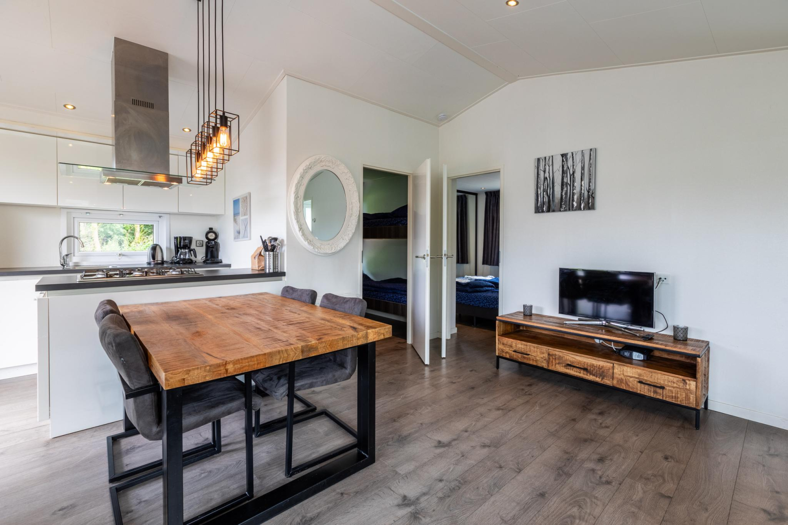 Entree, hal met garderobe, toegang tot de lichte en ruime woon- en eetkamer. Deze kamer heeft openslaande deuren naar het terras. De open keuken is uitgerust met een kookeiland en diverse inbouwapparatuur, waaronder een koelkast, een 5-pits RVS kookplaat, een combi-oven en een vaatwasser. De badkamer is praktisch ingericht met een toilet, een wastafelmeubel, een spiegelkast en een douche. De hoofdslaapkamer biedt extra comfort met een vaste kastenwand voor voldoende opbergruimte. In de tweede slaapkamer is er plaats voor twee stapelbedden en een opbergkast, ideaal voor gasten of kinderen. Zowel de woonkamer als de slaapkamers zijn voorzien van een stijlvolle laminaatvloer, wat bijdraagt aan de moderne uitstraling en het onderhoudsgemak van het chalet.