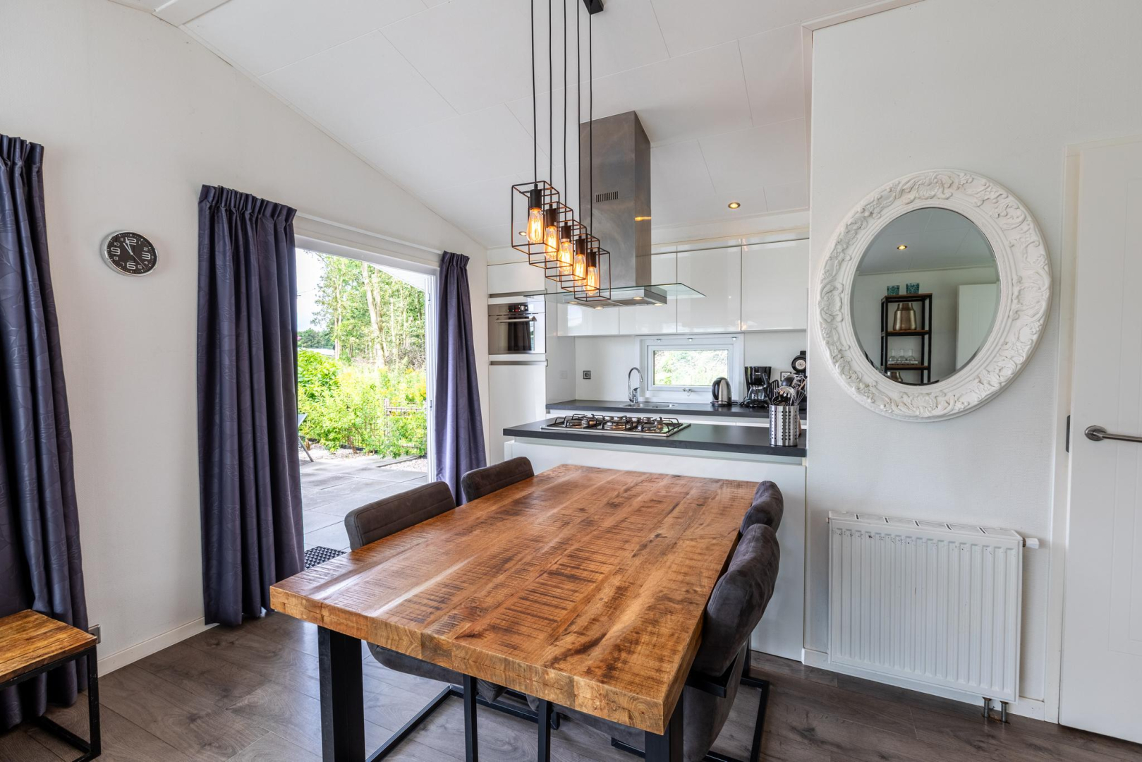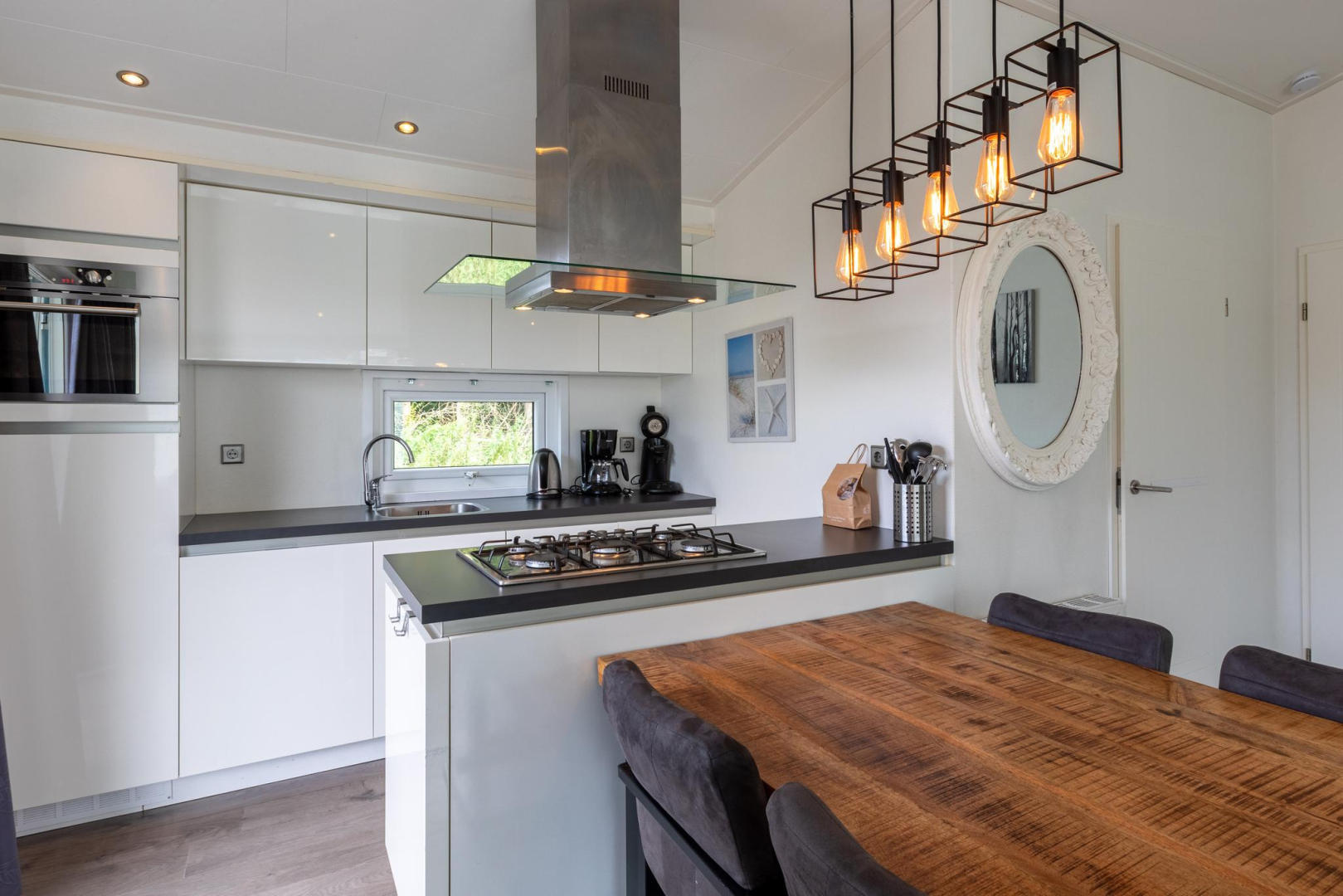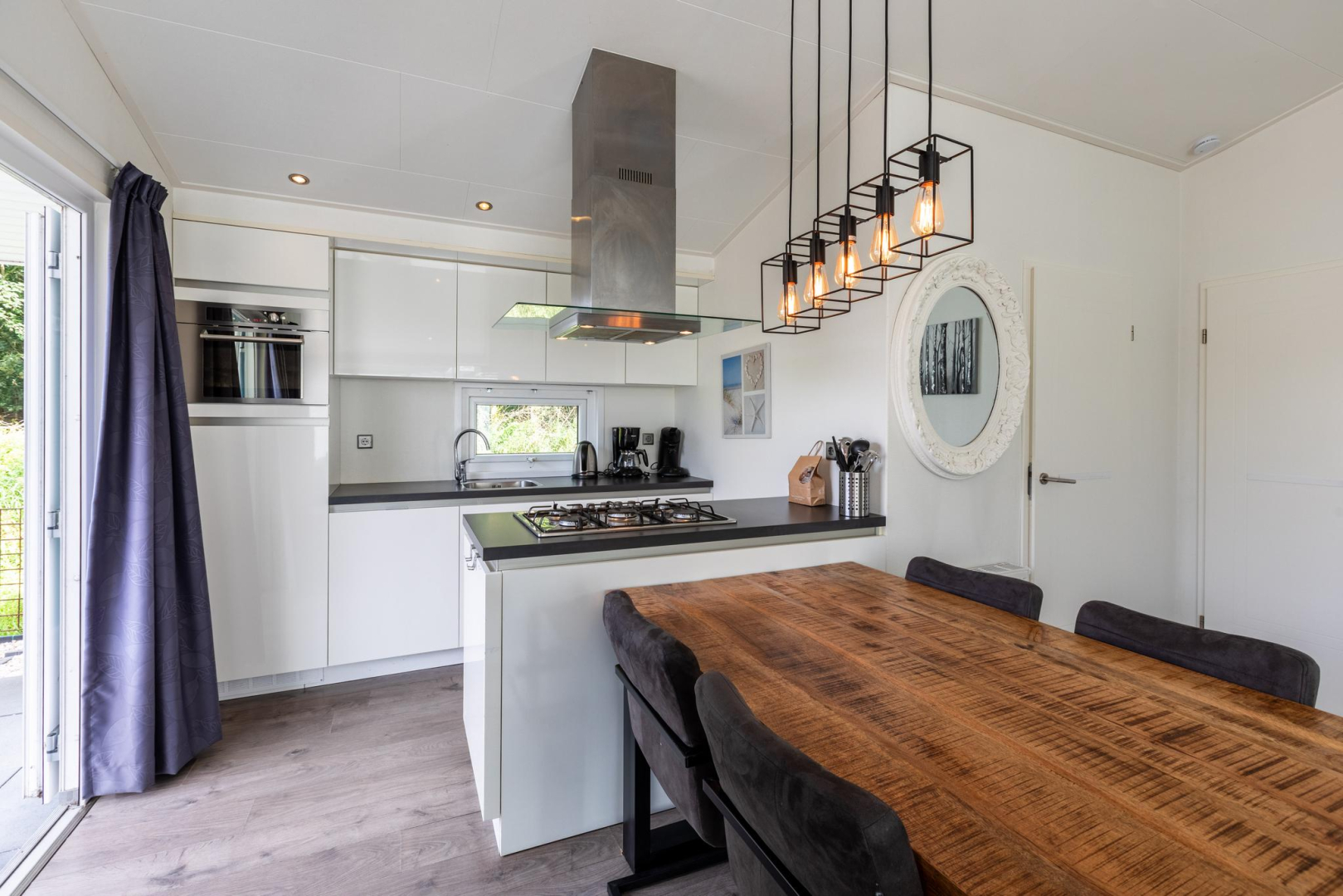 Entree, hal met garderobe, toegang tot de lichte en ruime woon- en eetkamer. Deze kamer heeft openslaande deuren naar het terras. De open keuken is uitgerust met een kookeiland en diverse inbouwapparatuur, waaronder een koelkast, een 5-pits RVS kookplaat, een combi-oven en een vaatwasser. De badkamer is praktisch ingericht met een toilet, een wastafelmeubel, een spiegelkast en een douche. De hoofdslaapkamer biedt extra comfort met een vaste kastenwand voor voldoende opbergruimte. In de tweede slaapkamer is er plaats voor twee stapelbedden en een opbergkast, ideaal voor gasten of kinderen. Zowel de woonkamer als de slaapkamers zijn voorzien van een stijlvolle laminaatvloer, wat bijdraagt aan de moderne uitstraling en het onderhoudsgemak van het chalet.