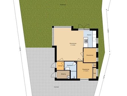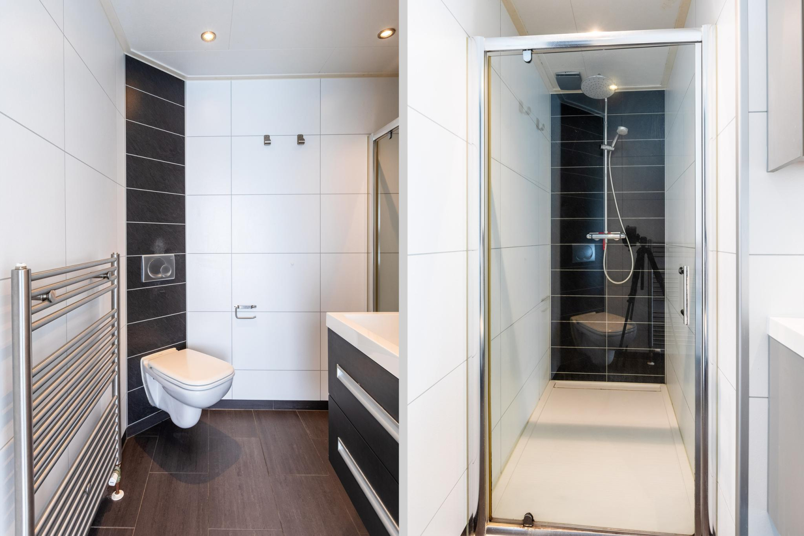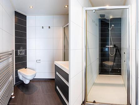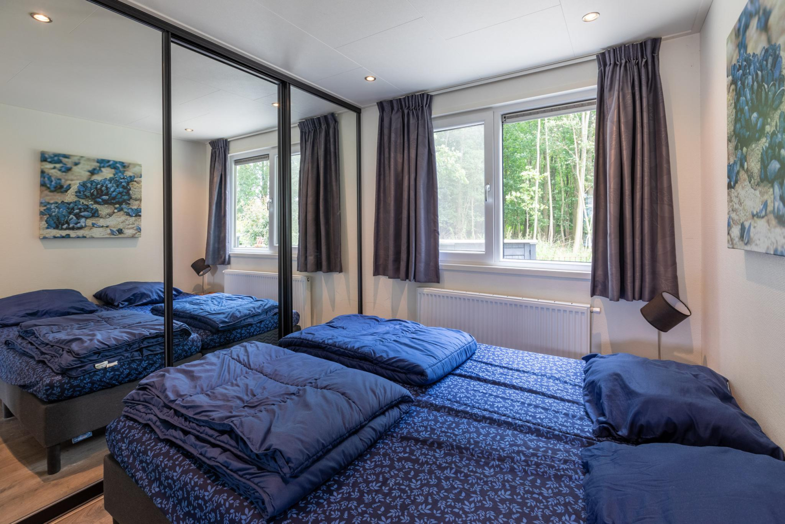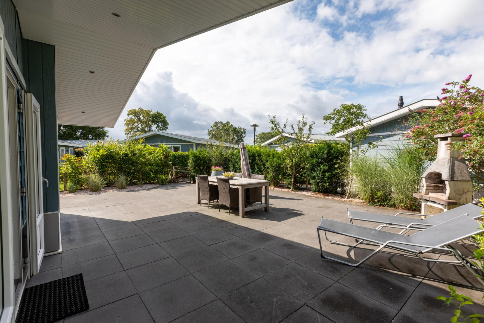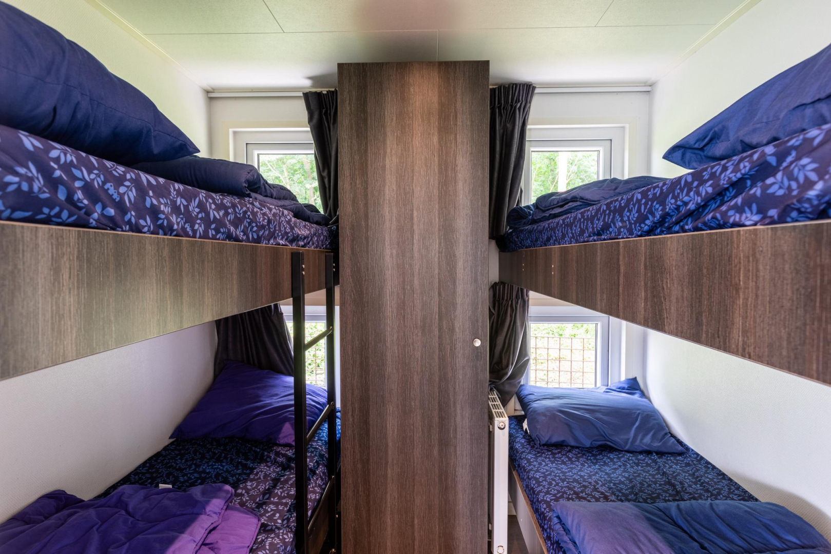 Entree, hal met garderobe, toegang tot de lichte en ruime woon- en eetkamer. Deze kamer heeft openslaande deuren naar het terras. De open keuken is uitgerust met een kookeiland en diverse inbouwapparatuur, waaronder een koelkast, een 5-pits RVS kookplaat, een combi-oven en een vaatwasser. De badkamer is praktisch ingericht met een toilet, een wastafelmeubel, een spiegelkast en een douche. De hoofdslaapkamer biedt extra comfort met een vaste kastenwand voor voldoende opbergruimte. In de tweede slaapkamer is er plaats voor twee stapelbedden en een opbergkast, ideaal voor gasten of kinderen. Zowel de woonkamer als de slaapkamers zijn voorzien van een stijlvolle laminaatvloer, wat bijdraagt aan de moderne uitstraling en het onderhoudsgemak van het chalet.