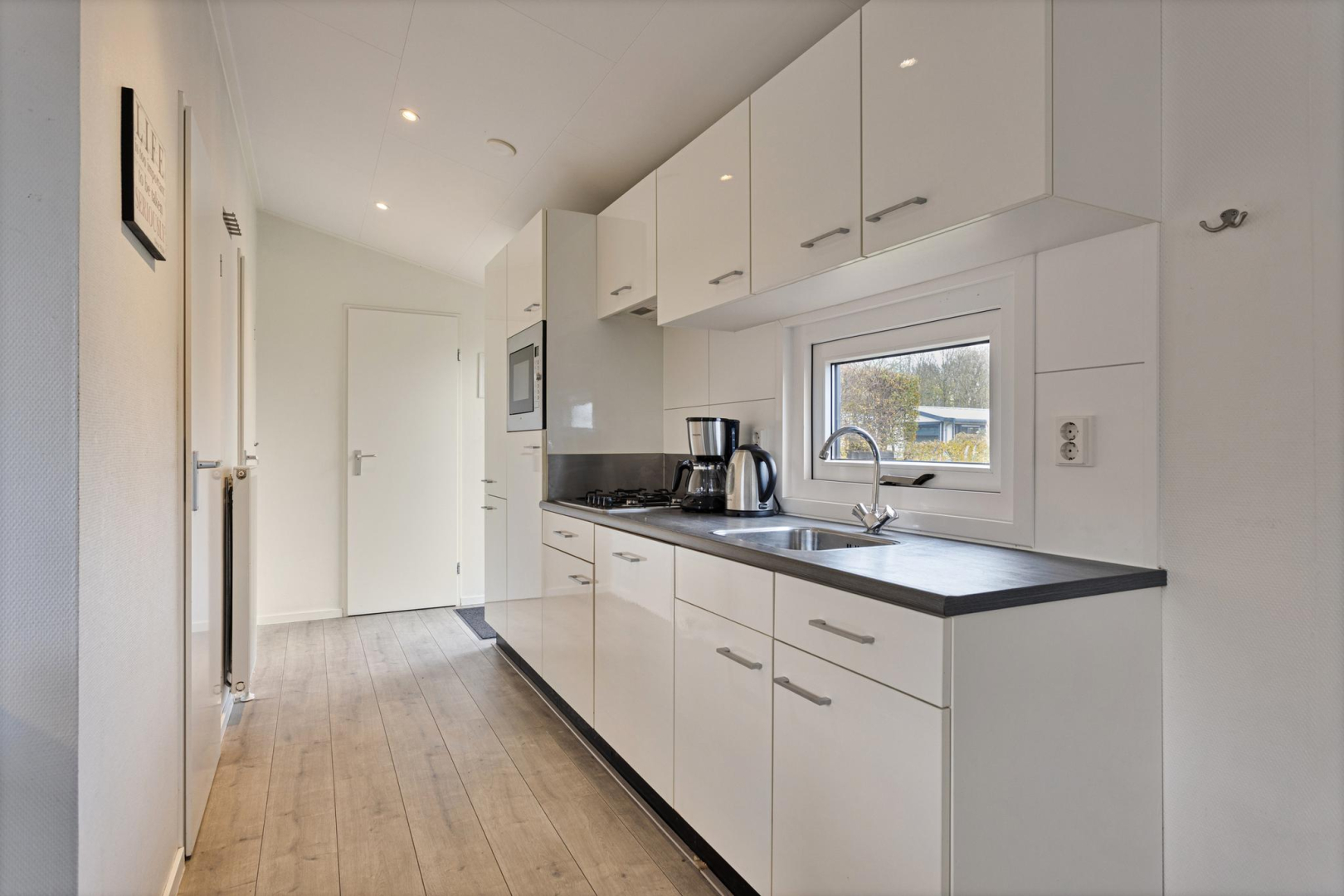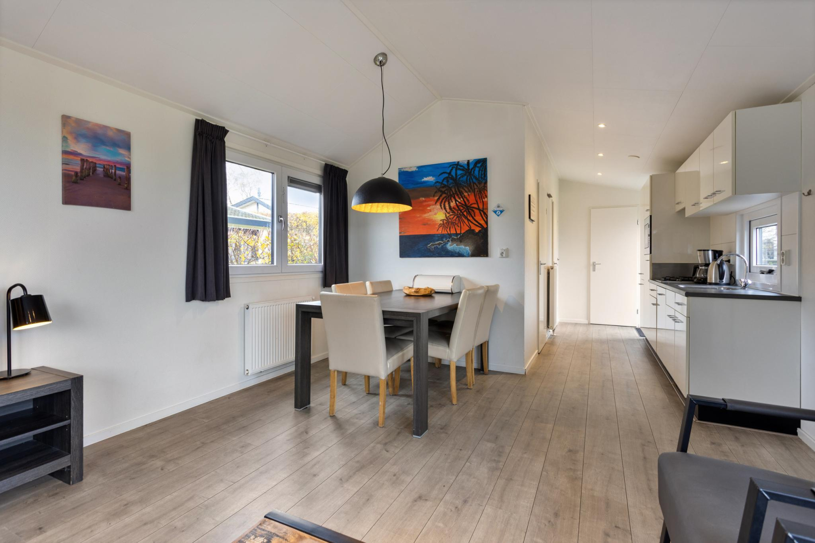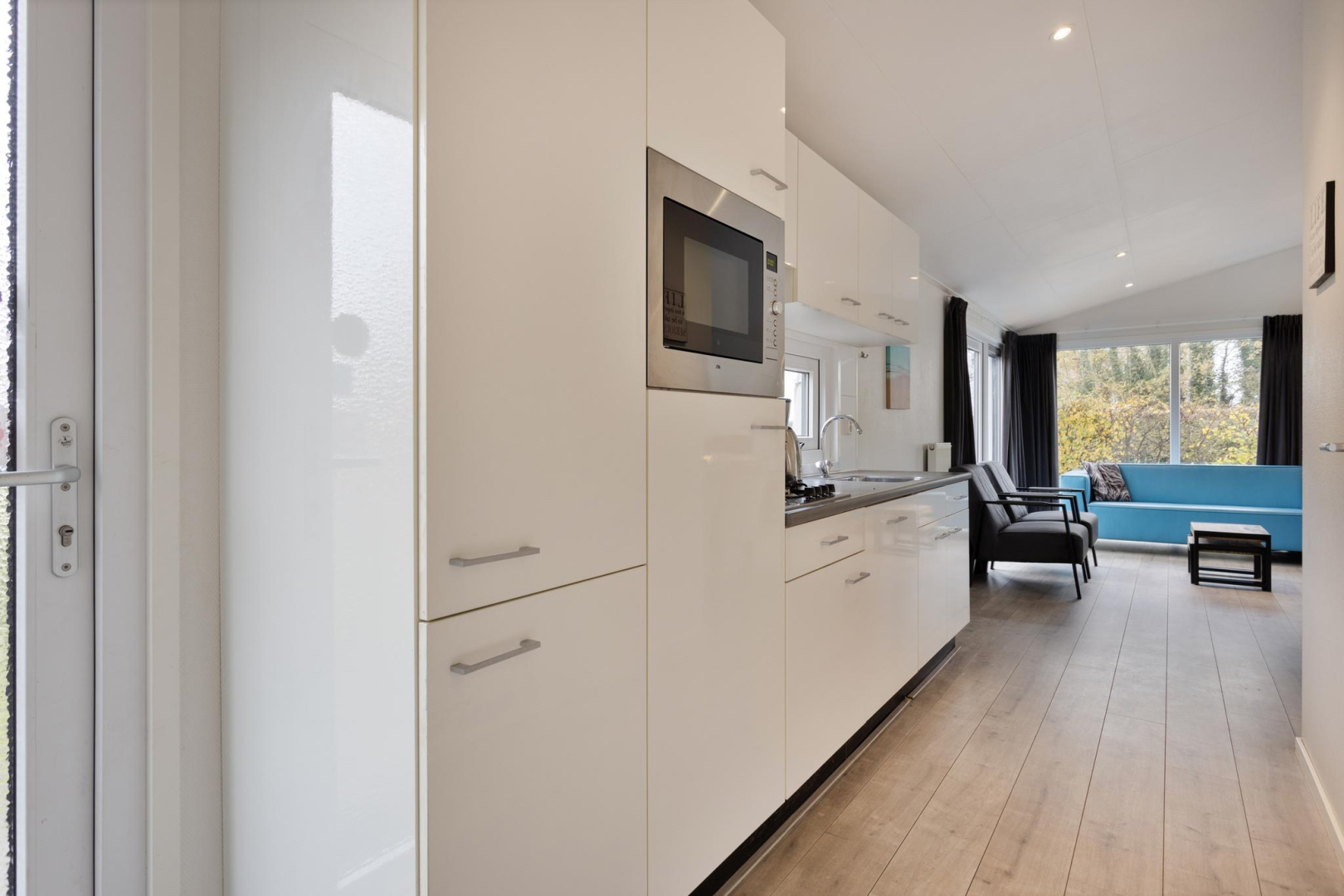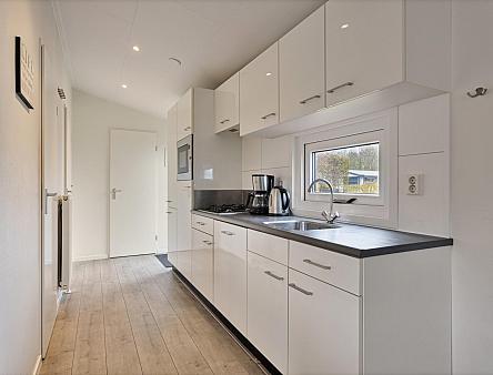 Entree, hal met aan de rechterzijde de hoofdslaapkamer met vaste kastenwand. De badkamer is voorzien van een toilet, wastafelmeubel, spiegelkast en douche. De 2e slaapkamer is ruim waardoor er plaats is voor een stapelbed en een 3e bed welke tegen de andere wand is geplaatst. De ruime woonkamer is heerlijk licht door de openslaande deuren naar het terras. Open keuken in een rechte opstelling met diverse inbouwapparatuur zoals, 4-pits gaskookplaat, oven en koelkast met vriesvak. Tevens bevindt in één van de keukenkasten de opstelplaats van de CV ketel. De woonkamer en slaapkamers zijn voorzien van een laminaatvloer.