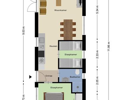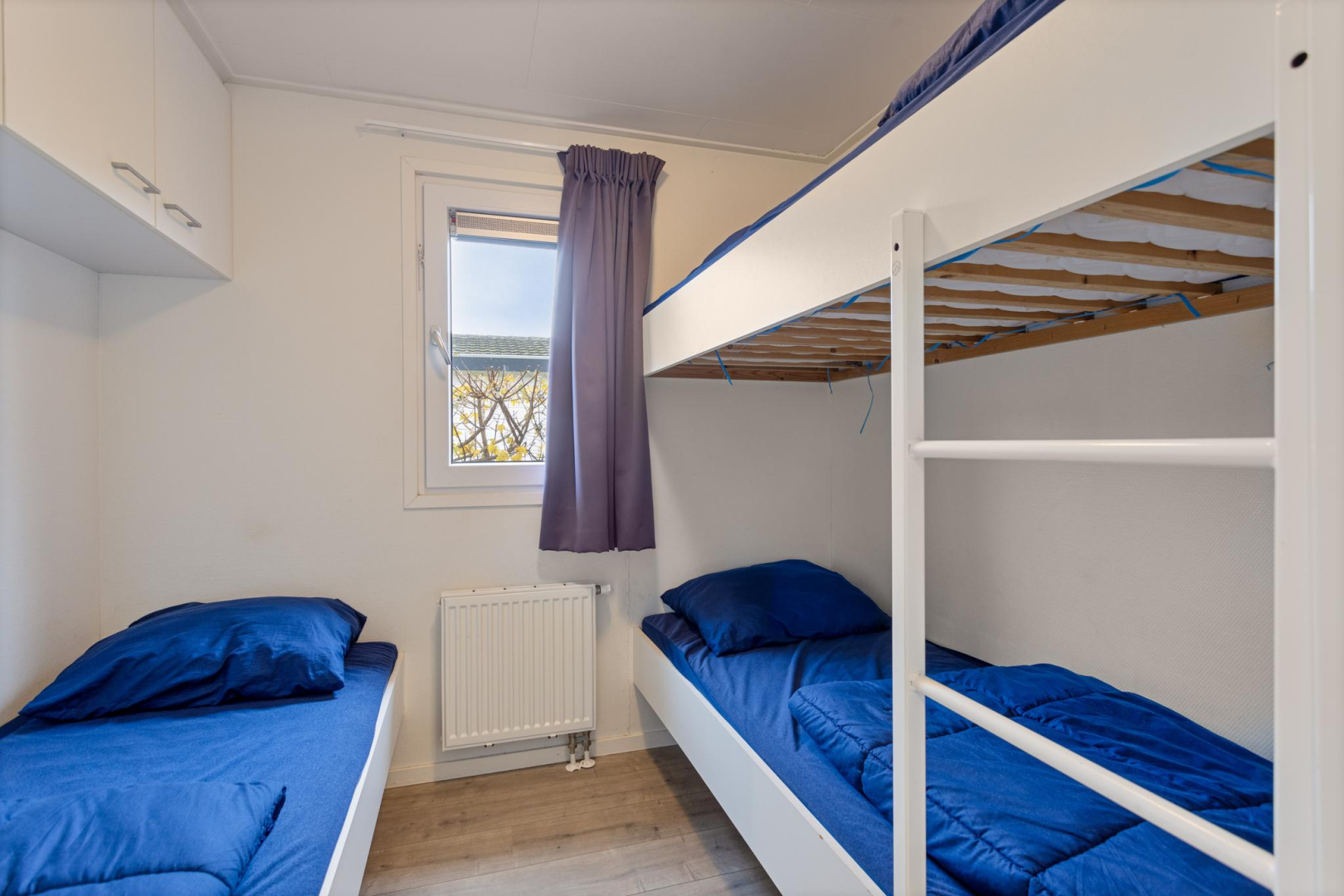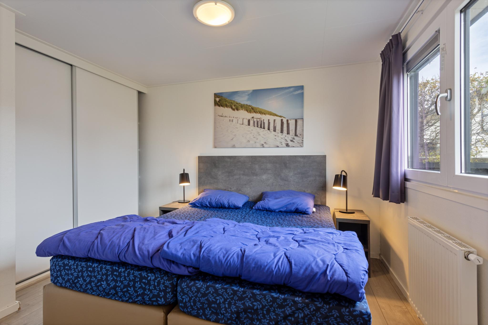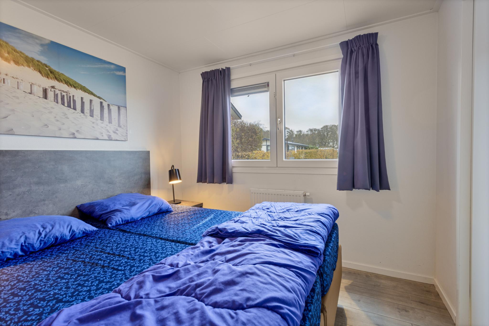 Entree, hal met aan de rechterzijde de hoofdslaapkamer met vaste kastenwand. De badkamer is voorzien van een toilet, wastafelmeubel, spiegelkast en douche. De 2e slaapkamer is ruim waardoor er plaats is voor een stapelbed en een 3e bed welke tegen de andere wand is geplaatst. De ruime woonkamer is heerlijk licht door de openslaande deuren naar het terras. Open keuken in een rechte opstelling met diverse inbouwapparatuur zoals, 4-pits gaskookplaat, oven en koelkast met vriesvak. Tevens bevindt in één van de keukenkasten de opstelplaats van de CV ketel. De woonkamer en slaapkamers zijn voorzien van een laminaatvloer.