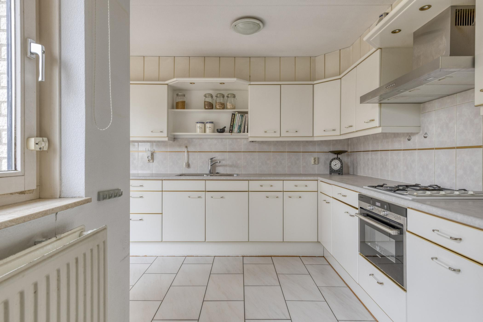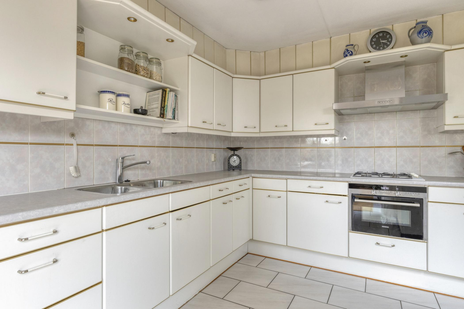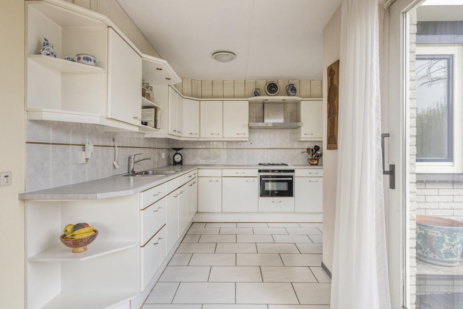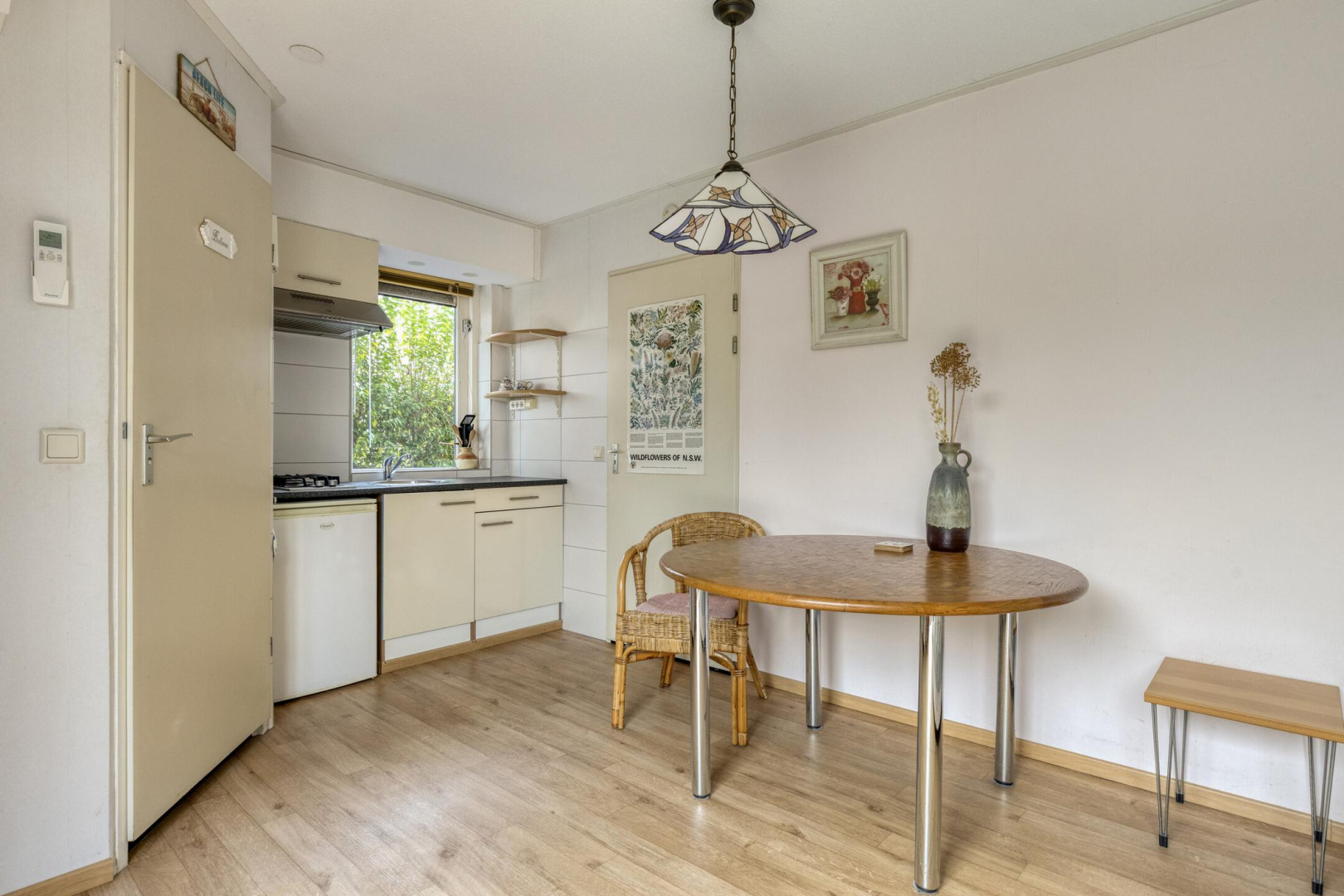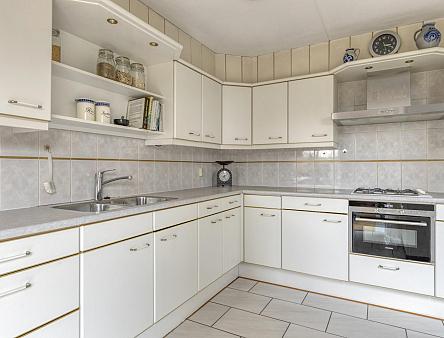 De woonkamer loopt vloeiend over in het eetgedeelte, een fijne plek voor het ontvangen van familie en vrienden. De schuifpui zorgt voor veel licht en een directe verbinding met buiten, terwijl de ruimte volop mogelijkheden biedt voor lange diners en waardevolle momenten samen. De keuken is uitgevoerd in een praktische L-opstelling en voorzien van een 4-pits gasfornuis met afzuigkap, koelkast, vriezer en een wasbak. Dankzij de functionele indeling en het ruime werkblad is de keuken prettig in gebruik en biedt voldoende opberg- en werkruimte.