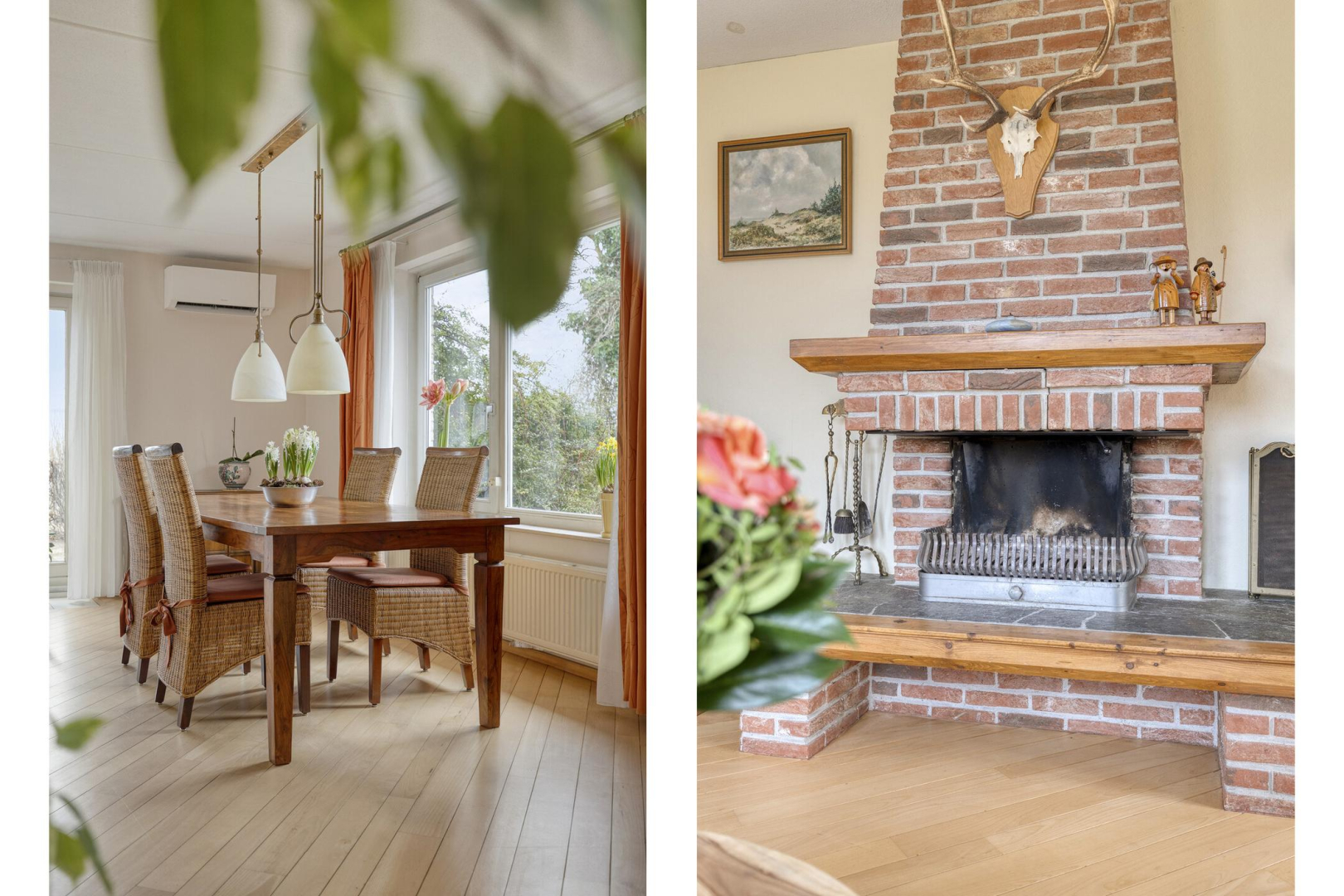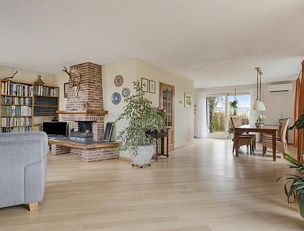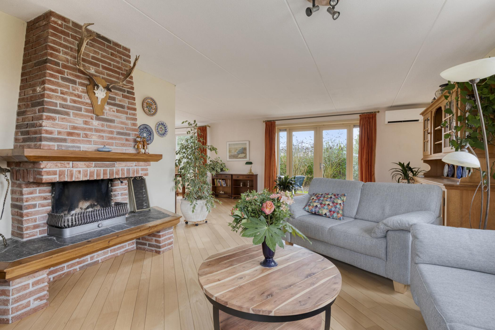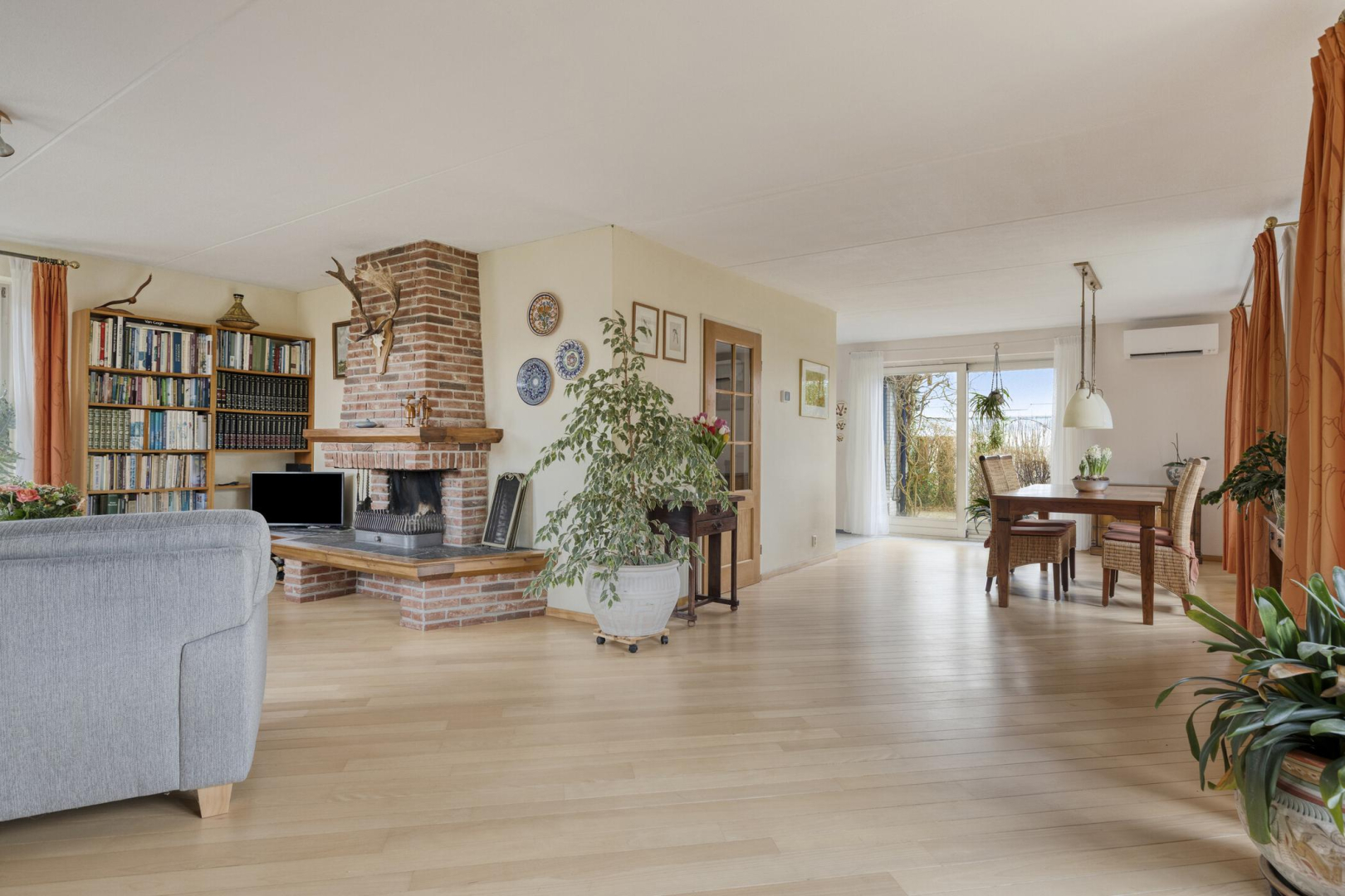 Via de voordeur betreedt u de hal met meterkast en een toiletruimte met fonteintje. Vanuit de hal heeft u toegang tot de trap naar de eerste verdieping en de royale woonkamer. De royale woonkamer vormt het hart van de woning en wordt gekenmerkt door een prettige lichtinval en een open indeling. De sfeervolle open haard en de houten vloer zorgen voor een warme, huiselijke uitstraling. Grote raampartijen en openslaande deuren verbinden binnen moeiteloos met buiten.