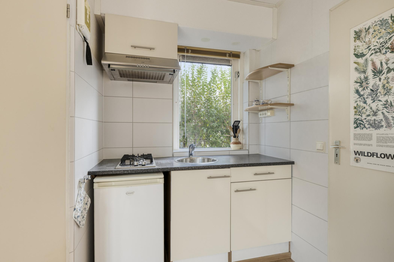 De kamer is voorzien van een compacte keukenopstelling met kookgelegenheid, wasbak en koelkast, ideaal voor een zelfstandig verblijf. Daarnaast beschikt de B&B over een eigen badkamer met douche, toilet en wastafel.