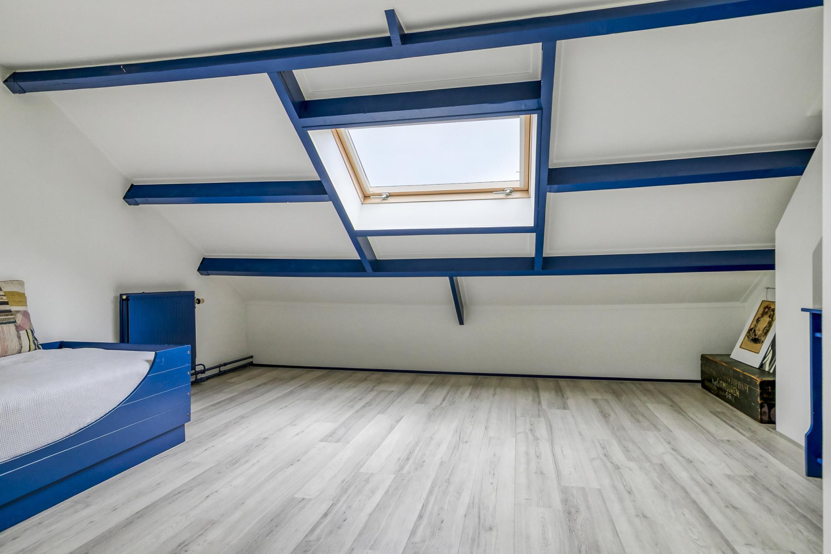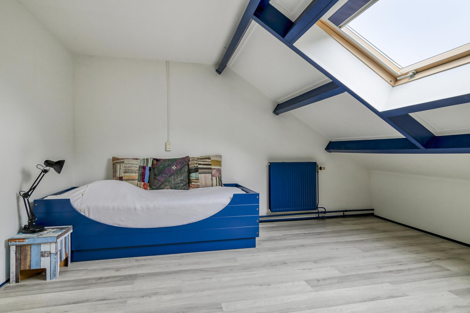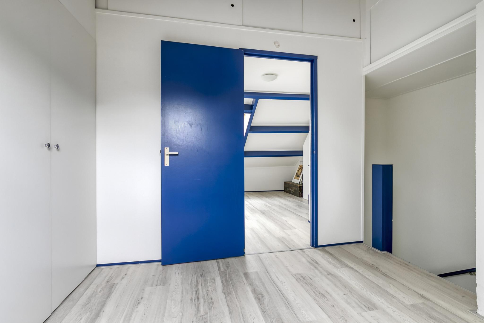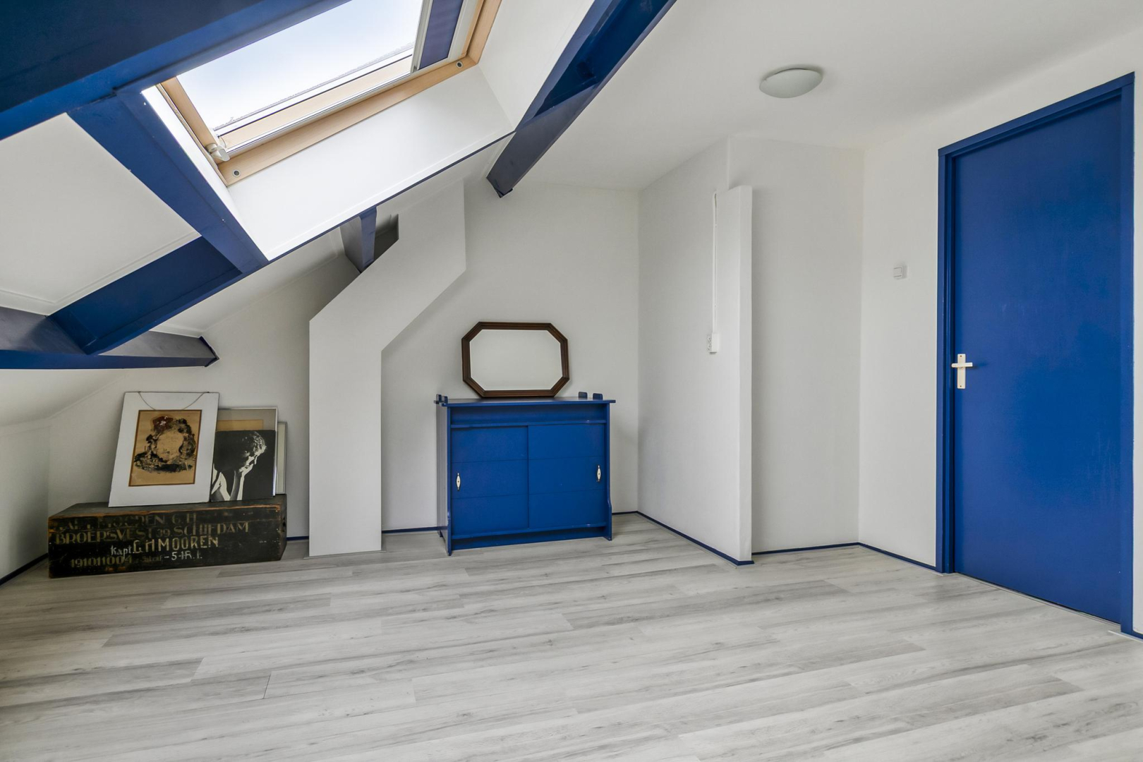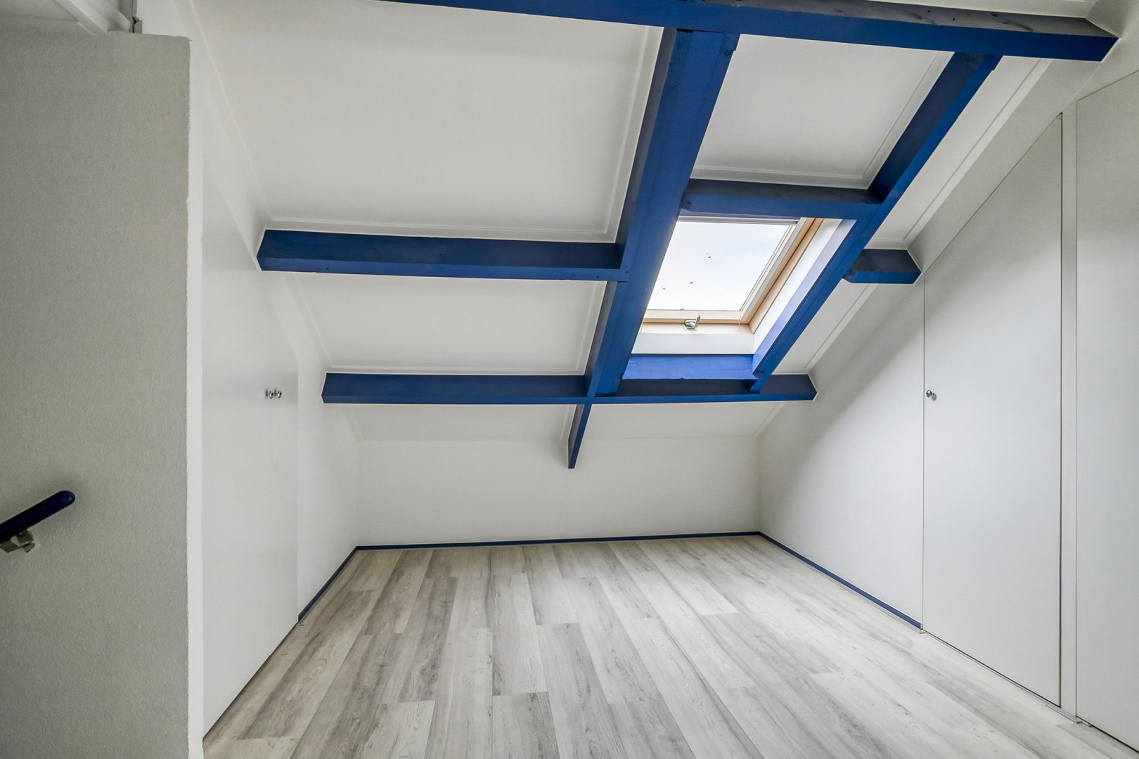 Overloop met dakraam en slim ingebouwde kasten, die zorgen voor extra opbergruimte. De wasmachine, droger, cv-ketel en omvormer voor de zonnepanelen zijn keurig weggewerkt in een inbouwkast, wat zorgt voor een strak en opgeruimd geheel. Grote separate slaapkamer voorzien van een dakraam.