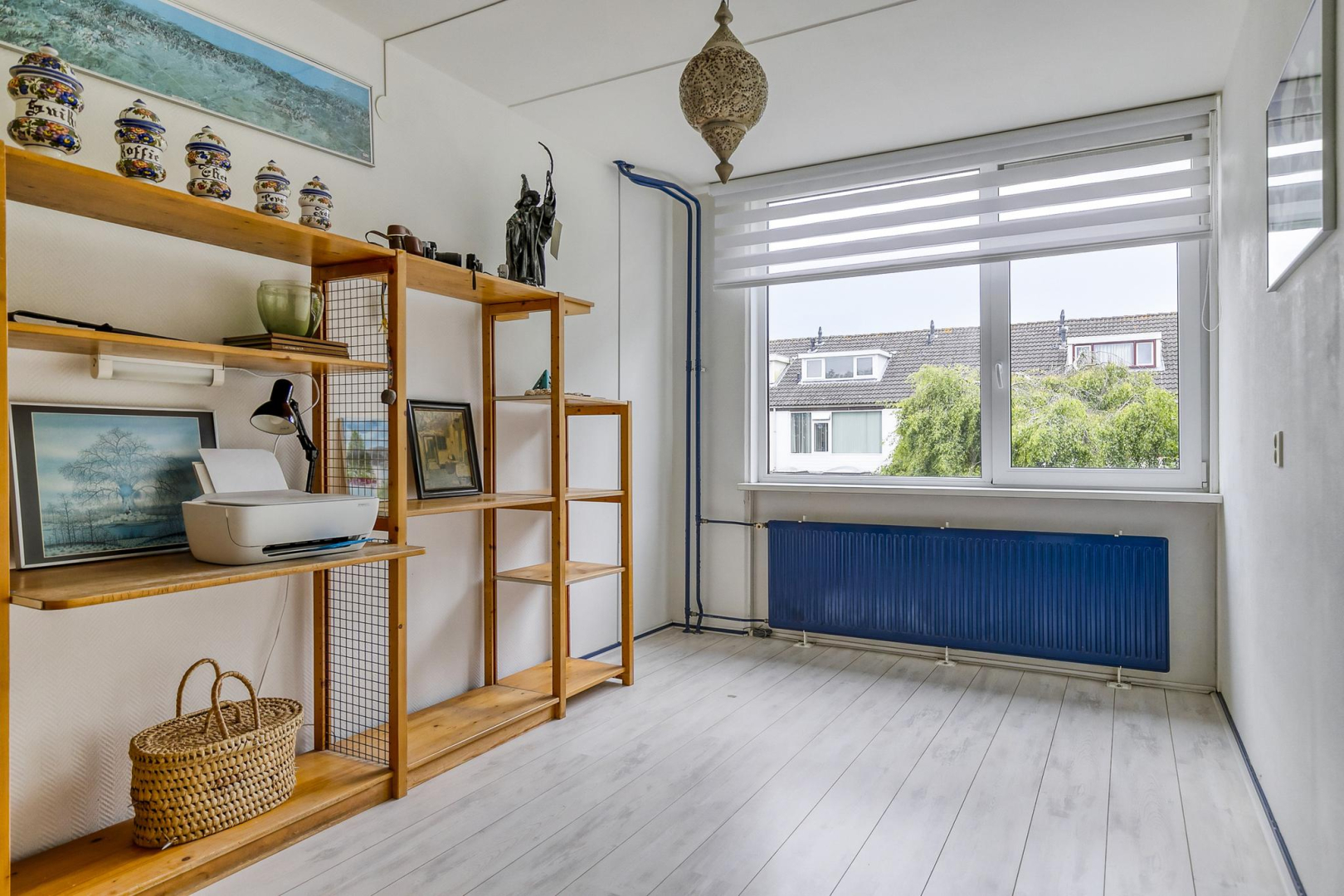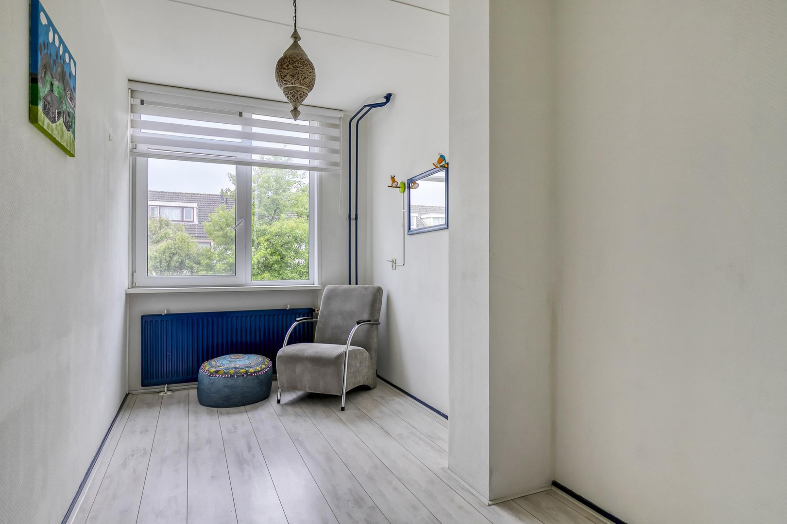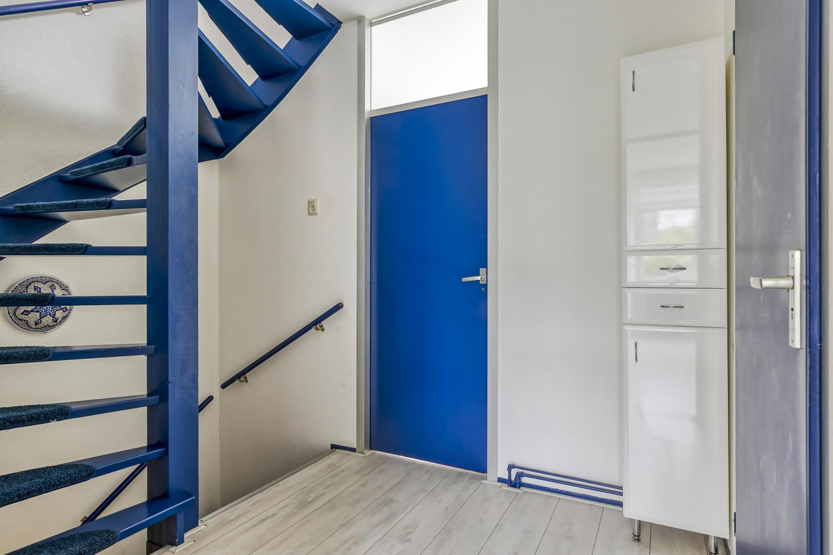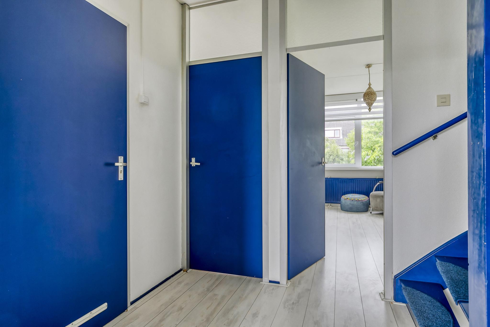 Overloop met dakraam en slim ingebouwde kasten, die zorgen voor extra opbergruimte. De wasmachine, droger, cv-ketel en omvormer voor de zonnepanelen zijn keurig weggewerkt in een inbouwkast, wat zorgt voor een strak en opgeruimd geheel. Grote separate slaapkamer voorzien van een dakraam.