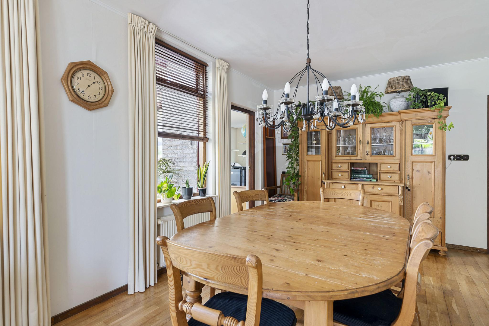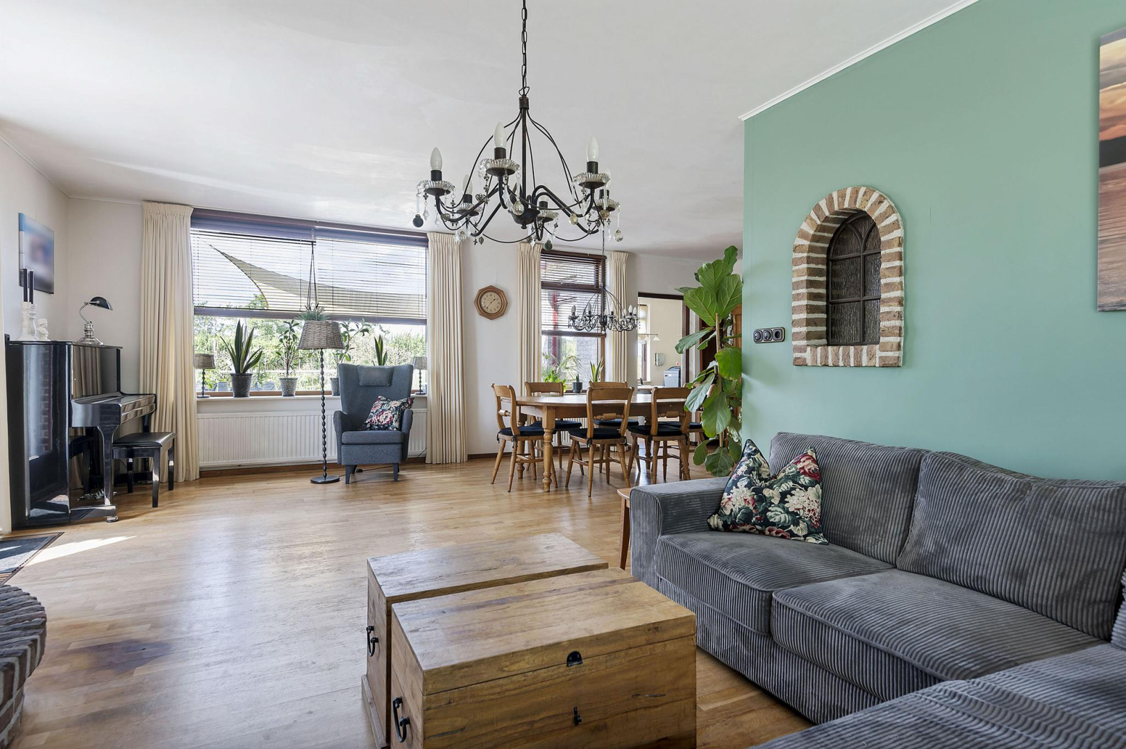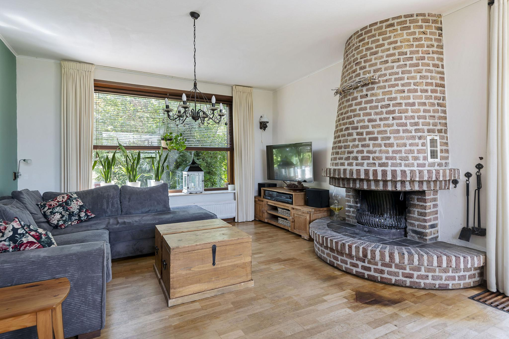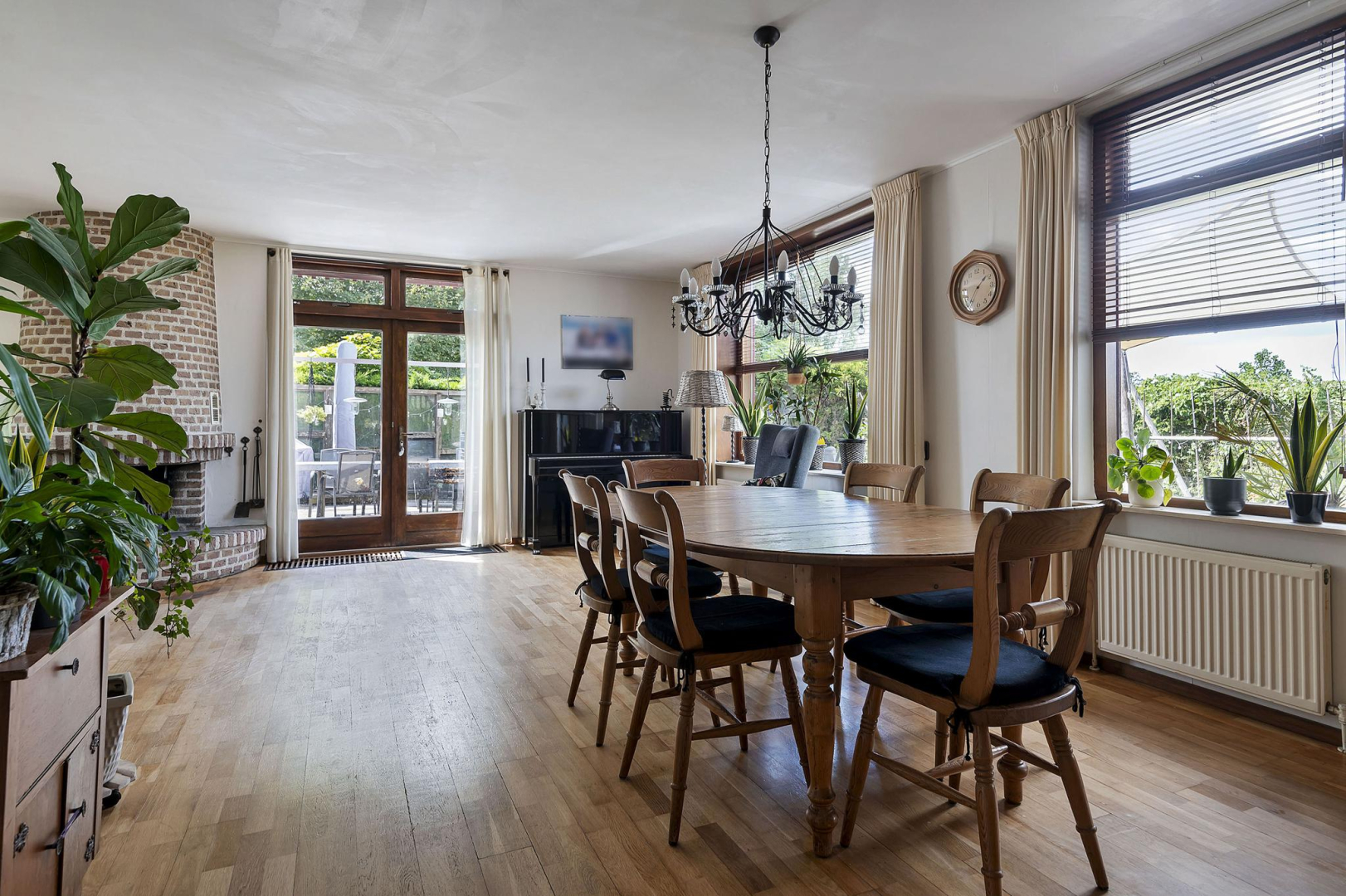 Vanuit de hal is de sfeervolle, L-vormige woonkamer bereikbaar met fraai gemetselde open haard, stalraam, eiken parketvloer en openslaande deuren naar de zijtuin met ruim zonneterras gelegen op het zuid-westen. Door de vele raampartijen is de woonkamer heerlijk licht.