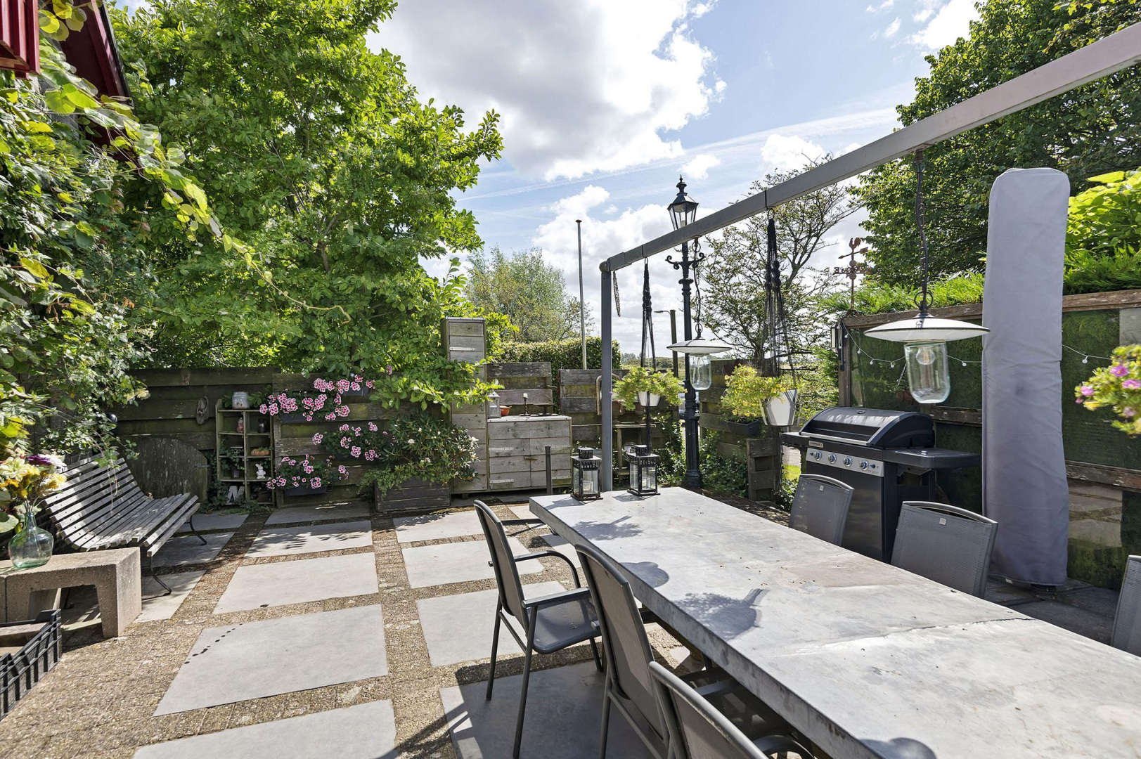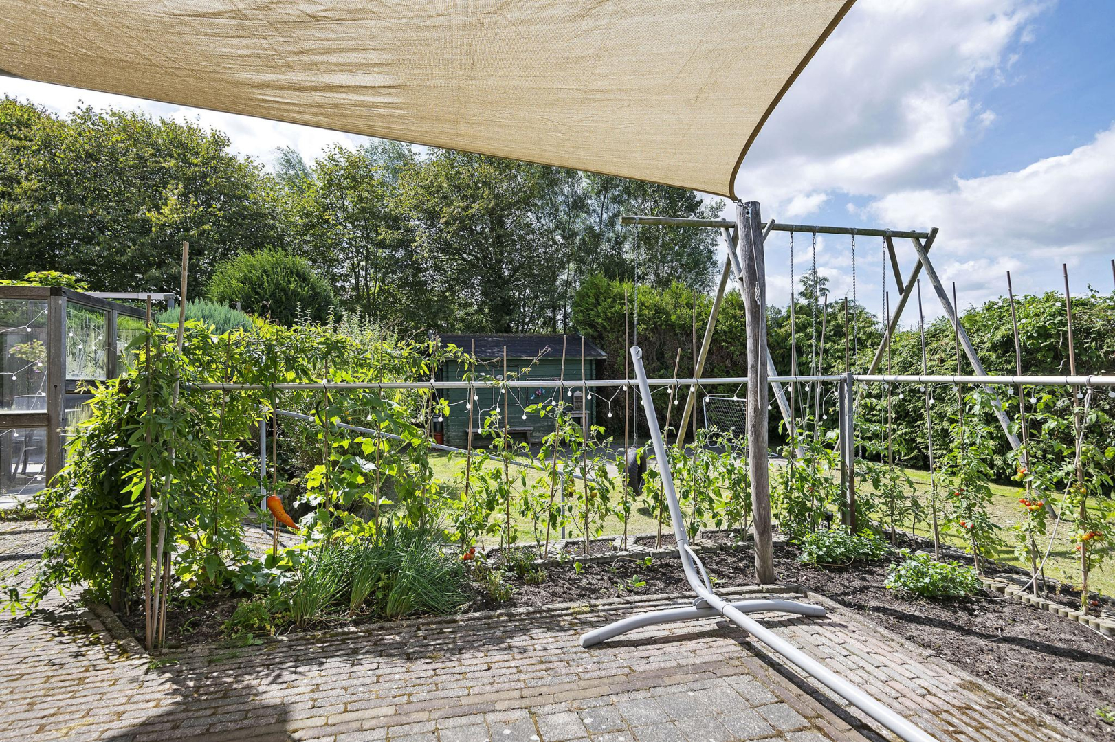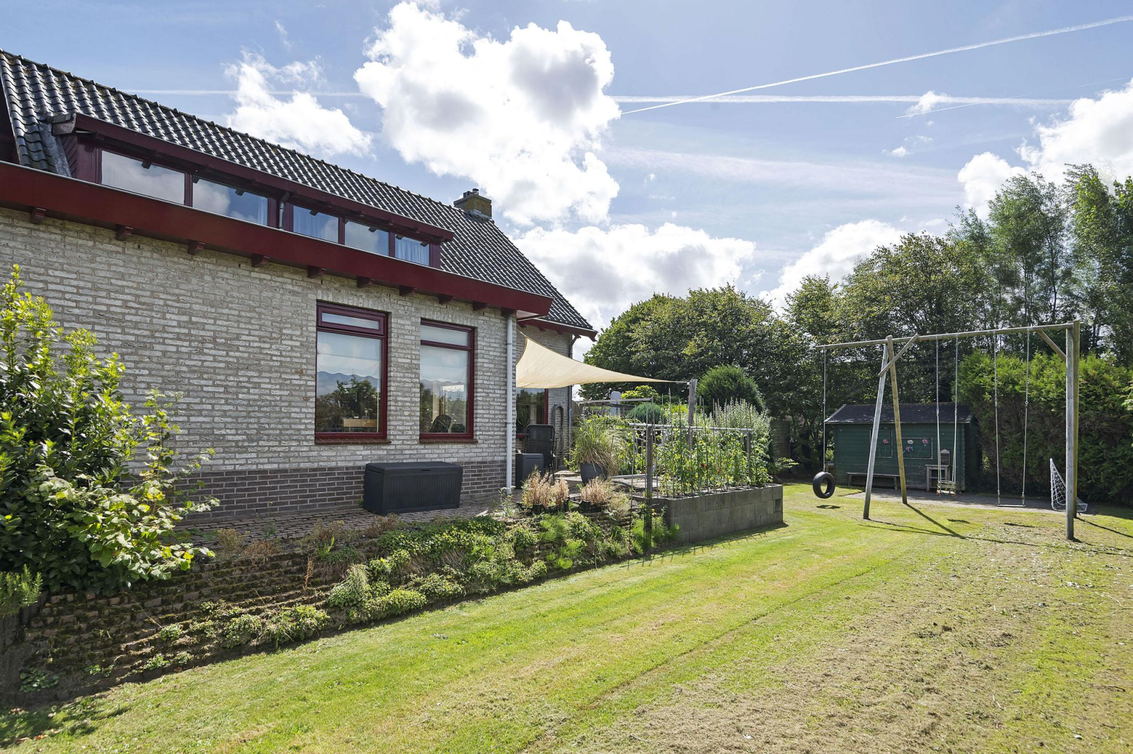 Via een trapje vanaf het zonneterras is de achtertuin te bereiken met ruim grasveld, speelruimte voor de kinderen en een ruime houten berging. Ook hier bevindt zich een betegeld zonneterras met heerlijk uitzicht op de tuin, gelegen op het zuidwesten waar men tot ’s-avonds kan genieten van de zon. Achter de tuin, bereikbaar via het pad langs de loods, bevindt zich een perceel grasland wat zich uitstrekt tot aan de sloot.