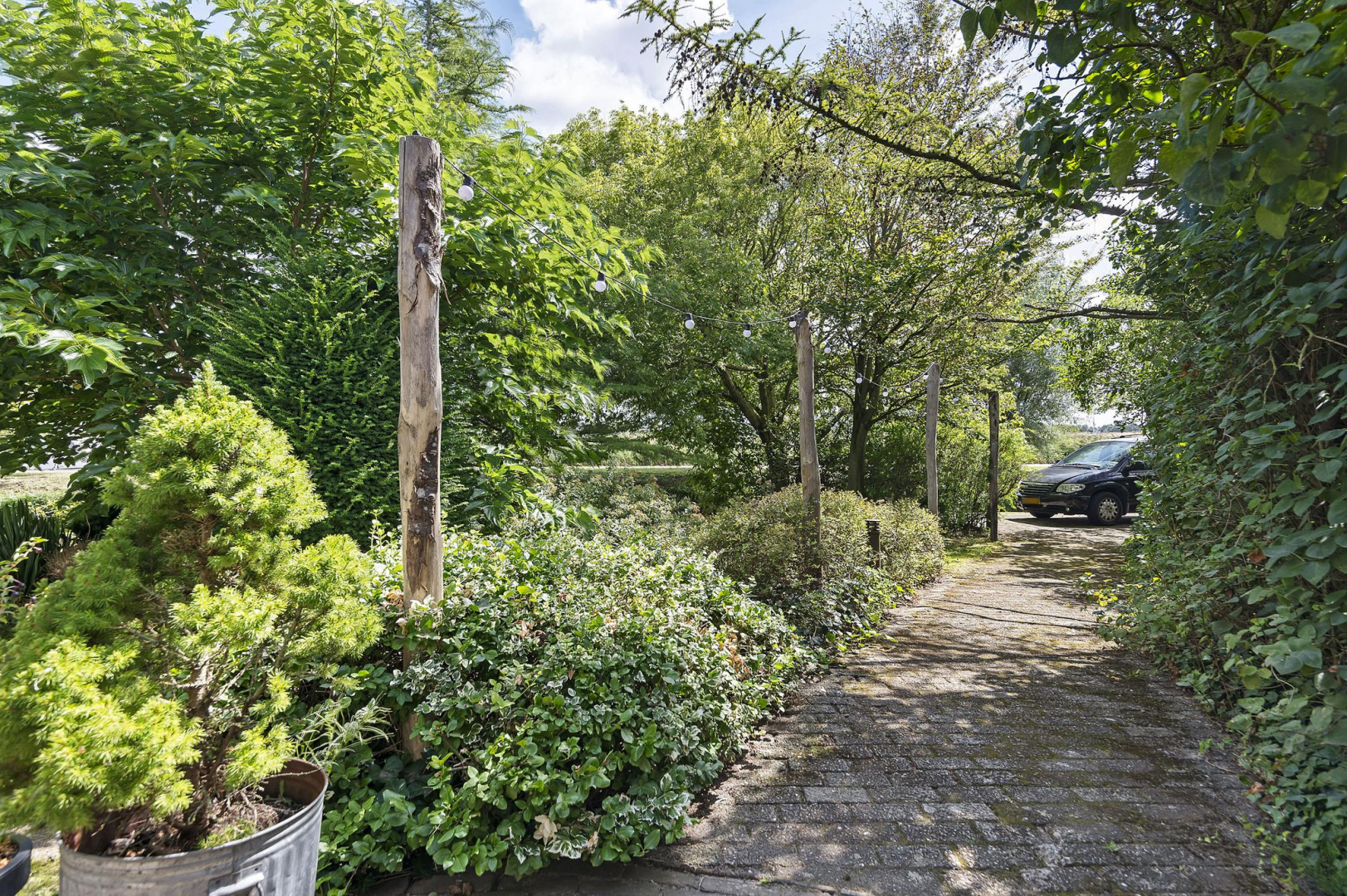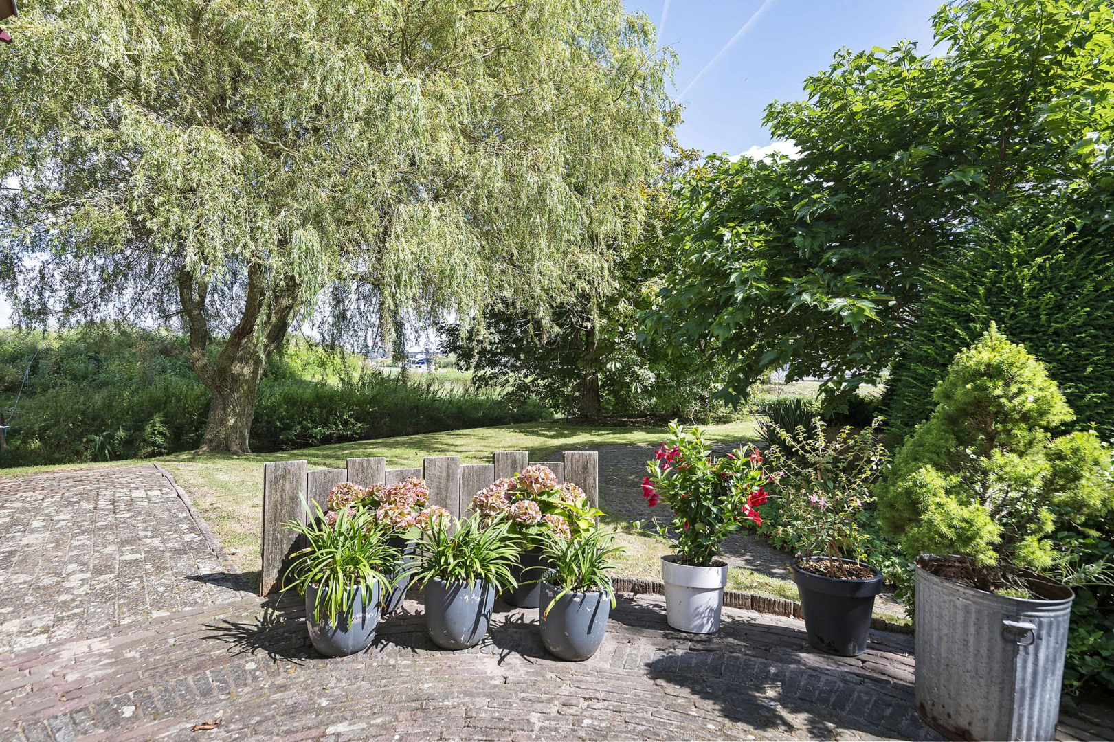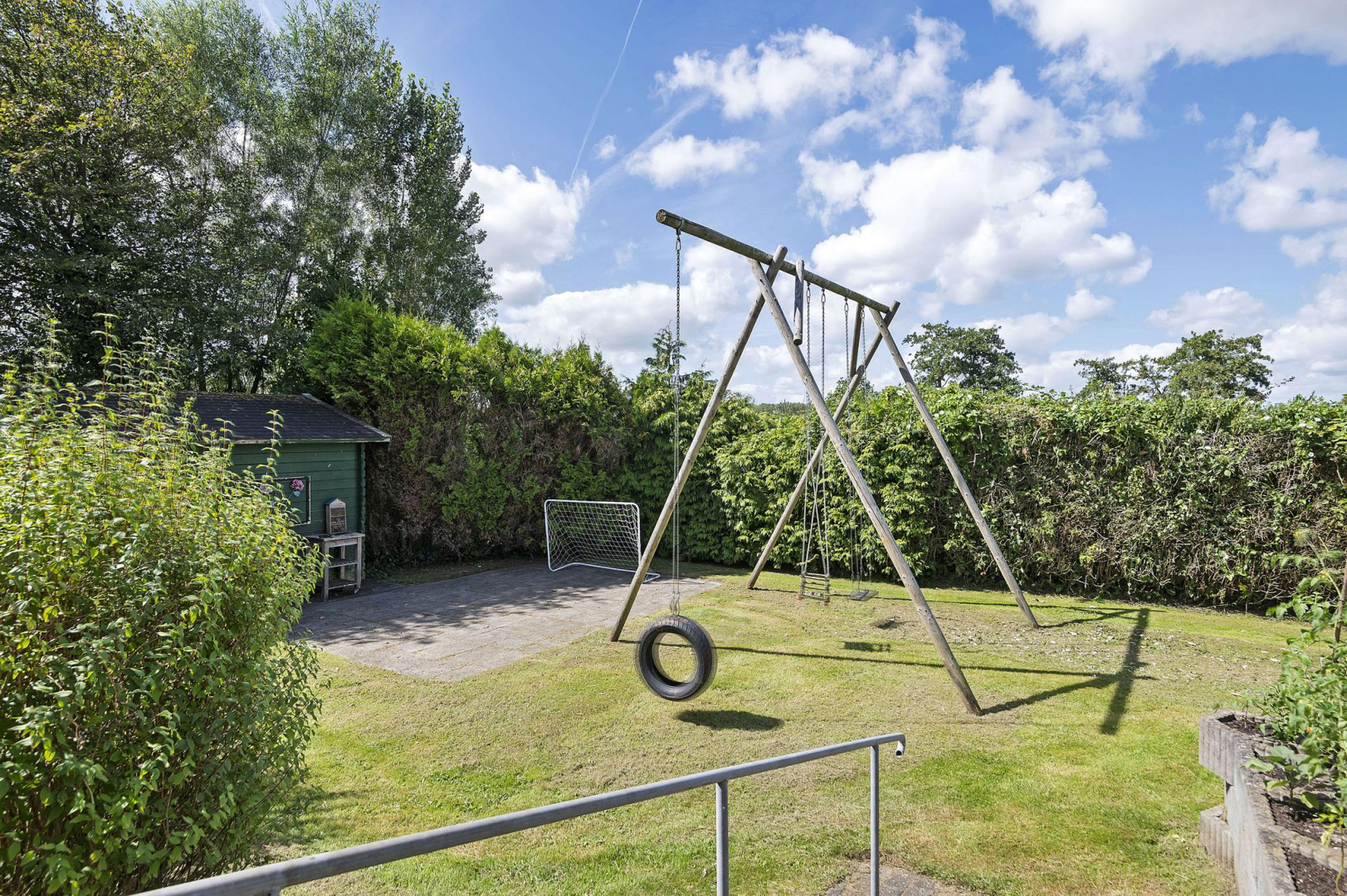 Via een trapje vanaf het zonneterras is de achtertuin te bereiken met ruim grasveld, speelruimte voor de kinderen en een ruime houten berging. Ook hier bevindt zich een betegeld zonneterras met heerlijk uitzicht op de tuin, gelegen op het zuidwesten waar men tot ’s-avonds kan genieten van de zon. Achter de tuin, bereikbaar via het pad langs de loods, bevindt zich een perceel grasland wat zich uitstrekt tot aan de sloot.