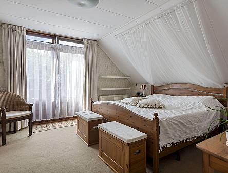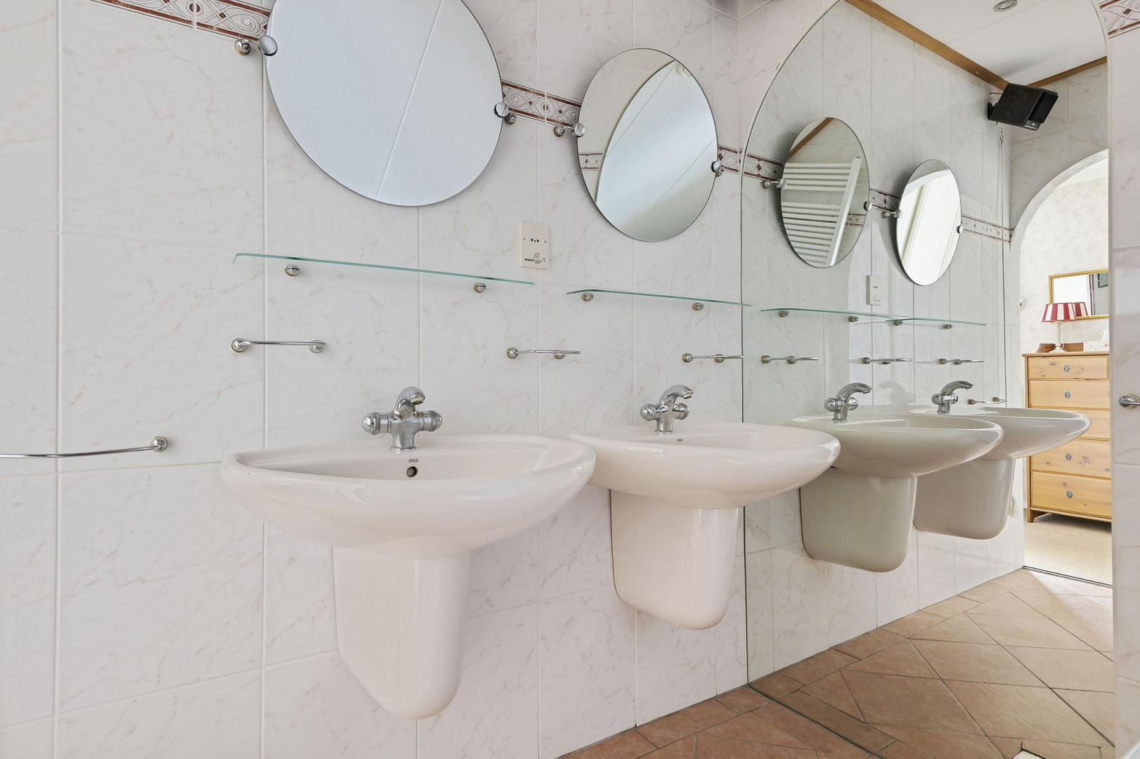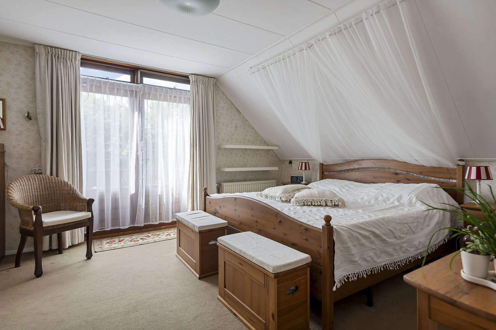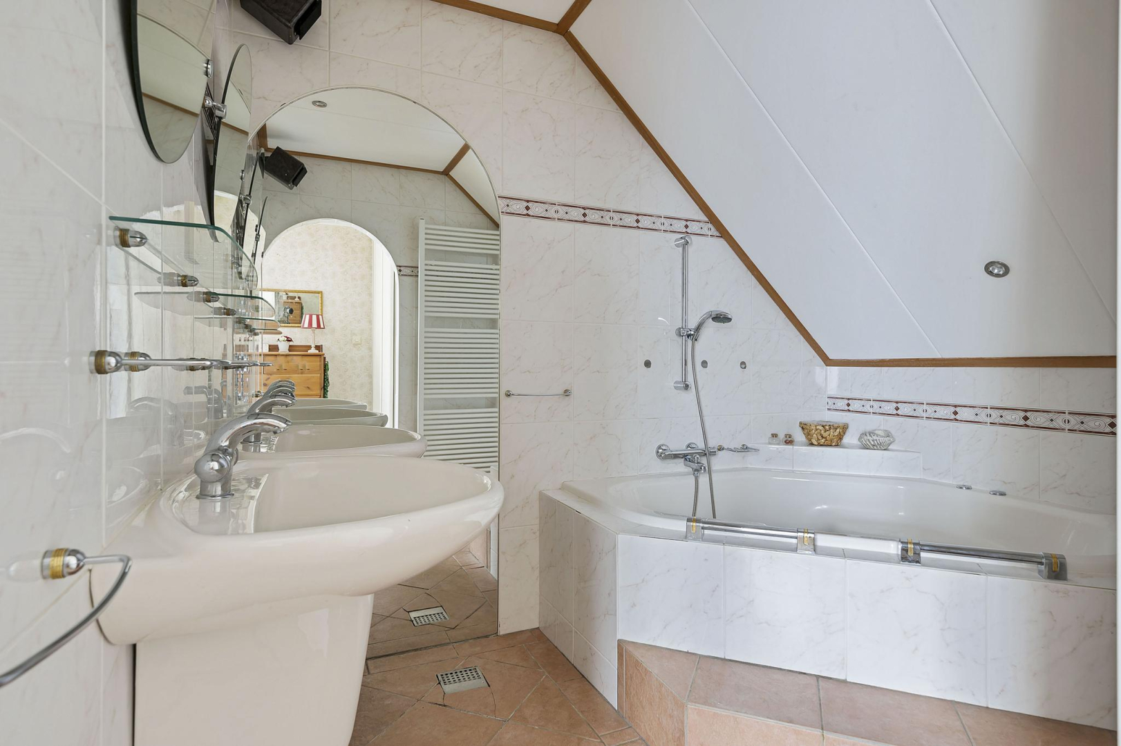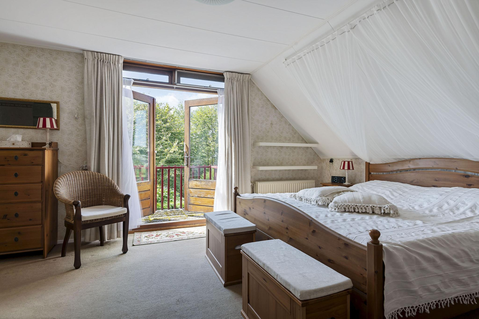 Overloop, ruime ouderslaapkamer met deur naar balkon en fraai uitzicht over de tuin en wijde omgeving. De slaapkamer beschikt over veel kastruimte en een inloopkast. Vanuit de slaapkamer is er toegang tot de ruime en suite badkamer met ligbad met jacuzzi, douche, dubbele wastafel en handdoekradiator. Op de overloop bevindt zich een apart toilet en 2e badkamer met douchecabine, wastafel en handdoekradiator. Aan de achterzijde bevinden zich 2 slaapkamers waarvan 1 met wastafel, en een 4e slaapkamer aan de zijkant van de woning eveneens met wastafel.