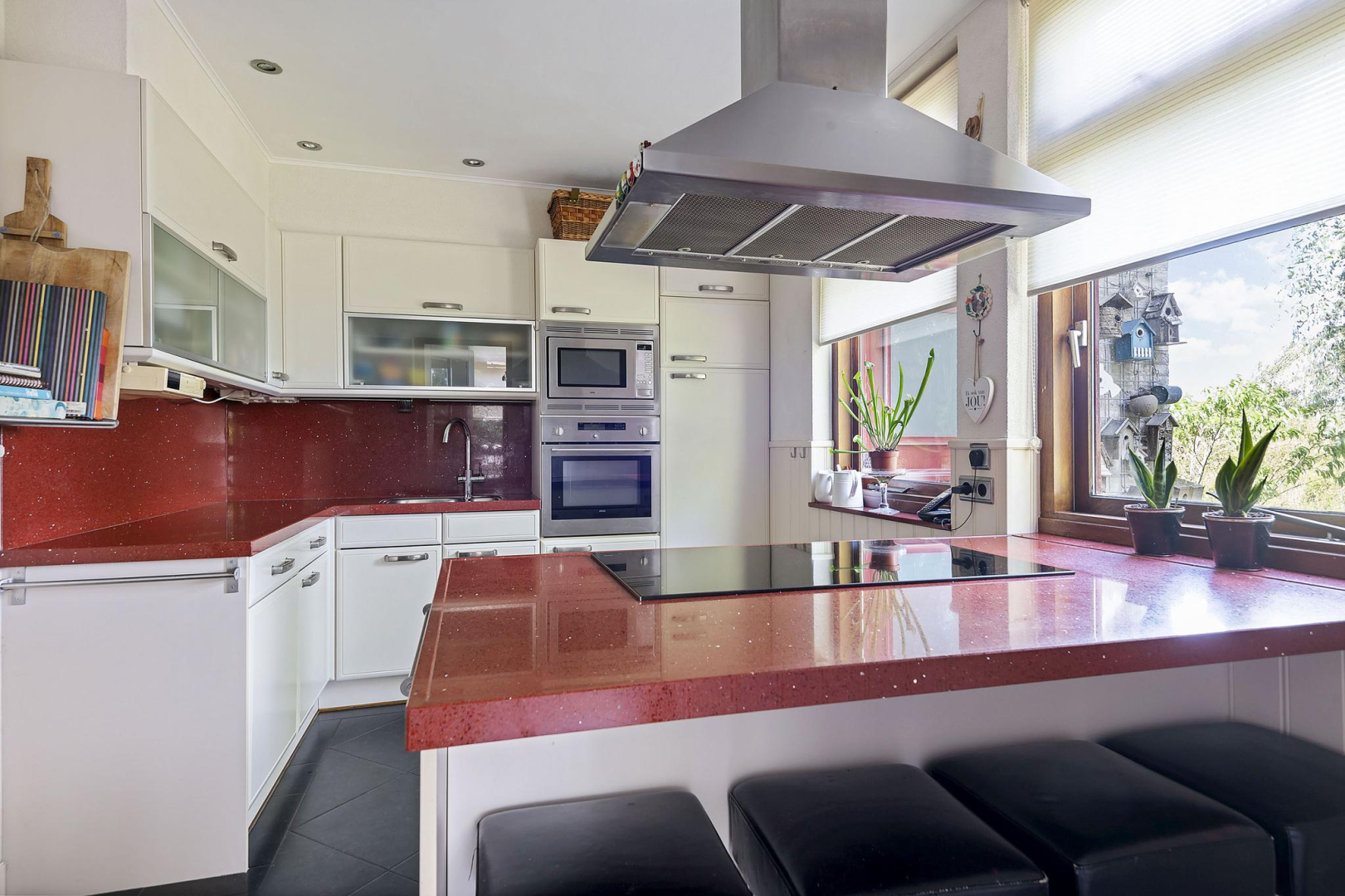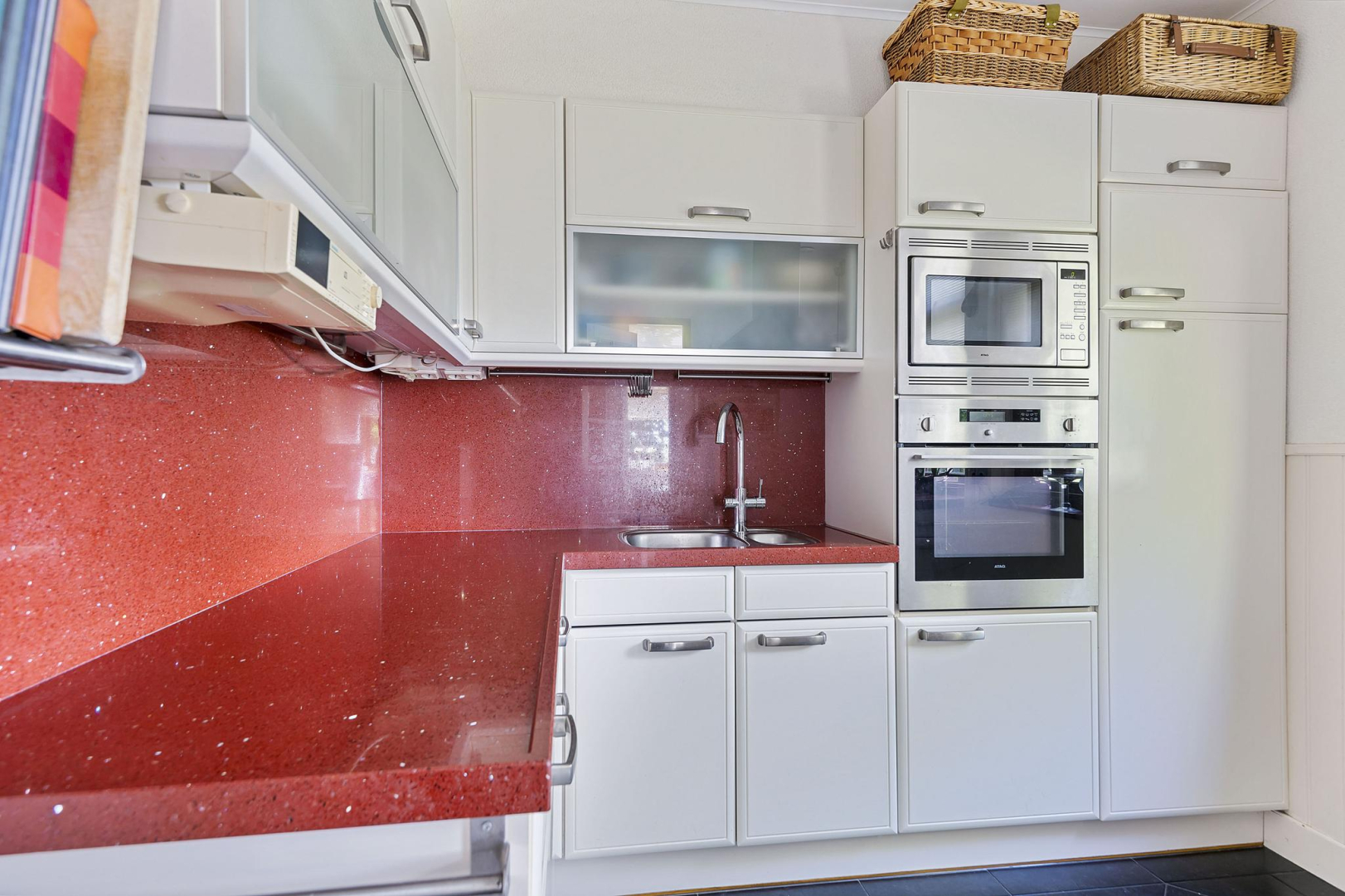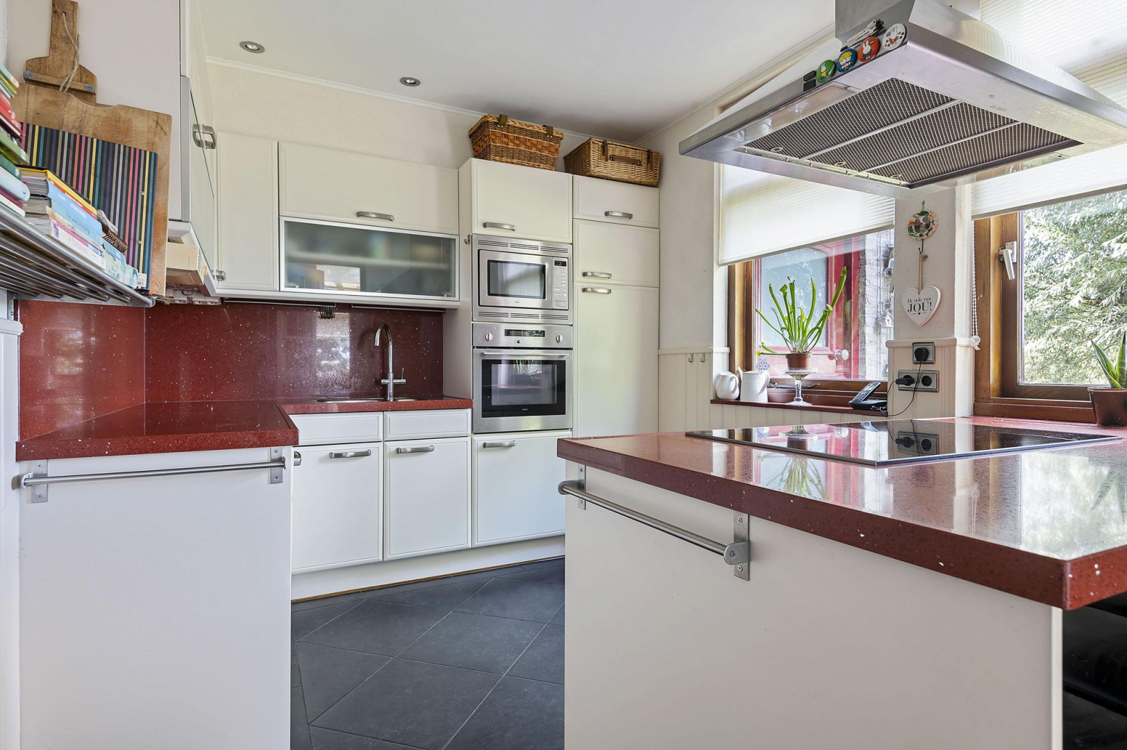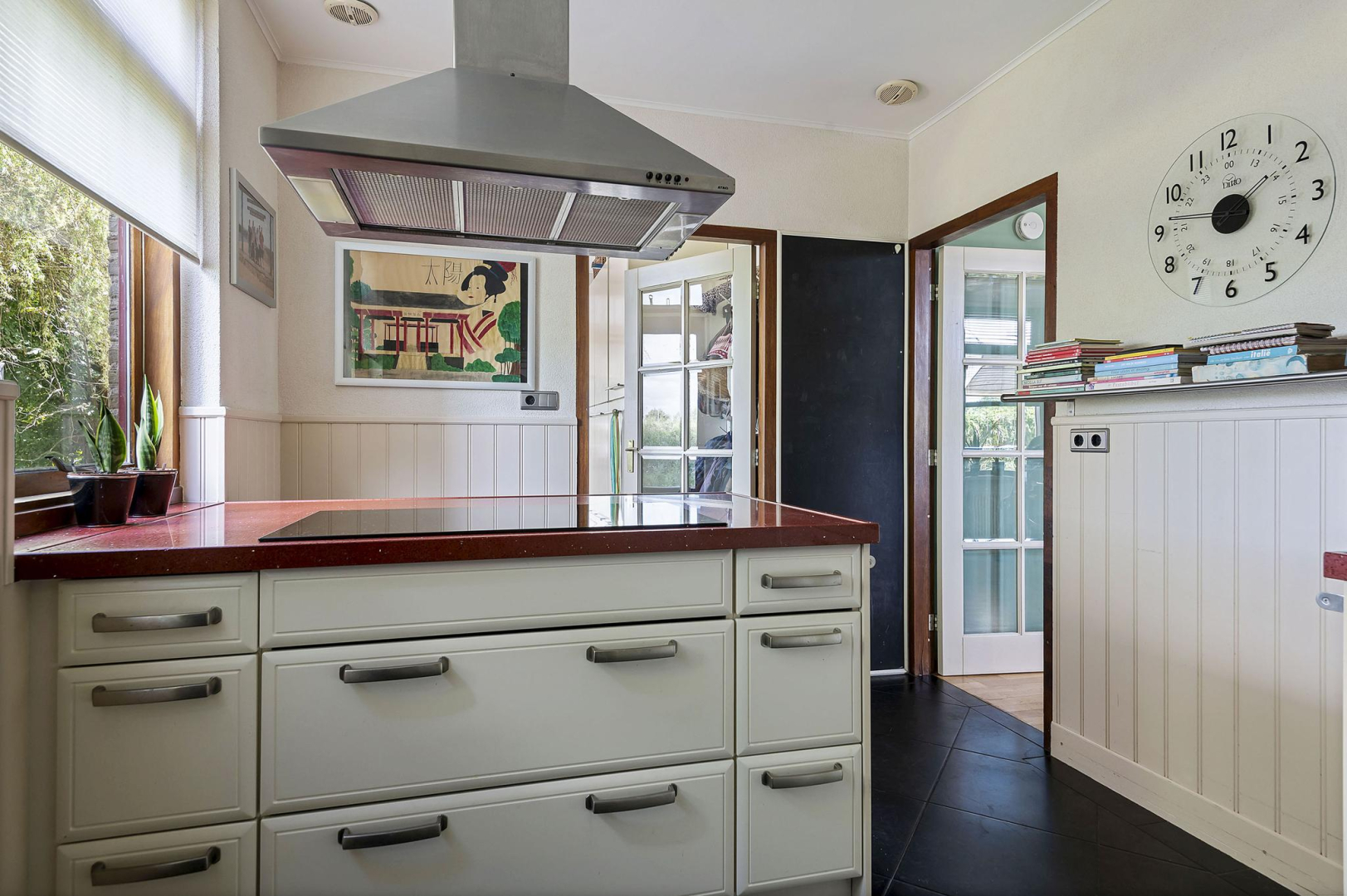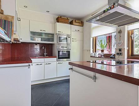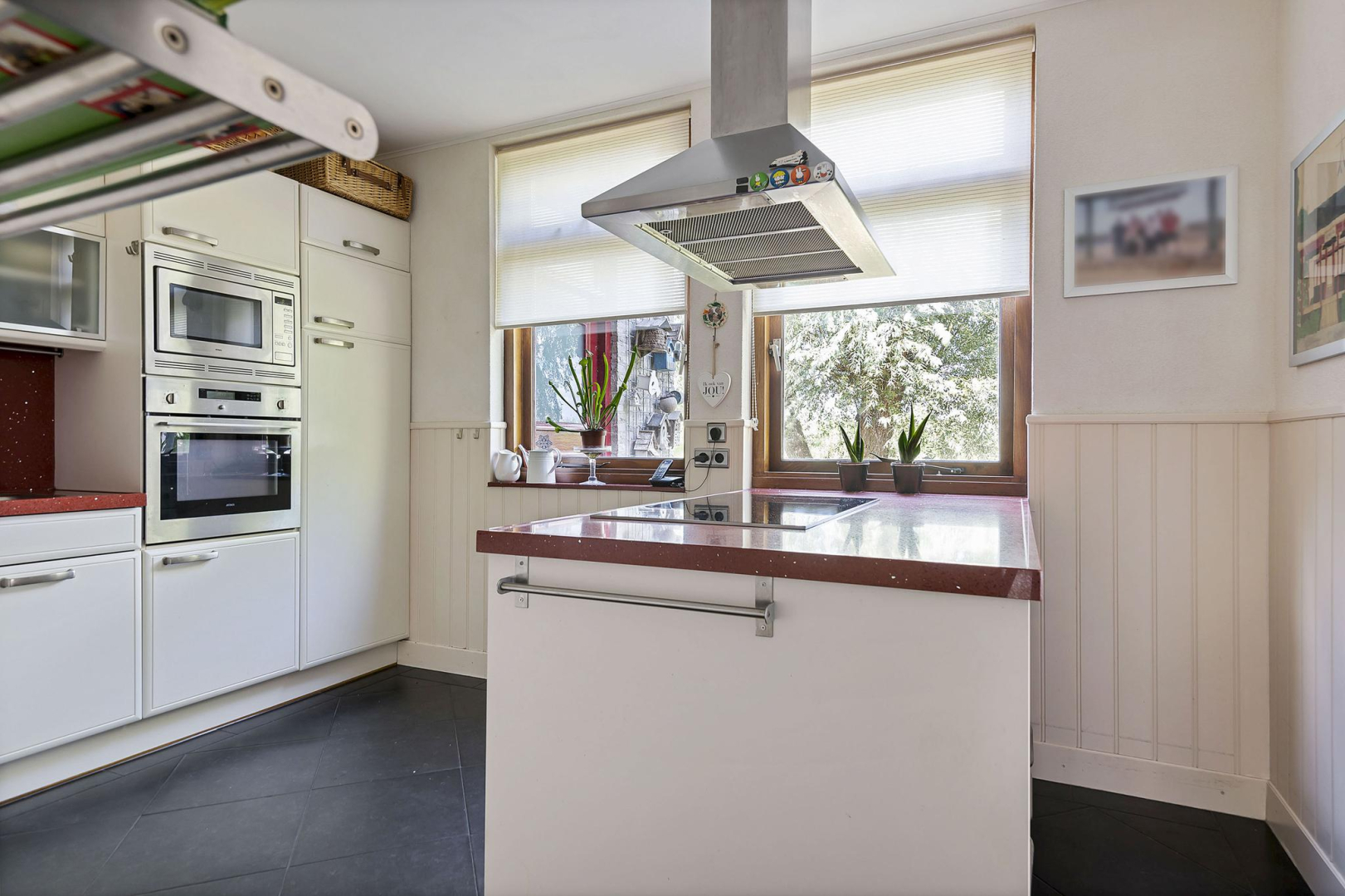Vanuit de woonkamer is de dichte keuken bereikbaar. De keuken is voorzien van een kookeiland met 6-pits inductie kookplaat, eetbar en keukenblok in L-opstelling, beide met een fraai granieten blad. Voorts is de keuken voorzien van diverse inbouwapparatuur zoals: afzuigkap, vaatwasser, hete luchtoven, magnetron en koelkast met vriesvak. Zowel in de keuken als de bijkeuken ligt een plavuizen vloer met vloerverwarming. Beiden beschikken over veel bergruimte.