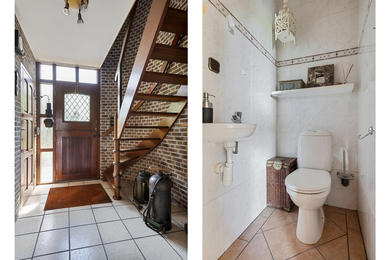 Ruime hal met plavuizen vloer, trapopgang, meterkast, garderobe, toiletruimte met toilet en fontein.