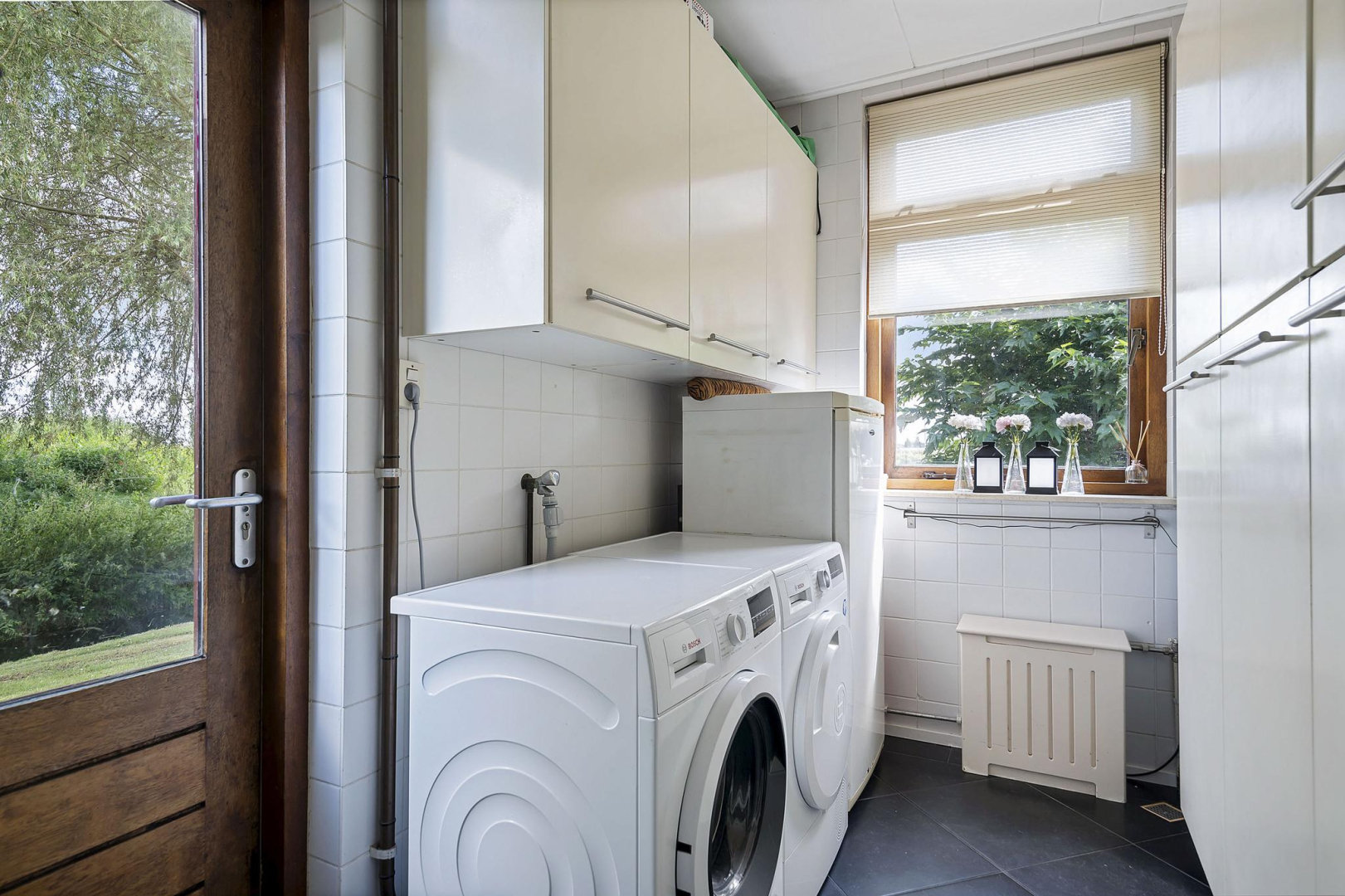 Aan de achterzijde van de keuken bevindt zich de bijkeuken met aansluiting voor de wasapparatuur en veel bergruimte. De bijkeuken heeft een deur naar buiten naar de zijkant van de woning.