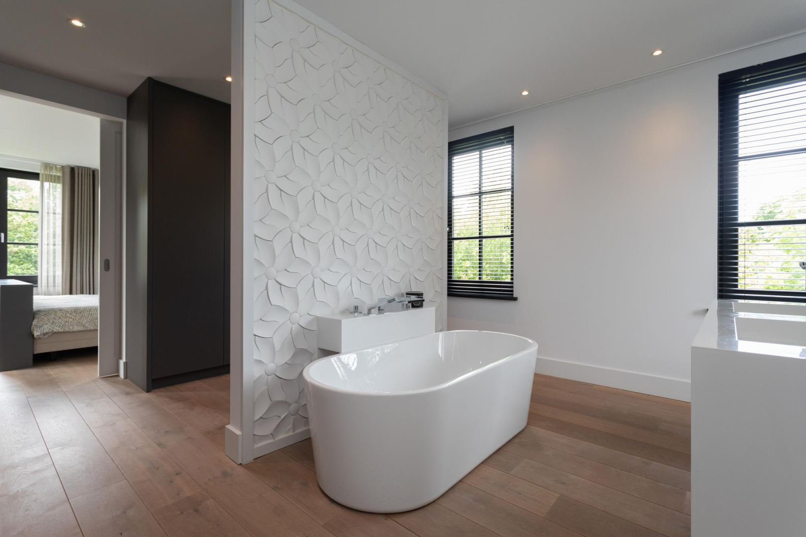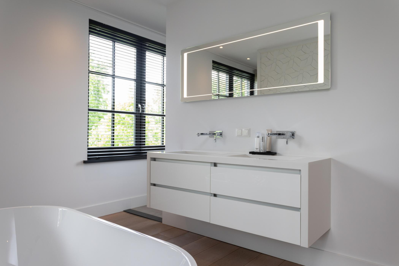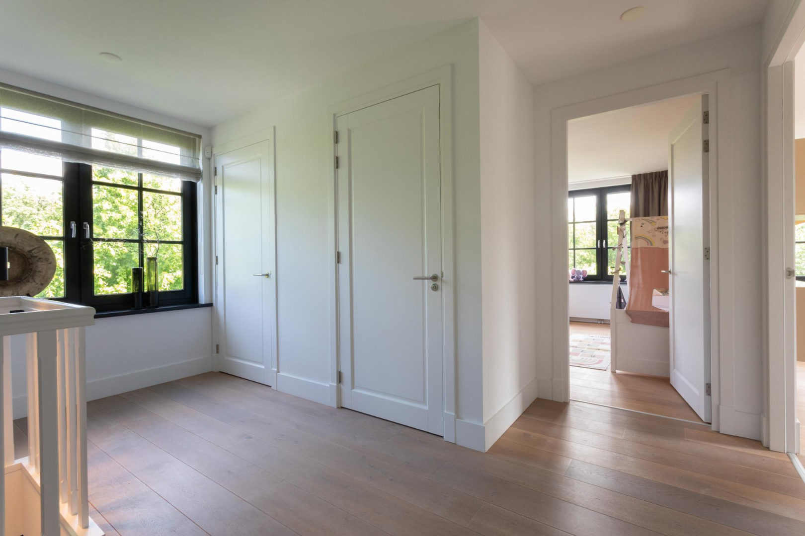 Via de stijlvolle trap bereikt u de eerste verdieping met een linnenkast, apart toilet, twee ruime slaapkamers, badkamer en de master bedroom met badkamer ensuite. De master bedroom is een luxe suite met eigen balkon en een schuifdeur naar de royale walk-in closet met op maat gemaakte kastenwanden en een luxe en-suite badkamer met vrijstaand ligbad, dubbele wastafel in meubel, inloopdouche met stort- en handdouche, wandcloset, designradiator en inbouwspots. Alle slaapkamers zijn uitgerust met een klimaatregeling (airconditioning die verwarmt en koelt), massief eiken vloerdelen, draai-kiepramen met roedeverdeling en glad gestucte plafonds. Een tweede, complete badkamer op deze verdieping is voorzien van een duo-ligbad, inloopdouche, dubbele wastafel in meubel en een designradiator. Op de overloop is nog een separaat toilet en een praktische bergkast aanwezig.