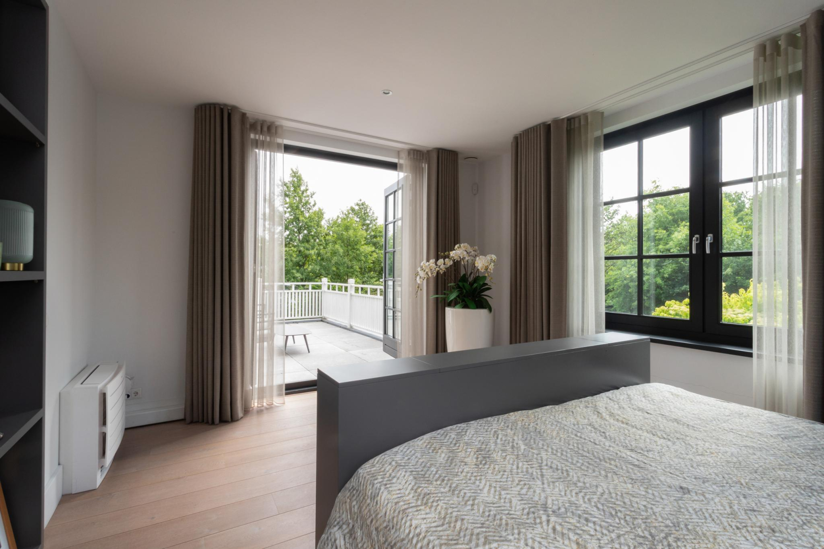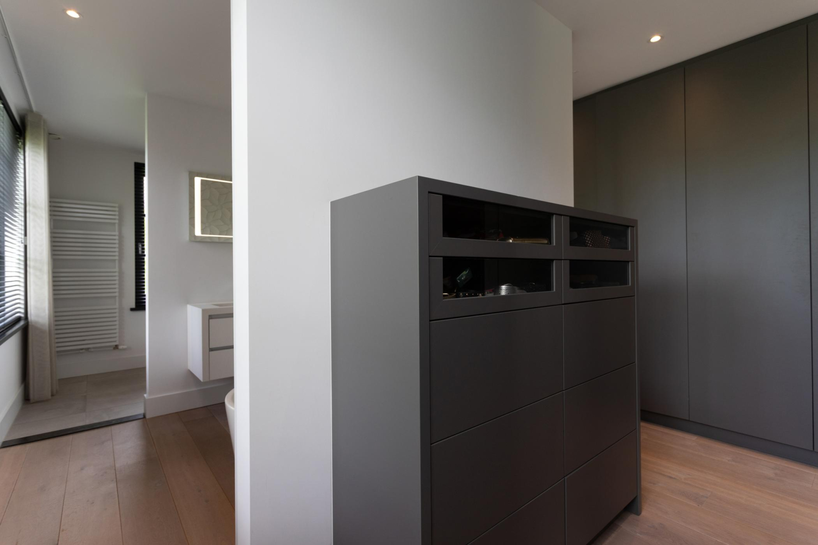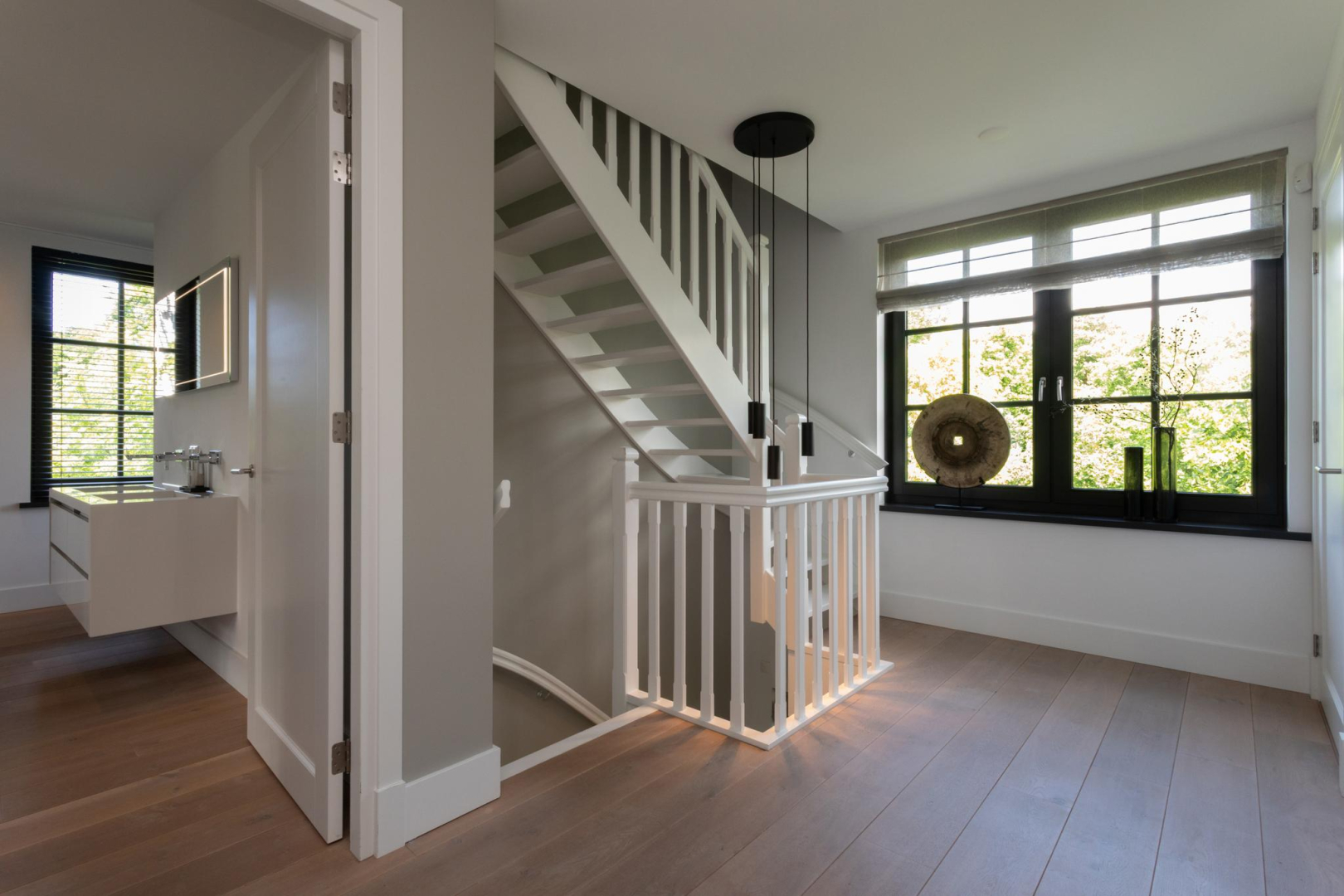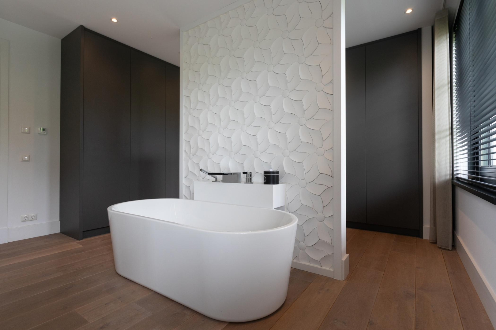 Via de stijlvolle trap bereikt u de eerste verdieping met een linnenkast, apart toilet, twee ruime slaapkamers, badkamer en de master bedroom met badkamer ensuite. De master bedroom is een luxe suite met eigen balkon en een schuifdeur naar de royale walk-in closet met op maat gemaakte kastenwanden en een luxe en-suite badkamer met vrijstaand ligbad, dubbele wastafel in meubel, inloopdouche met stort- en handdouche, wandcloset, designradiator en inbouwspots. Alle slaapkamers zijn uitgerust met een klimaatregeling (airconditioning die verwarmt en koelt), massief eiken vloerdelen, draai-kiepramen met roedeverdeling en glad gestucte plafonds. Een tweede, complete badkamer op deze verdieping is voorzien van een duo-ligbad, inloopdouche, dubbele wastafel in meubel en een designradiator. Op de overloop is nog een separaat toilet en een praktische bergkast aanwezig.