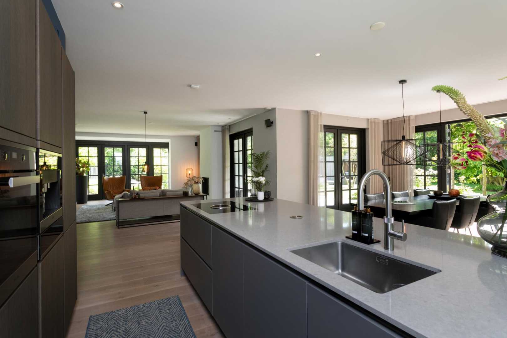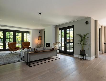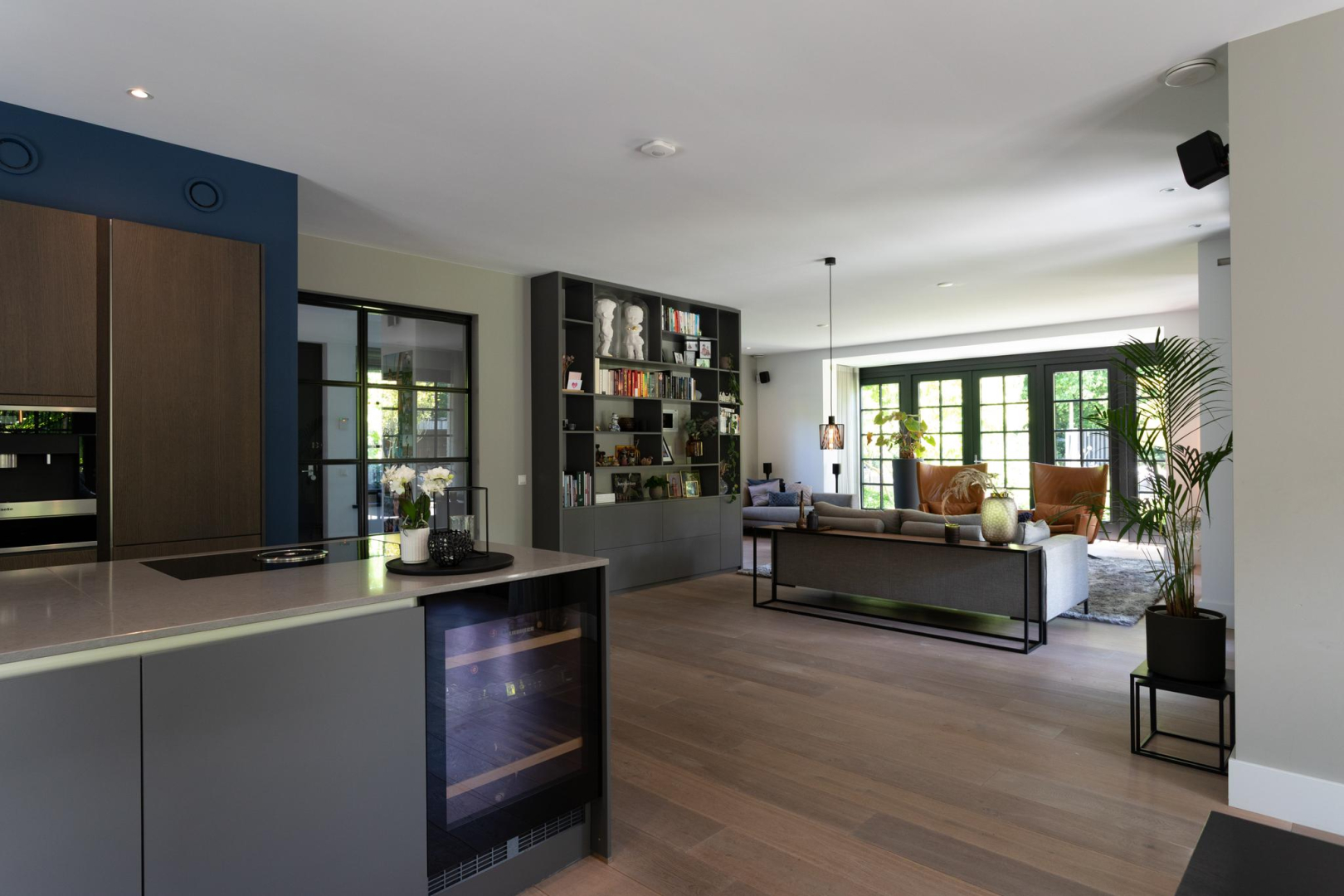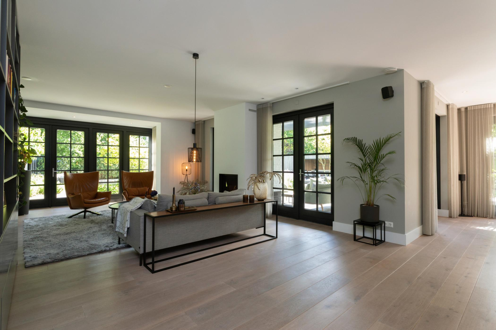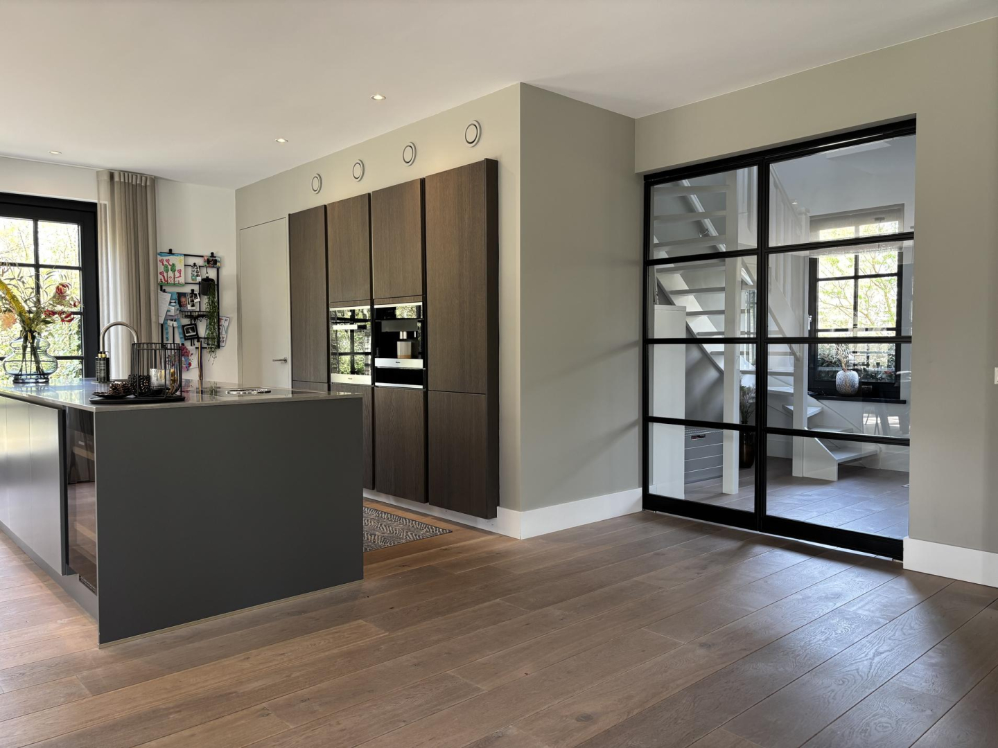 Bij binnenkomst wordt u verwelkomd in een ruime entree met stijlvolle garderobe, een maatwerkkast voor schoenen en een elegant toilet met wandcloset en fonteinmeubel. Dubbele stalen taatsdeuren geven toegang tot het hart van de woning: de indrukwekkende leefkeuken en de royale living. De zeer ruime woonkamer ademt sfeer en luxe, met een vast wandmeubel, aparte tv-hoek, voorzien van een surround audiosysteem, een charmante erker met openslaande deuren en rondom de living diverse dubbele deuren die zorgen voor een directe verbinding met de onder architectuur aangelegde tuin. Dankzij de hoge plafonds en de overvloed aan ramen geniet u van een zee aan licht. De royale leefruimte is uitgerust met een gecombineerde gashaard, terwijl u buiten, onder de veranda, sfeervol kunt genieten van de hout gestookte haard. De gehele begane grond is voorzien van eiken lamelparket en comfortabele vloerverwarming die tevens kan koelen – een genot in alle jaargetijden. De woning is uitgerust met een domotica systeem, waardoor verlichting, temperatuur en veiligheid eenvoudig te bedienen zijn en is naar wens uit te breiden.