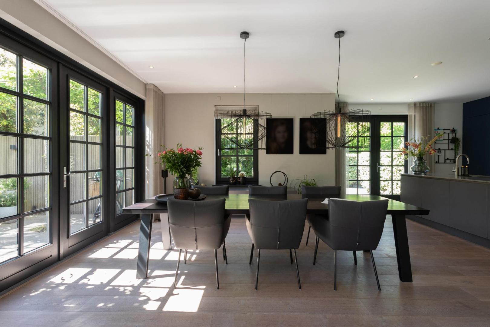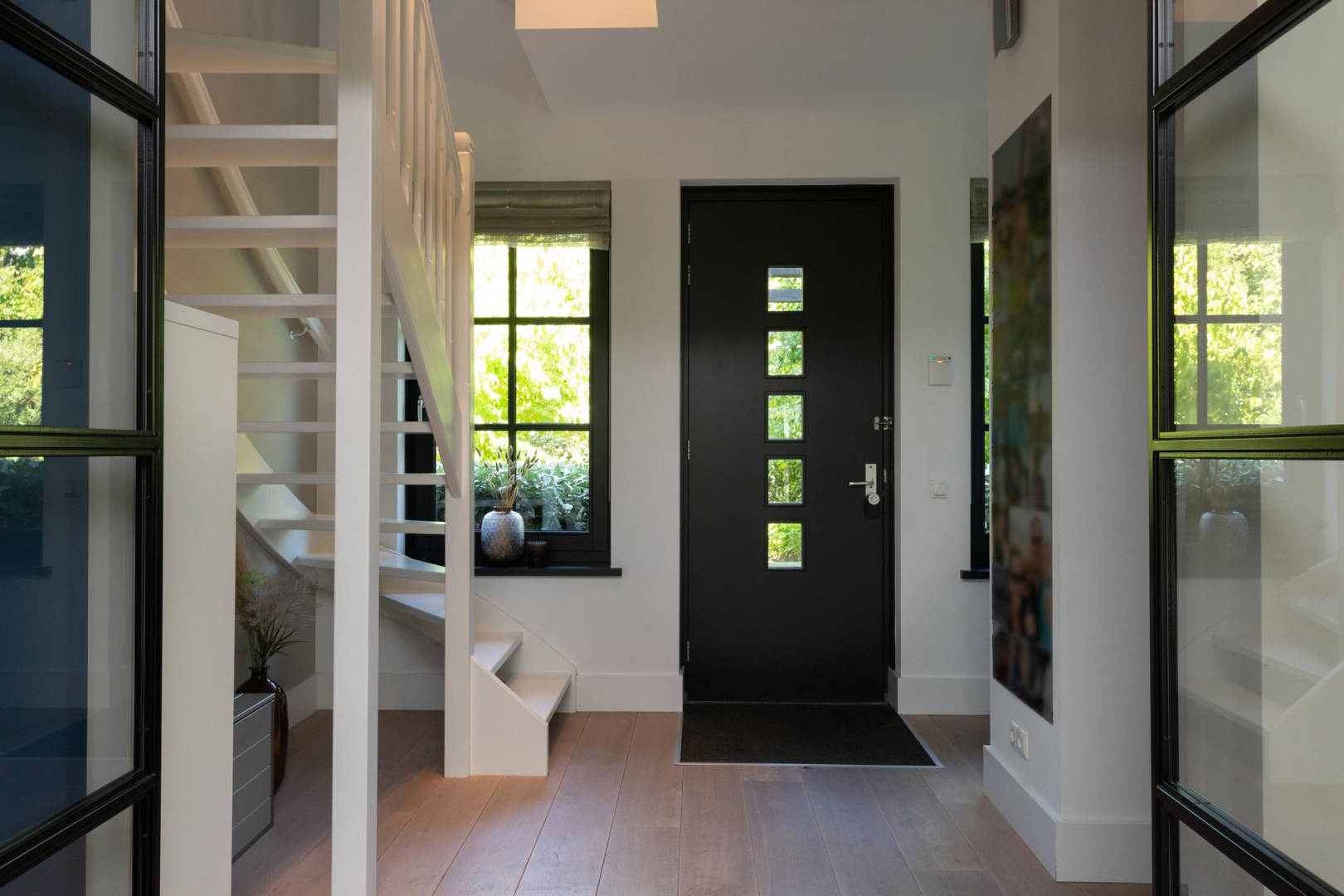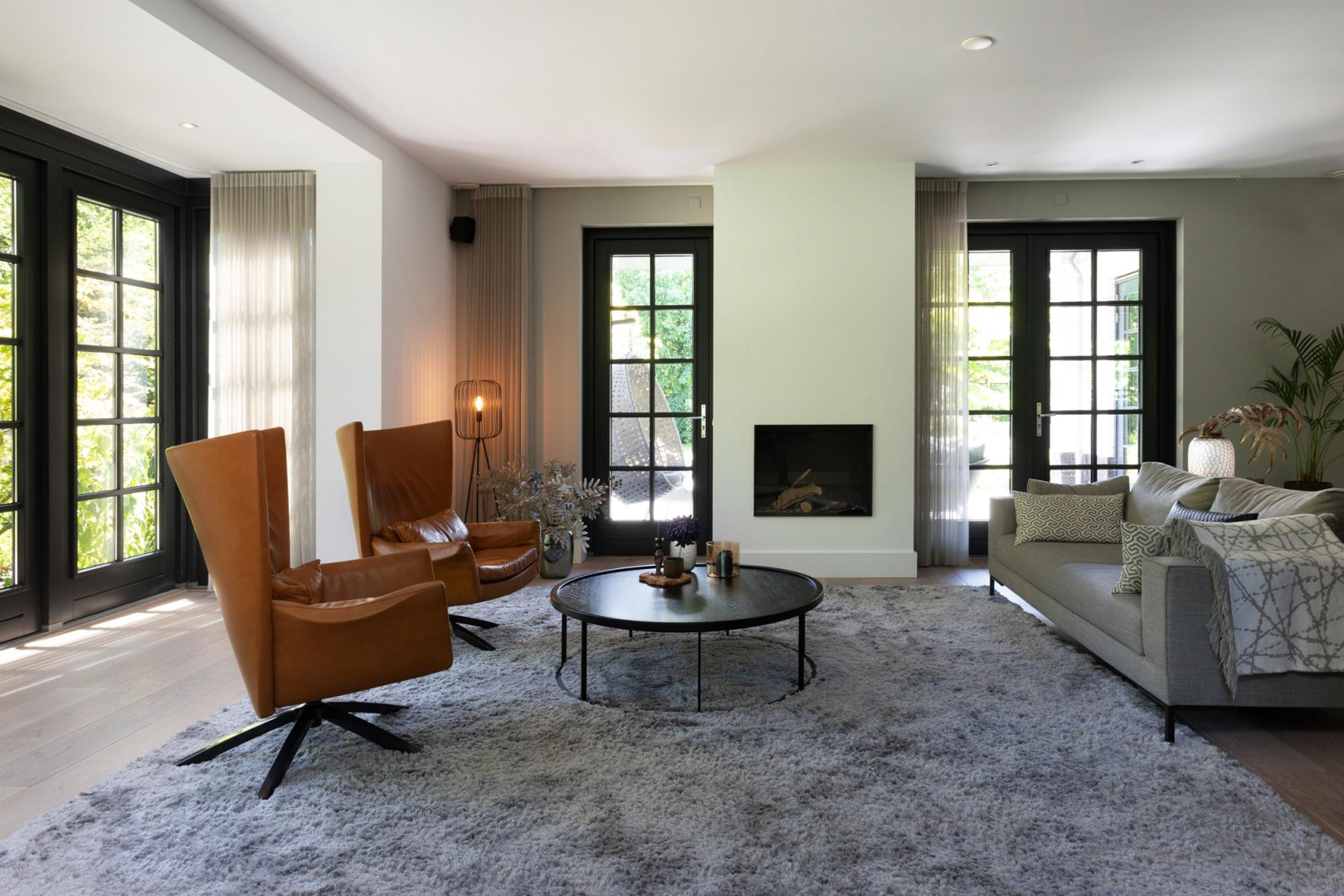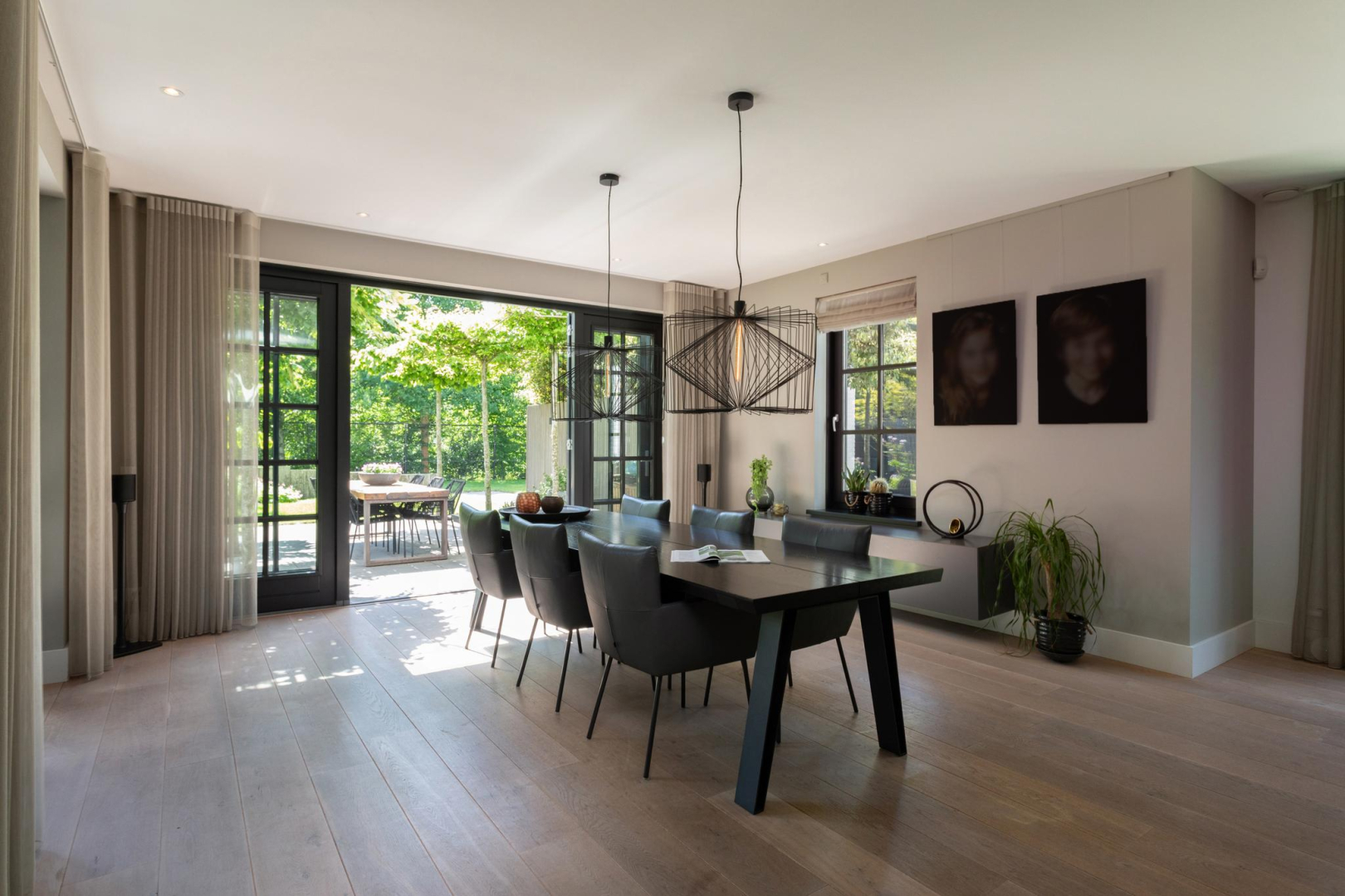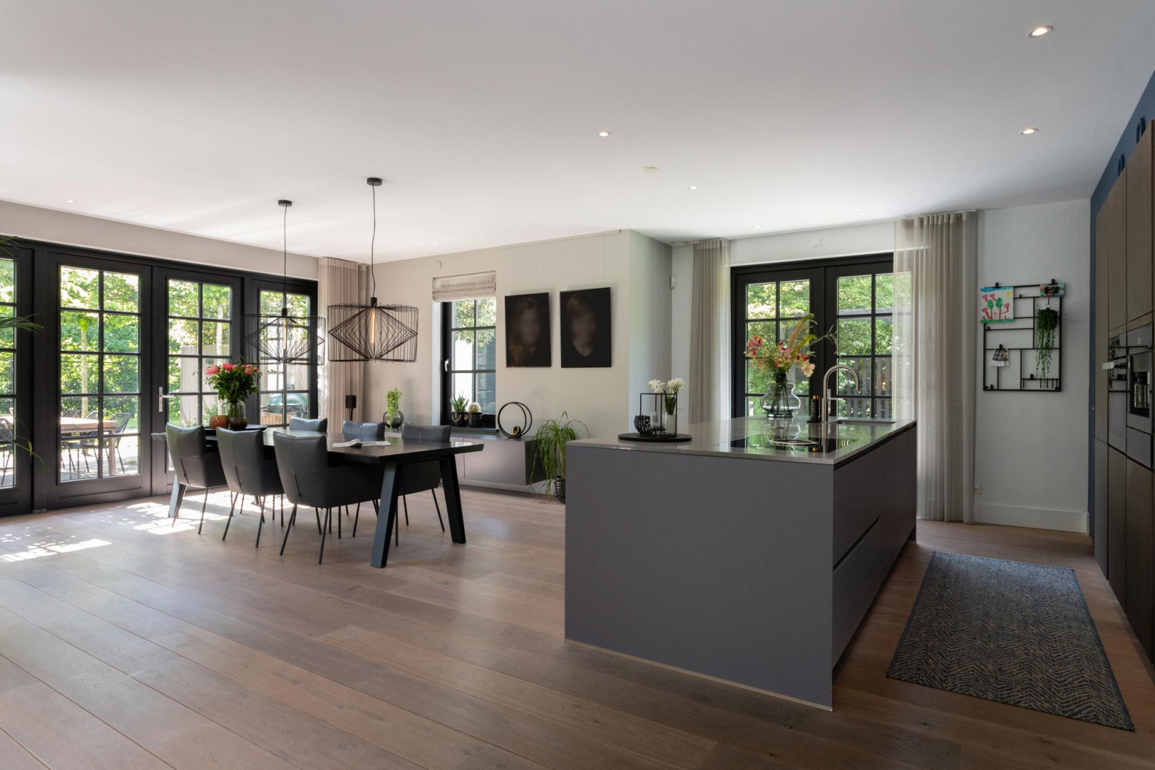 Bij binnenkomst wordt u verwelkomd in een ruime entree met stijlvolle garderobe, een maatwerkkast voor schoenen en een elegant toilet met wandcloset en fonteinmeubel. Dubbele stalen taatsdeuren geven toegang tot het hart van de woning: de indrukwekkende leefkeuken en de royale living. De zeer ruime woonkamer ademt sfeer en luxe, met een vast wandmeubel, aparte tv-hoek, voorzien van een surround audiosysteem, een charmante erker met openslaande deuren en rondom de living diverse dubbele deuren die zorgen voor een directe verbinding met de onder architectuur aangelegde tuin. Dankzij de hoge plafonds en de overvloed aan ramen geniet u van een zee aan licht. De royale leefruimte is uitgerust met een gecombineerde gashaard, terwijl u buiten, onder de veranda, sfeervol kunt genieten van de hout gestookte haard. De gehele begane grond is voorzien van eiken lamelparket en comfortabele vloerverwarming die tevens kan koelen – een genot in alle jaargetijden. De woning is uitgerust met een domotica systeem, waardoor verlichting, temperatuur en veiligheid eenvoudig te bedienen zijn en is naar wens uit te breiden.