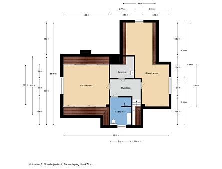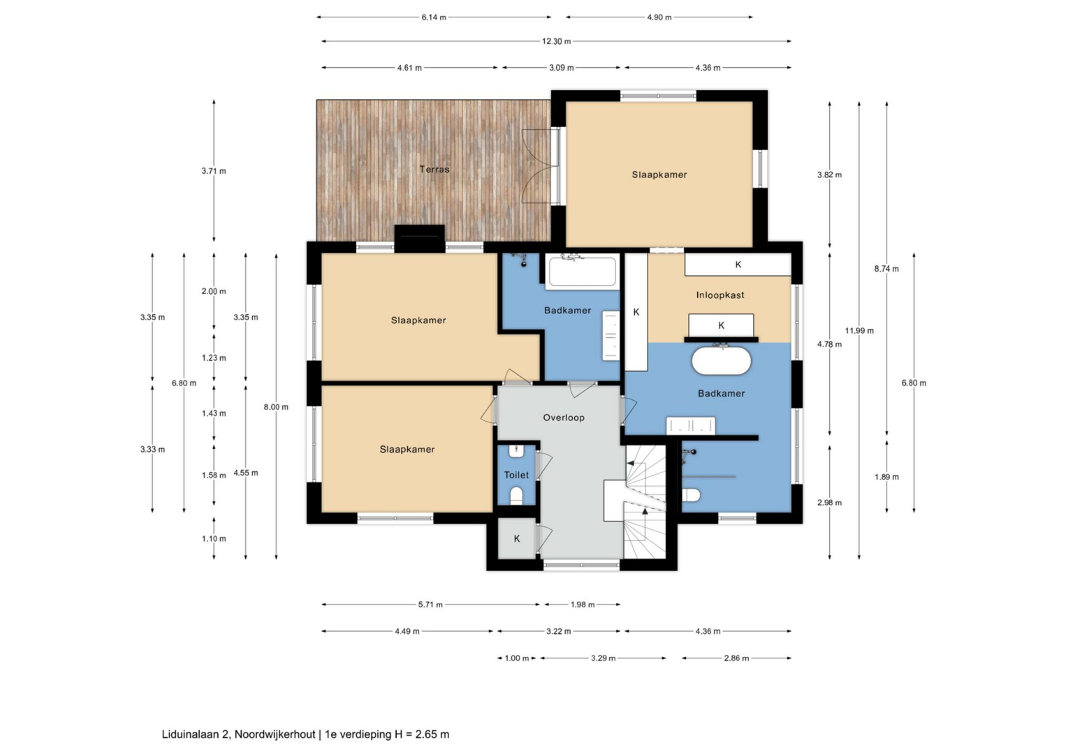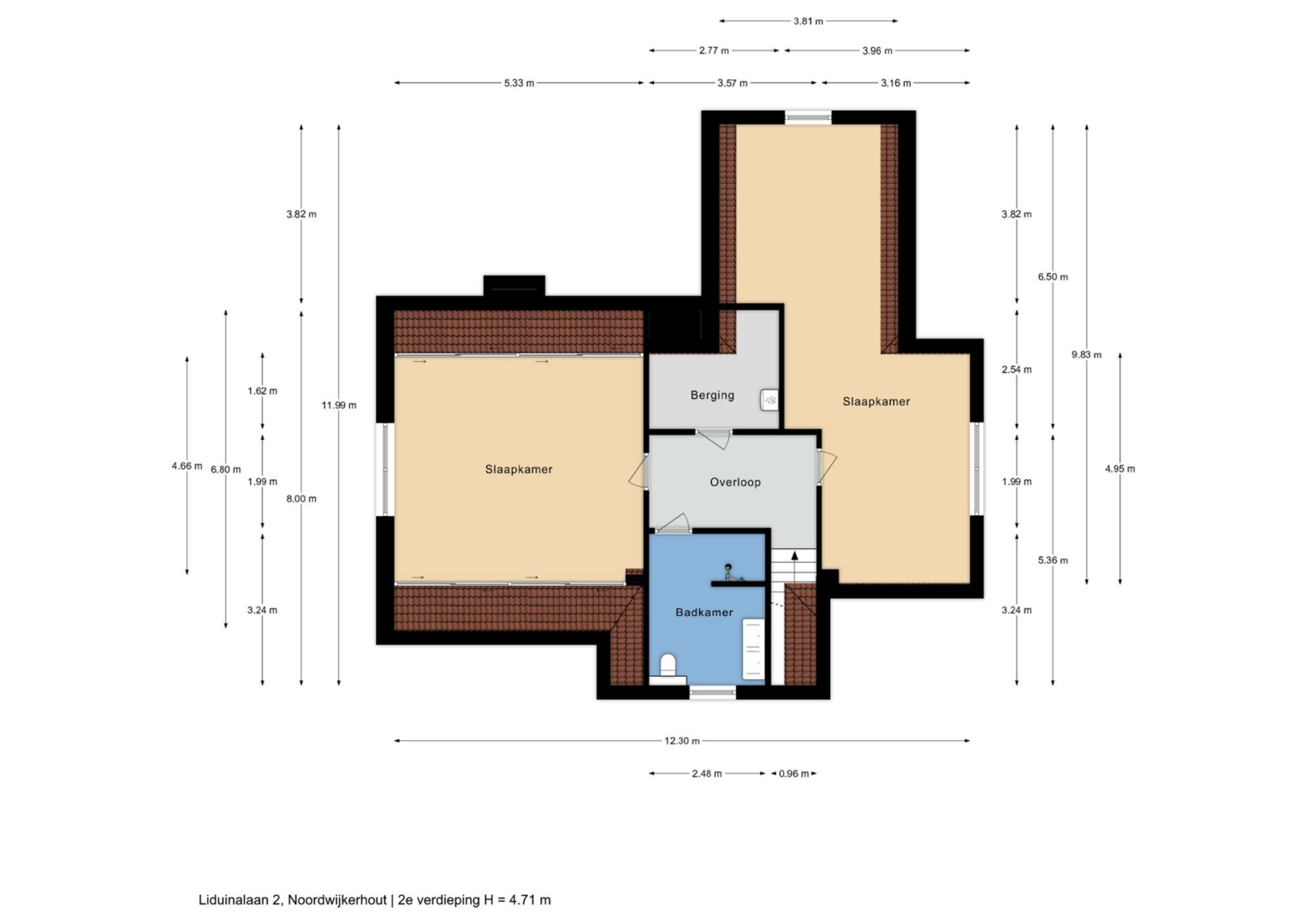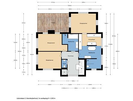 De tweede verdieping telt nog eens twee volwaardige slaapkamers, beide voorzien van airconditioning, veel lichtinval en volop extra bergruimte achter de rondom geplaatste knieschotten. Er is een aparte technische ruimte met aansluitingen voor was- en droogapparatuur. Een derde badkamer completeert deze verdieping, uitgerust met inloopdouche, wandcloset, dubbele wastafelmeubel en een raam voor daglicht.