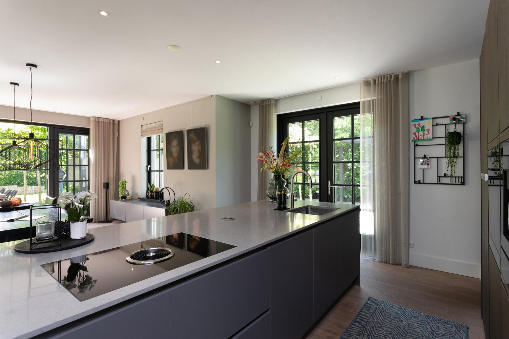 Vrienden, familie, oud en jong kunnen aanschuiven in de gezellige leefkeuken! De indrukwekkende leefkeuken, met aansluitend de grote eettafel, is een droom voor de kookliefhebber. Het kookeiland, van het merk Hacker Systema heeft een composiet blad van het merk Cesarstone en is voorzien van een wijnklimaatkast, extra kastruimte, stopcontact in het blad, vaatwasser, Quooker 3-in-1 (flexkraan, gekoeld en bruisend water (Cube) en kokend water) en een BORA inductiekookplaat met geïntegreerde afzuiging. De kastenwand, van merk Barletti, is uitgerust met hoogwaardige Miele-apparatuur: een ingebouwde koffiemachine, een warmhoudlade, een oven, koelkast en vriezer. Ook hier is aan alles gedacht: stijl, opbergruimte en gebruiksgemak komen perfect samen. De praktische bijkeuken heeft een maatwerk schoenenkast en technische ruimte met meterkast, domotica WTW-installatie, aardwarmtepomp en boiler. De vloer is afgewerkt met onderhoudsvriendelijke plavuizen en er is een deur die direct toegang geeft tot de oprit en tuin.