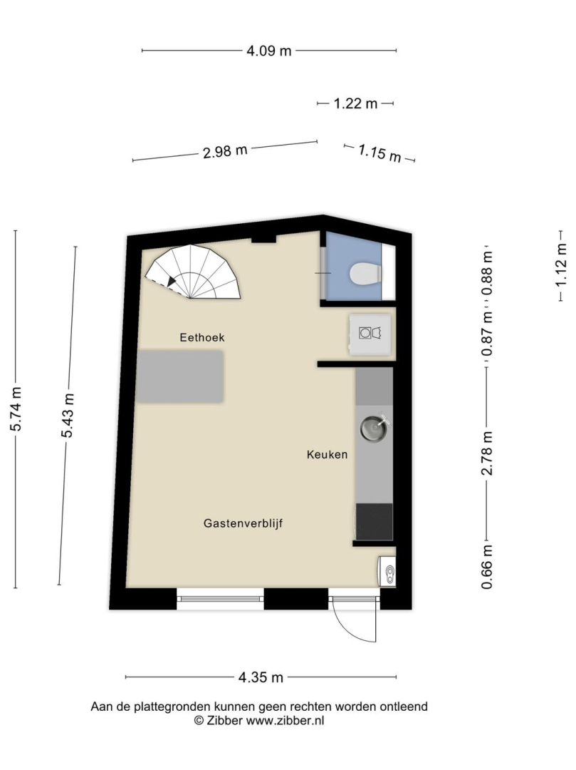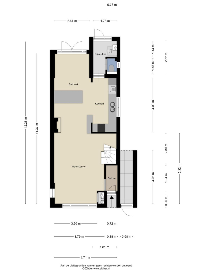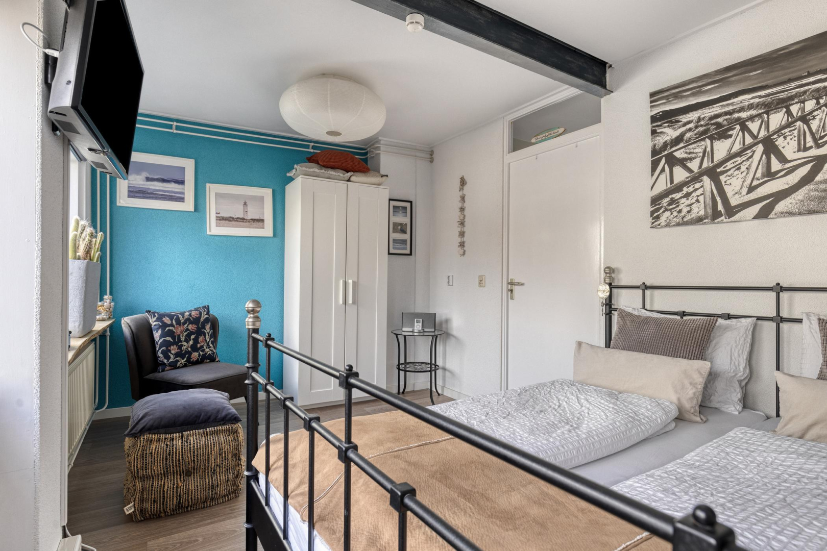 Het zomerhuis is bereikbaar via een eigen opgang naast de woning. Entree, rechts de opstelplaats voor de cv-ketel en open keuken in rechte opstelling met gaskookplaat, rvs-afzuigkap, koelkast, kastruimte en leistenen aanrechtblad. Naast de keuken bevindt zich de opstelplaats voor de wasapparatuur en het toilet. De gezellige lichte woonkamer heeft een open trap naar de 1e verdieping.