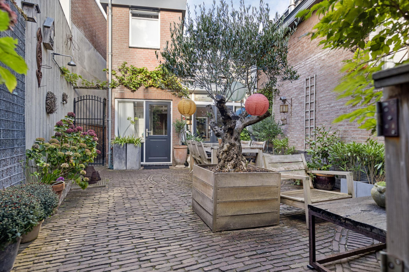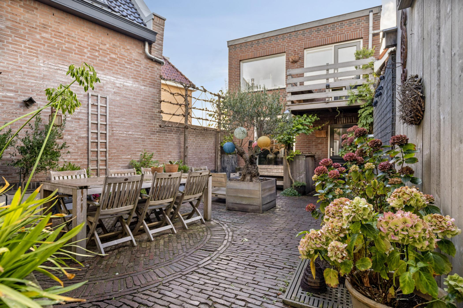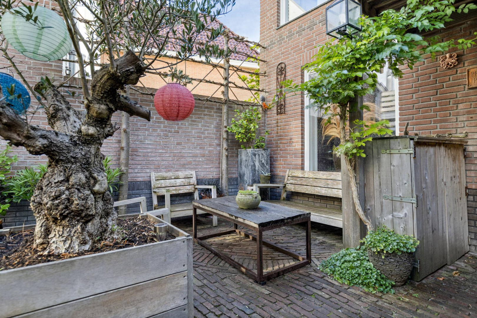De achtertuin is vanuit de woning bereikbaar door de openslaande deuren in de woonkamer of de deur vanuit de bijkeuken. De beschutte tuin is onderhoudsvriendelijk met grote en kleine plantenbakken. Langs de gemetselde schutting staan leilindes waardoor de tuin veel privacy biedt. Langs de achtergevel groeit een prachtige blauwe druif en na een dagje strand kun je het zand afspoelen met de buitendouche. Er is ook een achterom en achterin de tuin bevindt zich het zomerhuis.