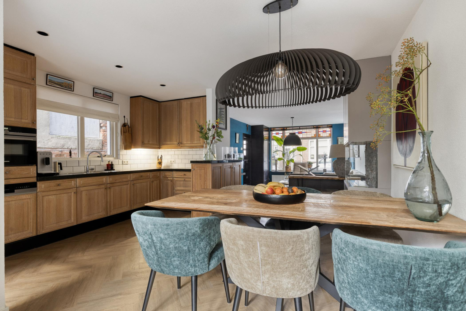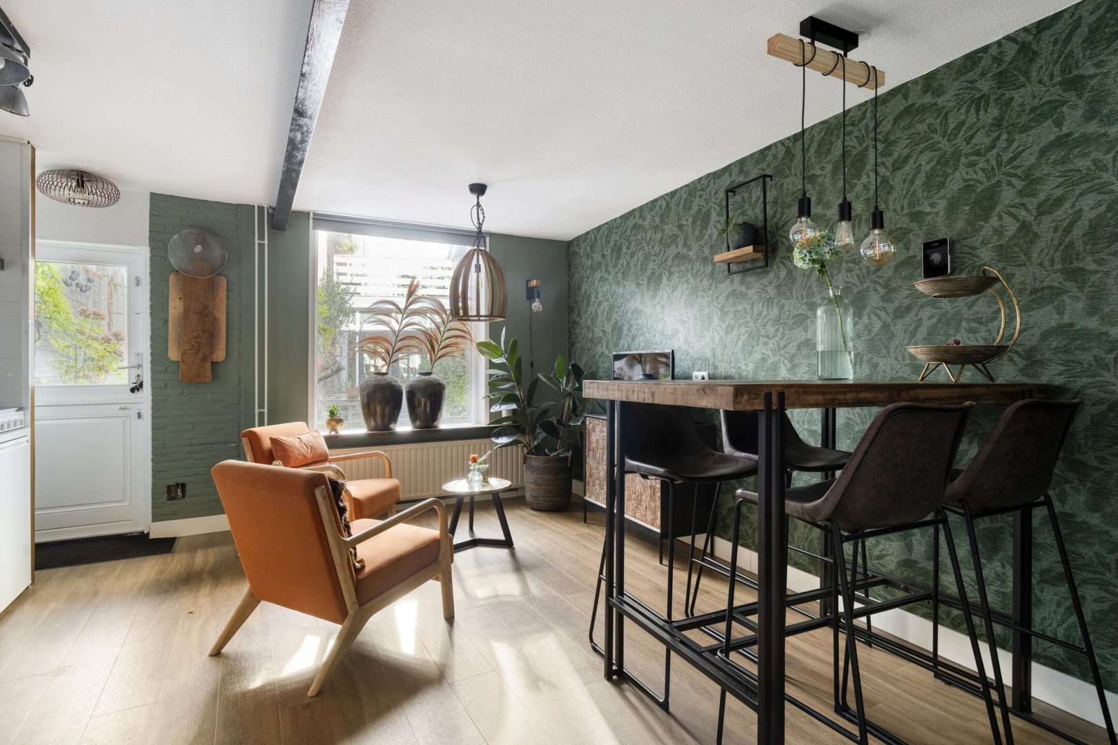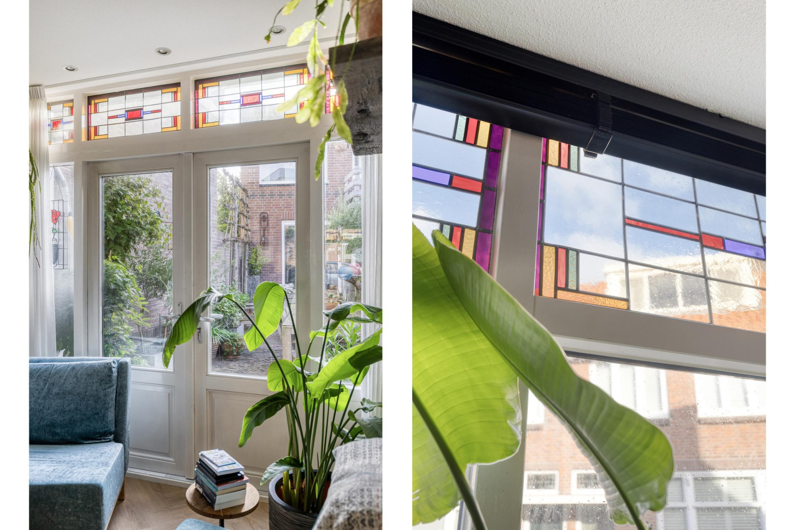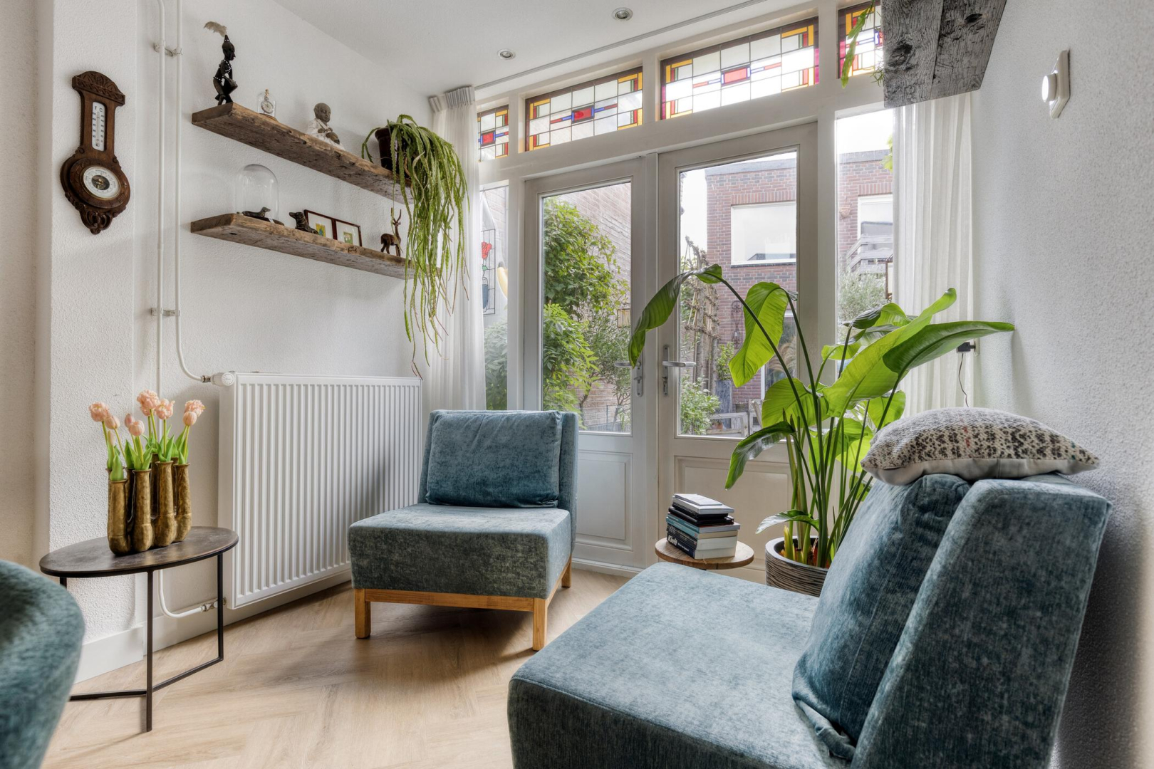 Deze sfeervolle woning is voorzien van een eigen, met een rolluik, af te sluiten portiek. De hal verwelkomt je met een garderobe en biedt toegang tot de lichte en uitnodigende woonkamer. De woonkamer straalt gezelligheid uit, met een groot raam aan de voorzijde voorzien van prachtige glas-in-loodramen aan de bovenzijde, verwerkt tussen dubbelglas voor optimale isolatie. Een sfeervolle gelhaard maakt het geheel compleet en zorgt voor een warme, huiselijke ambiance. Via openslaande deuren aan de achterzijde, met ook glas-in-loodramen aan de bovenzijde, loop je direct de achtertuin in, wat een fijne verbinding tussen binnen en buiten creëert. De open keuken is een lust voor het oog en zeer functioneel ingericht. De massief eiken kastdeuren en het granieten aanrechtblad vormen een stijlvolle basis, terwijl diverse inbouwapparatuur, zoals een keramisch kookplaat, combi-oven, koel-/vriescombinatie en vaatwasser, het koken en bereiden van maaltijden aangenaam en efficiënt maken. Aansluitend aan de keuken bevindt zich een praktische bijkeuken, alwaar tevens het toilet, aansluitingen voor wasapparatuur en de opstelplaats voor de cv-ketel. Ook vanuit de bijkeuken is de achtertuin direct bereikbaar, wat extra gemak en functionaliteit biedt. De leefruimte is voorzien van een pvc visgraadvloer, strakke plafonds en overschilderbare wandafwerking.
