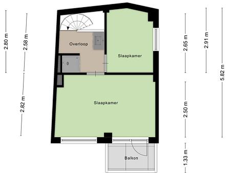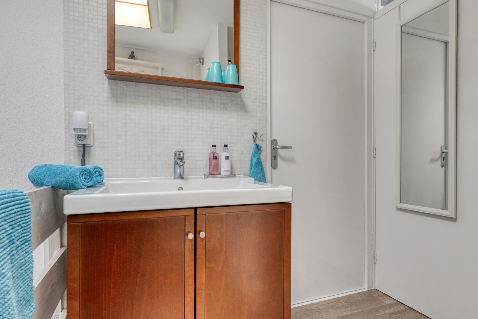 Overloop met douche en wastafelmeubel en 2 slaapkamers waarvan één met deur naar het balkon waar je de laatste zonnestralen van de dag kunt vangen.