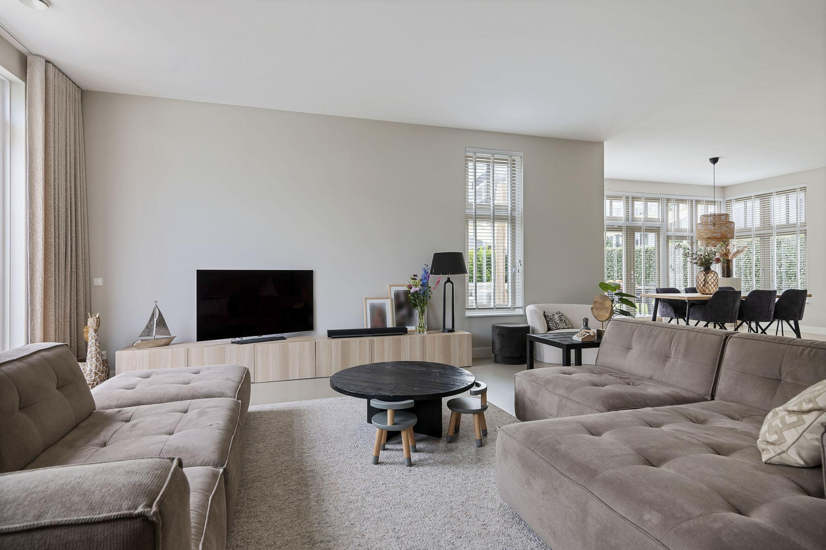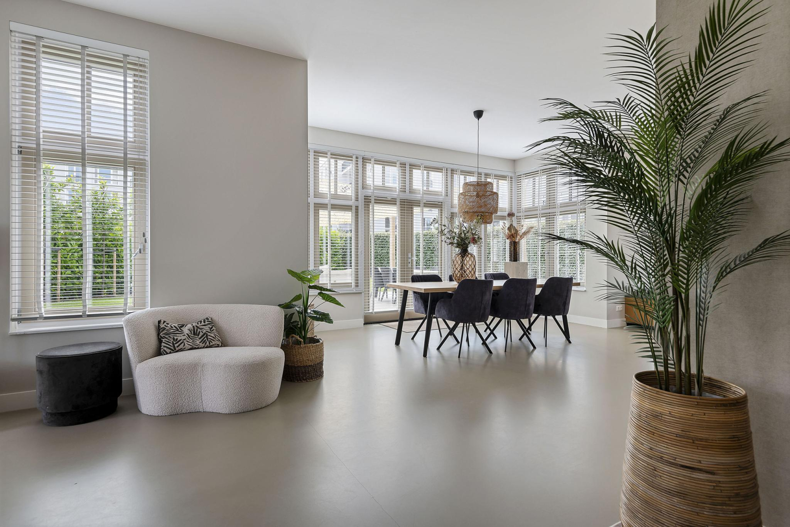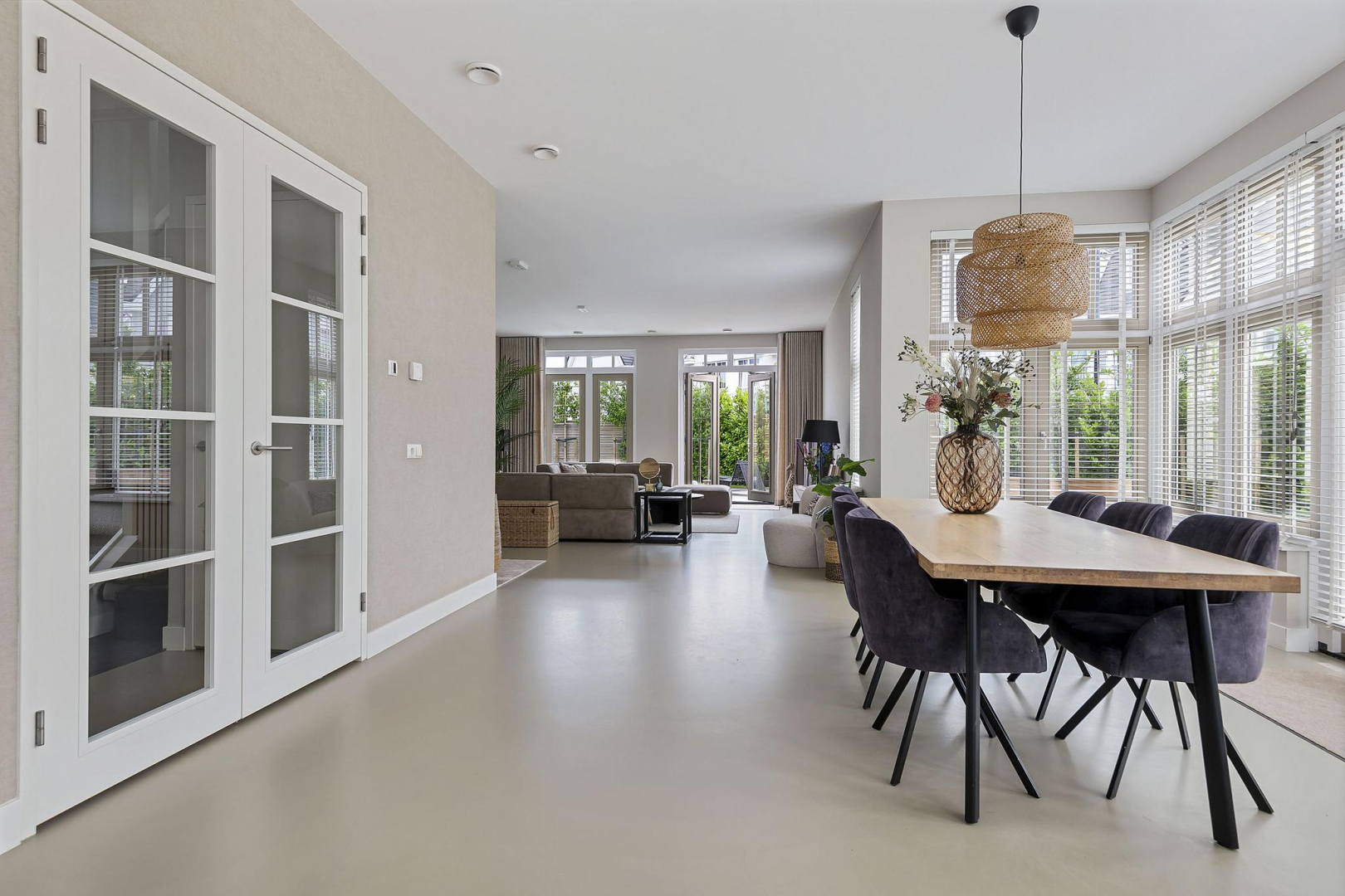 Door dubbele openslaande deuren betreedt u de ruime, sfeervolle living. Door de vele raampartijen, de zonnige ligging en het hoge plafond van circa 3 meter geniet u de hele dag van overvloedig daglicht. Er zijn diverse fijne zithoeken, waaronder in de erker. Voor tv-kijken of rustig lezen is er de ruime woonkamer, plus een ruime separate werk/speelkamer. De luxe gietvloer met vloerverwarming en het hoogwaardige afwerkingsniveau versterken de sfeer van comfort en warmte. Via meerdere openslaande deuren op de begane grond heeft u toegang tot de riante en zonnige tuin, waar u het hele jaar door kunt genieten van het verwarmde zwembad, het omliggende groen en sfeervolle terrassen voor borrels of gezamenlijke diners.