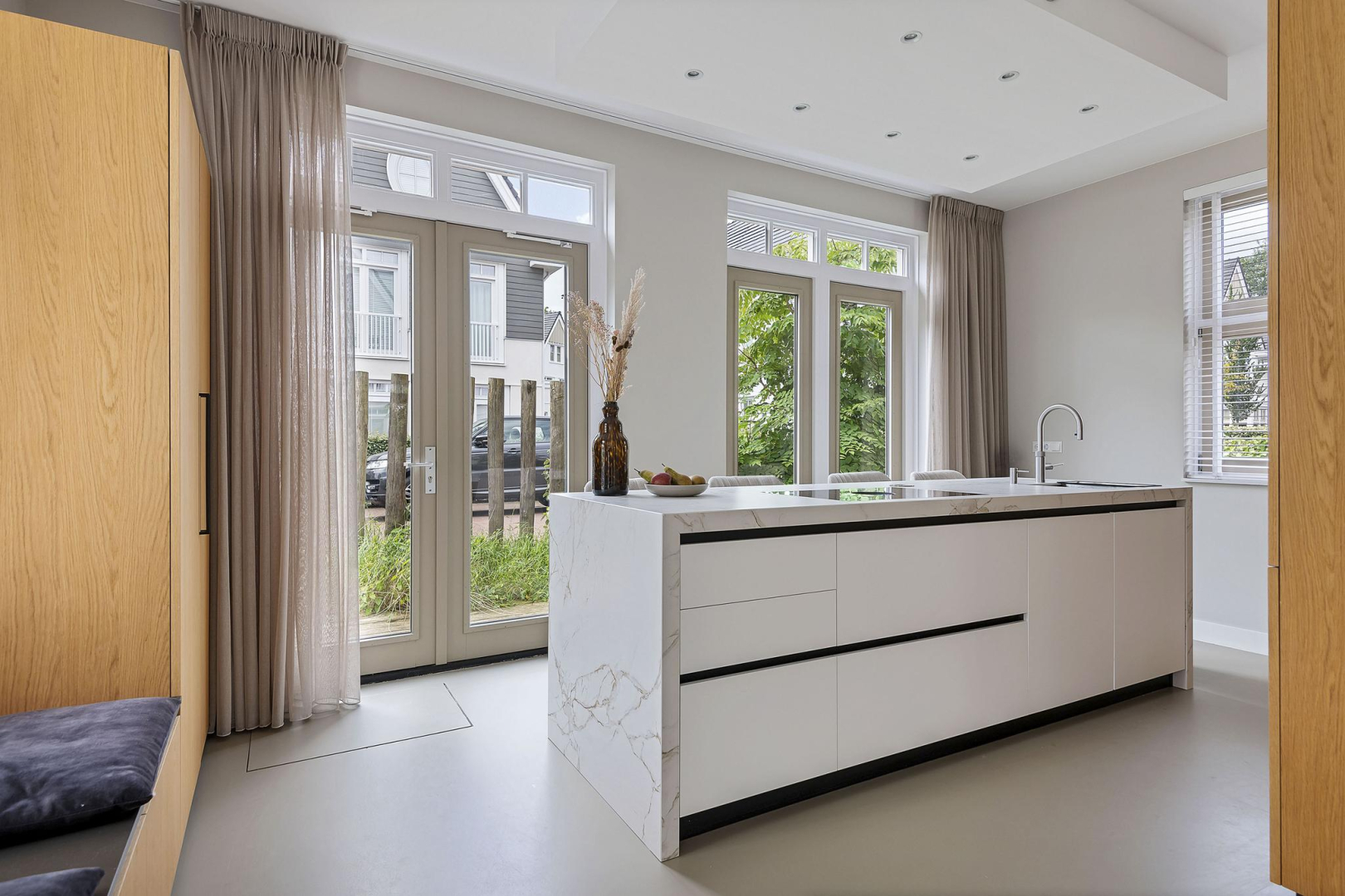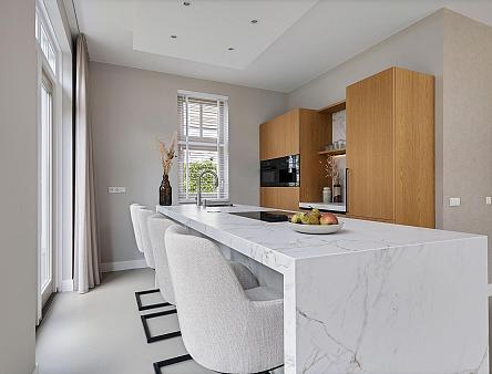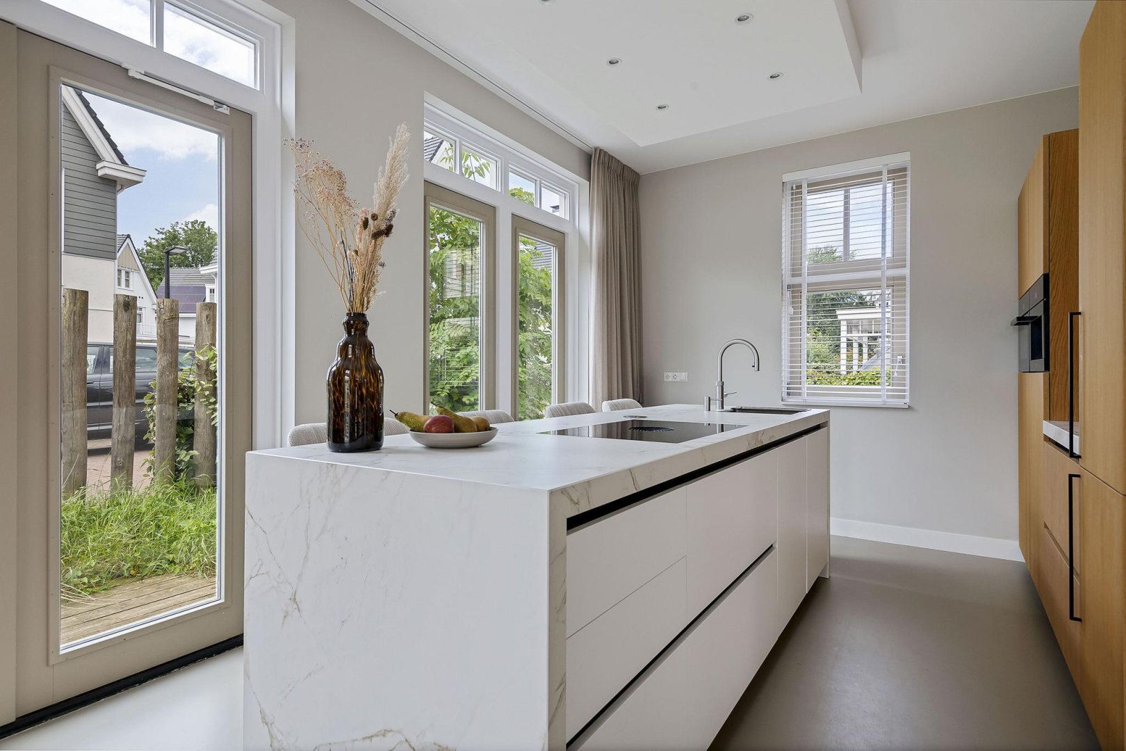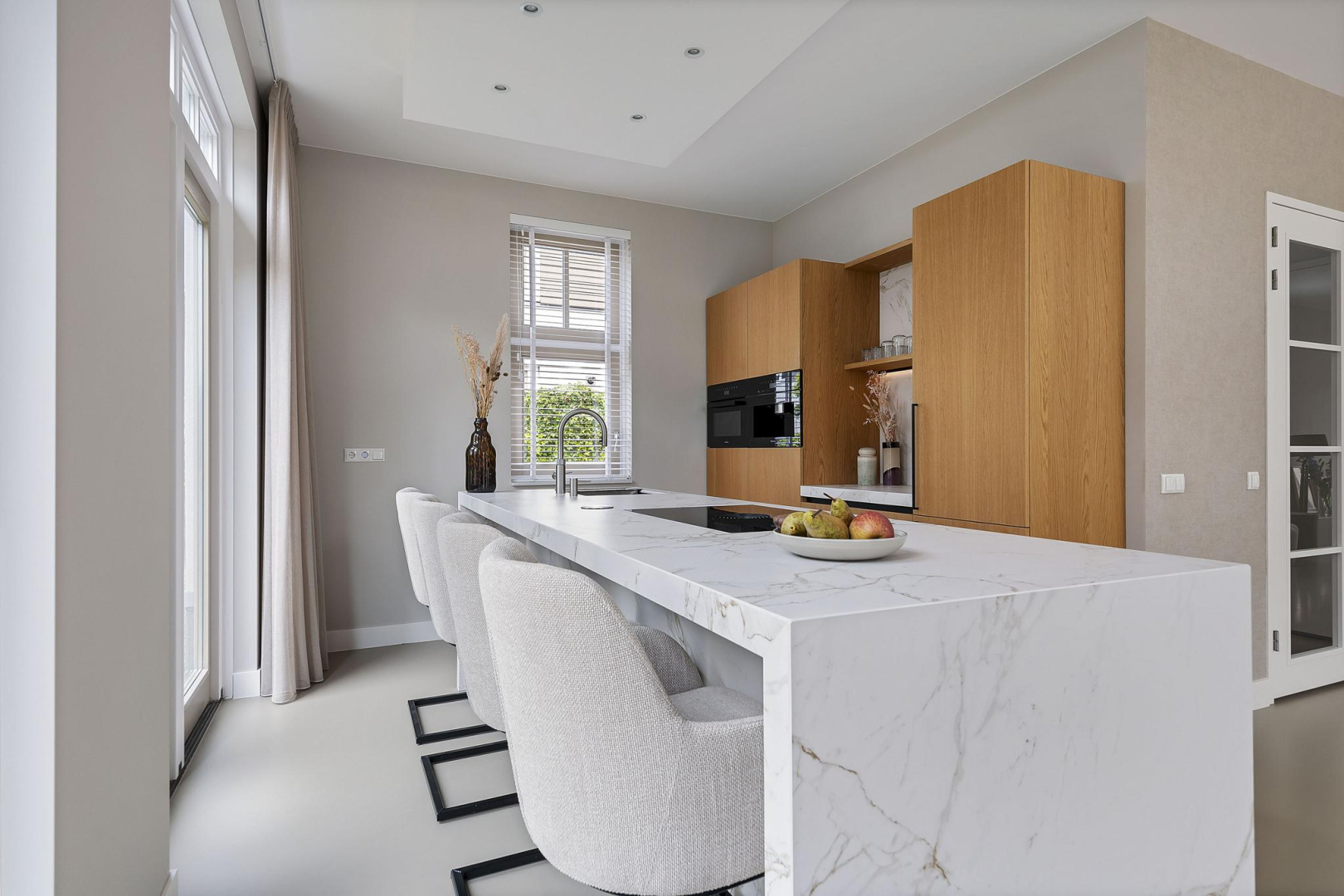 De maatwerkkeuken staat in directe verbinding met de erker en woonkamer. Deze is voorzien van een Dekton Cosentino keukenblad en luxe Miele en Neff inbouwapparatuur, inclusief een Bora kookplaat-. Het eiland beschikt over een spoelgedeelte met Quooker en vaatwasser. Het eiland is tevens voorzien van eetbar. De ruime kastenwand met erker bevat een koelkast, vriezer, oven en ingebouwd koffieapparaat.