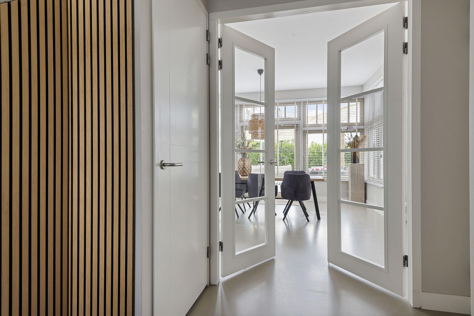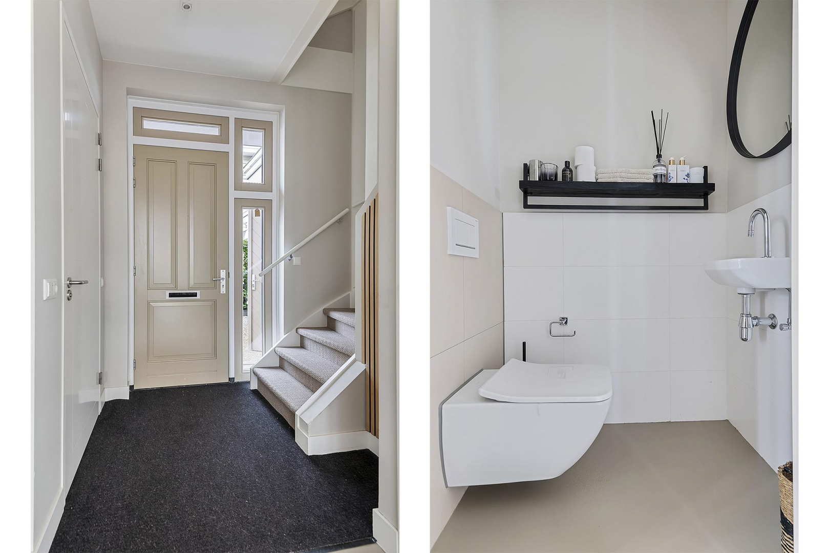 Via de eigen oprit met plaats voor 2 auto's en doorgang naar de bergruimte/garage bereikt u de fraaie entree van de woning. Bij binnenkomst betreedt u de hal met ruim trappenhuis. Dubbele deuren geven toegang tot de woonkamer, terwijl een aparte deur leidt naar de ruime kelder, ideaal als wijnkelder of voor extra opslag. In de hal bevinden zich tevens de meterkast en een stijlvol afgewerkt toilet met wandcloset en fontein. De ruimte is voorzien van een praktische inloopmat en een moderne gietvloer met comfortabele vloerverwarming.