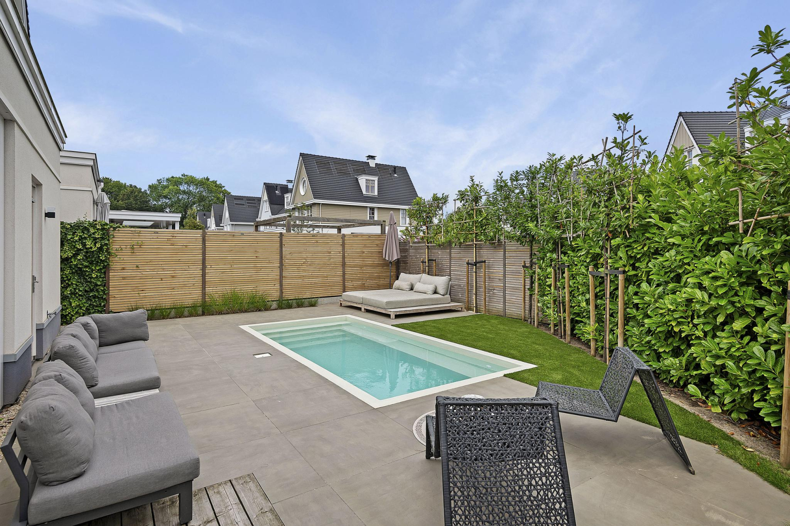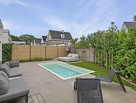 De zonnige achtertuin is uitzonderlijk royaal voor deze kustlocatie. Modern en groen aangelegd met oog op ultieme ontspanning! Aan de erker grenst een groot terras waar u heerlijk kunt genieten van de zon, dankzij de zuidoostelijke ligging. Grenzend aan de woonkamer en werk/speelkamer bevindt zich het ingebouwde zwembad, verwarmd tot 38 graden. Het zwembad is perfect voor een verfrissende of warme duik in elk seizoen en beschikt over een terras om te zonnebaden.