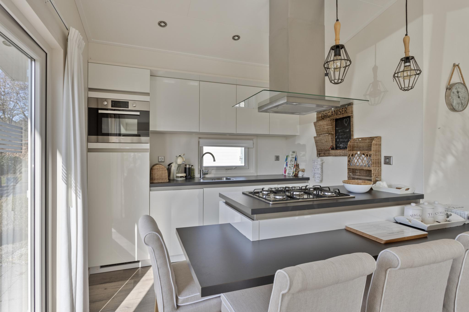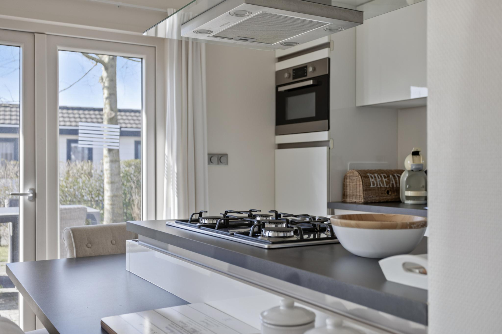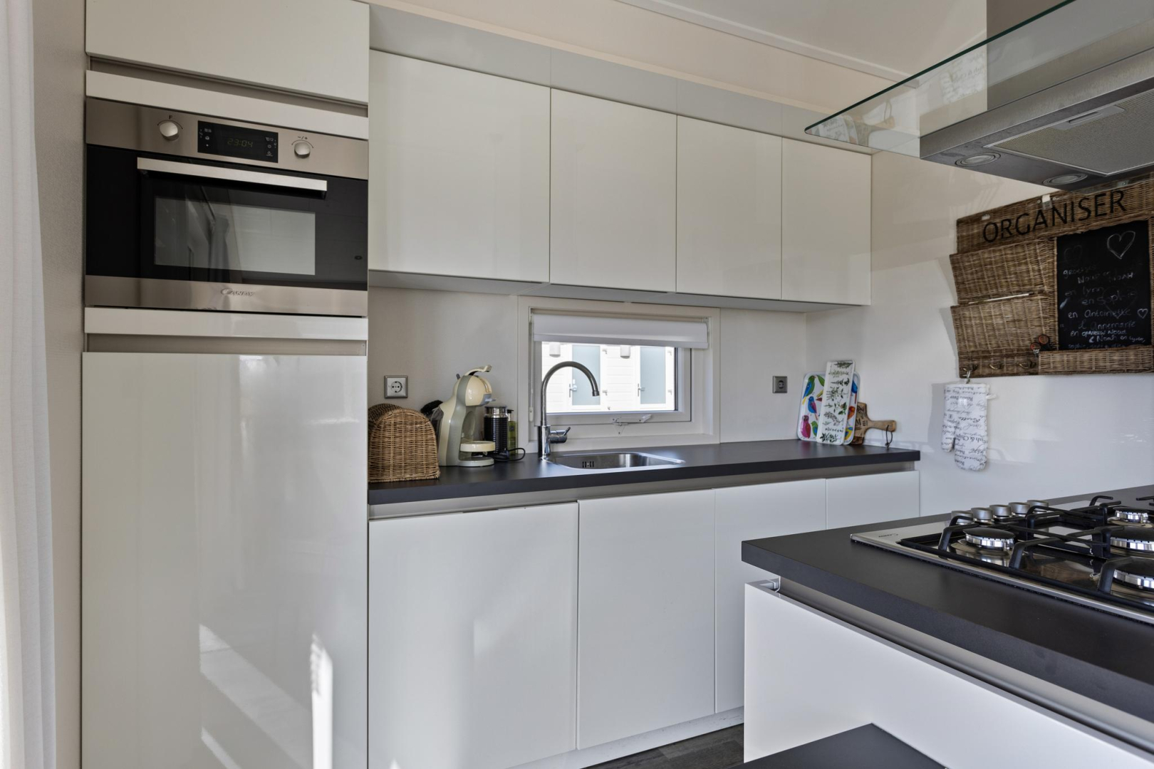 5-pits gasfornuis, RVS-afzuigkap en een ruime (eet)bar. Verder beschikt de keuken over een koelkast met vriesvak, vaatwasser, combi-magnetron en veel kastruimte. De tweede slaapkamer, bereikbaar via de woonkamer, is uitgerust met twee vaste eenpersoonsbedden en kastruimte boven de bedden. Alle ramen in de slaapkamers en badkamer zijn voorzien van horren, en de gehele woning heeft inbouwspotjes in het plafond.