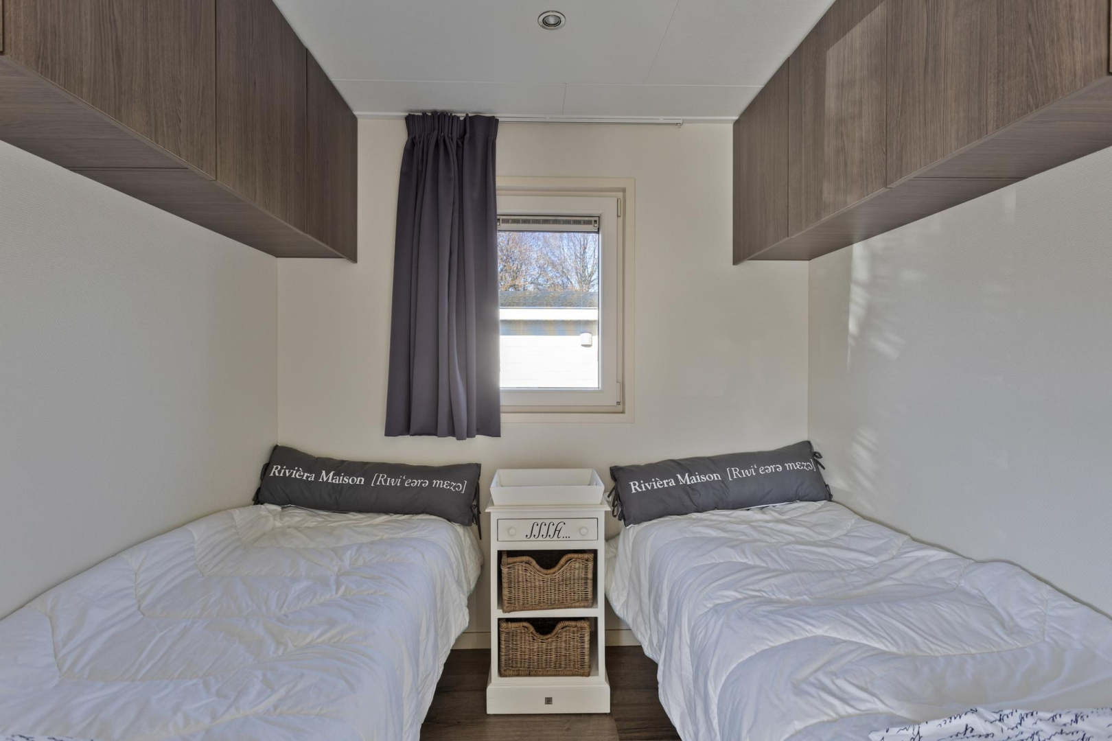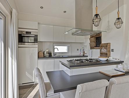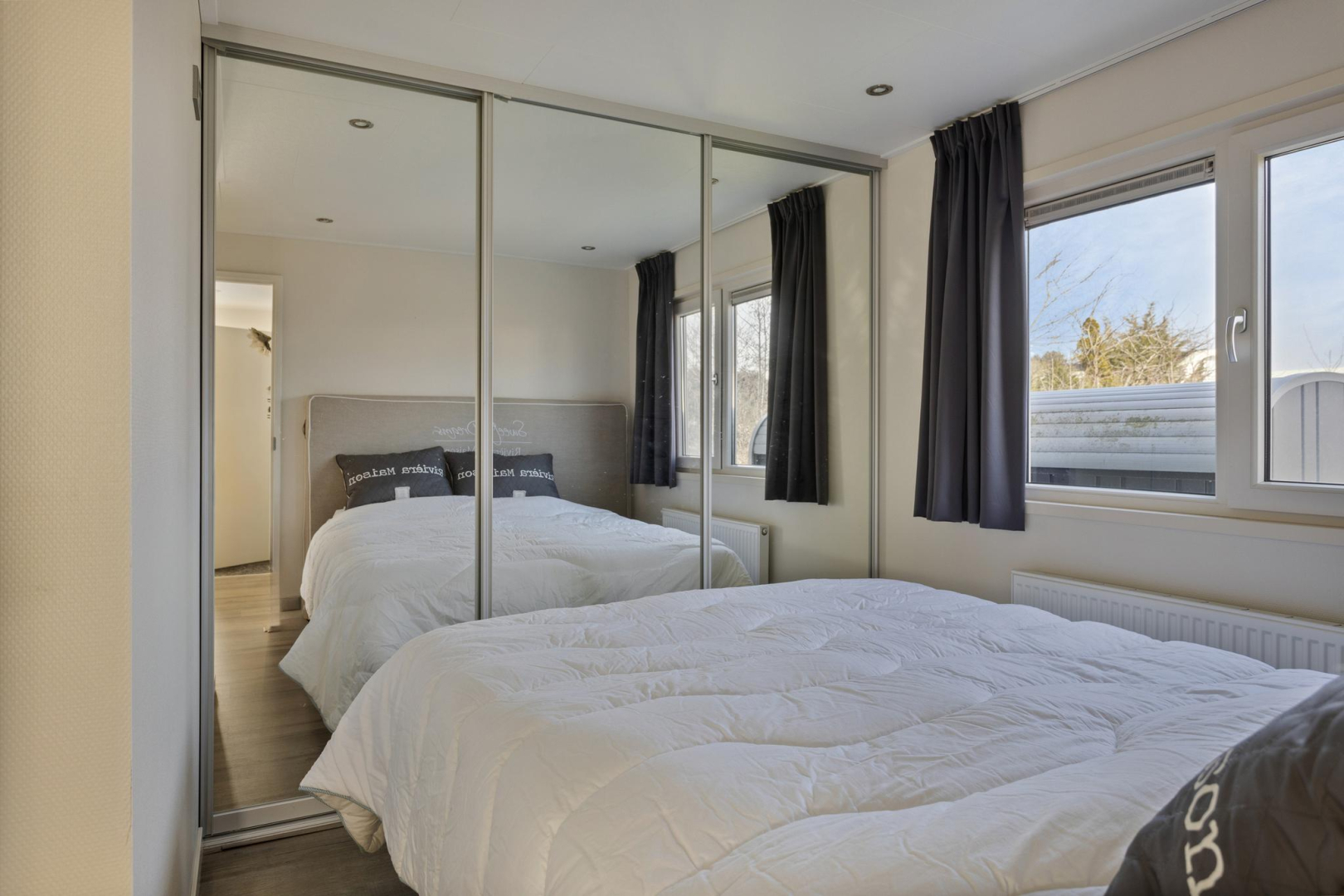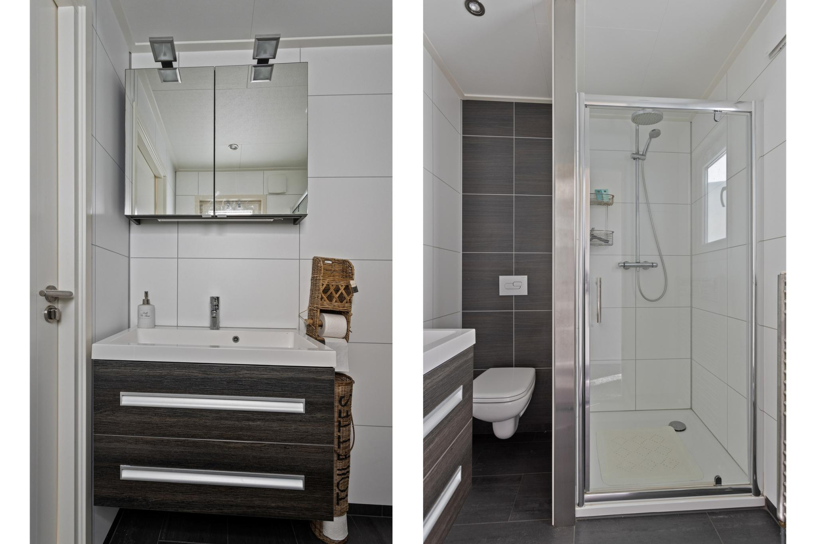 5-pits gasfornuis, RVS-afzuigkap en een ruime (eet)bar. Verder beschikt de keuken over een koelkast met vriesvak, vaatwasser, combi-magnetron en veel kastruimte. De tweede slaapkamer, bereikbaar via de woonkamer, is uitgerust met twee vaste eenpersoonsbedden en kastruimte boven de bedden. Alle ramen in de slaapkamers en badkamer zijn voorzien van horren, en de gehele woning heeft inbouwspotjes in het plafond.