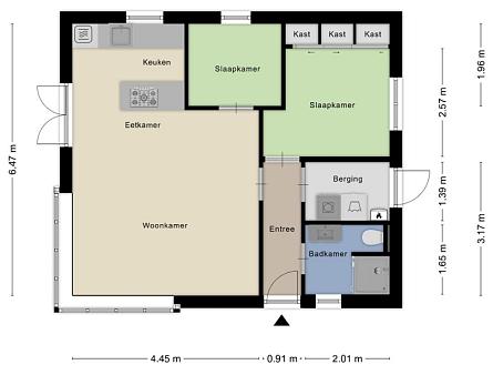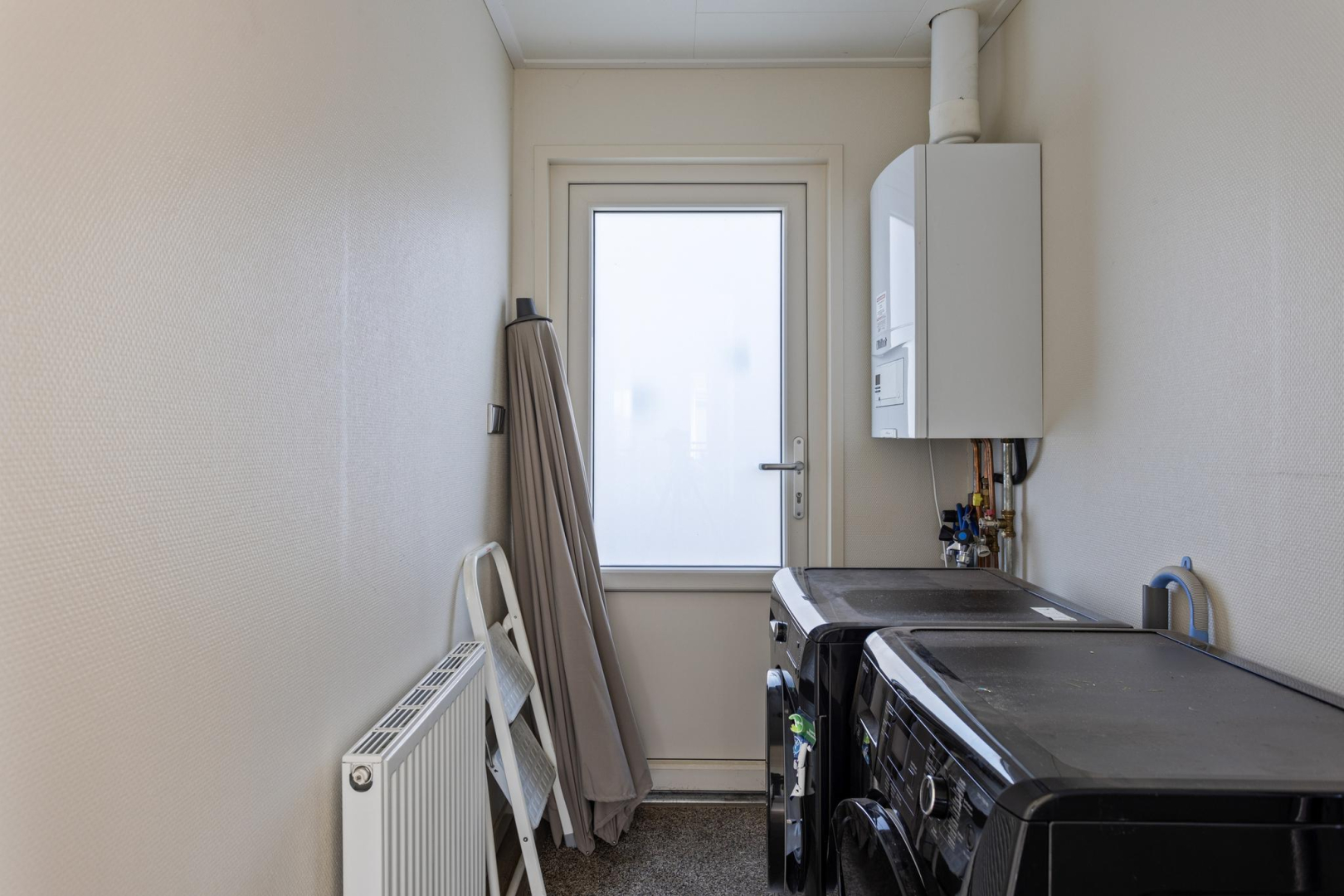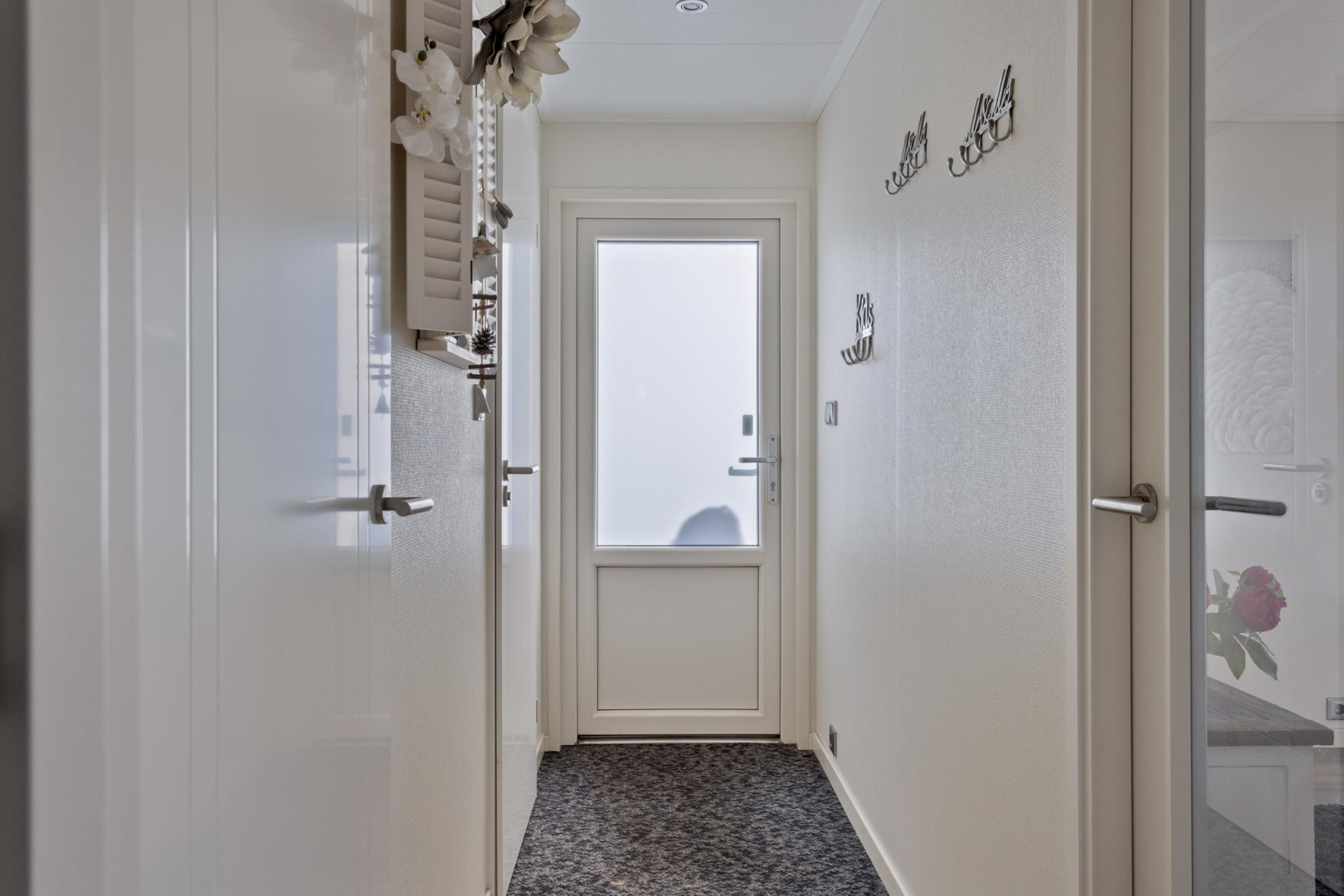 Entree, hal met toegang tot de moderne badkamer, voorzien van een wandcloset, wastafelmeubel met spiegelkast, ruime douche met regen- en handdouche en een handdoekradiator. Naast de badkamer bevindt zich de berging met wasmachine- en drogeraansluiting, de CV-ketel en een deur naar de achterzijde van de woning. Vanuit de hal loop je door naar de eerste slaapkamer met een tweepersoonsbed, vaste kledingkast en een raam met kiepstand. Vervolgens kom je in de lichte woonkamer welke is voorzien van airconditioning en openslaande deuren naar het terras. De open keuken heeft een kookeiland met