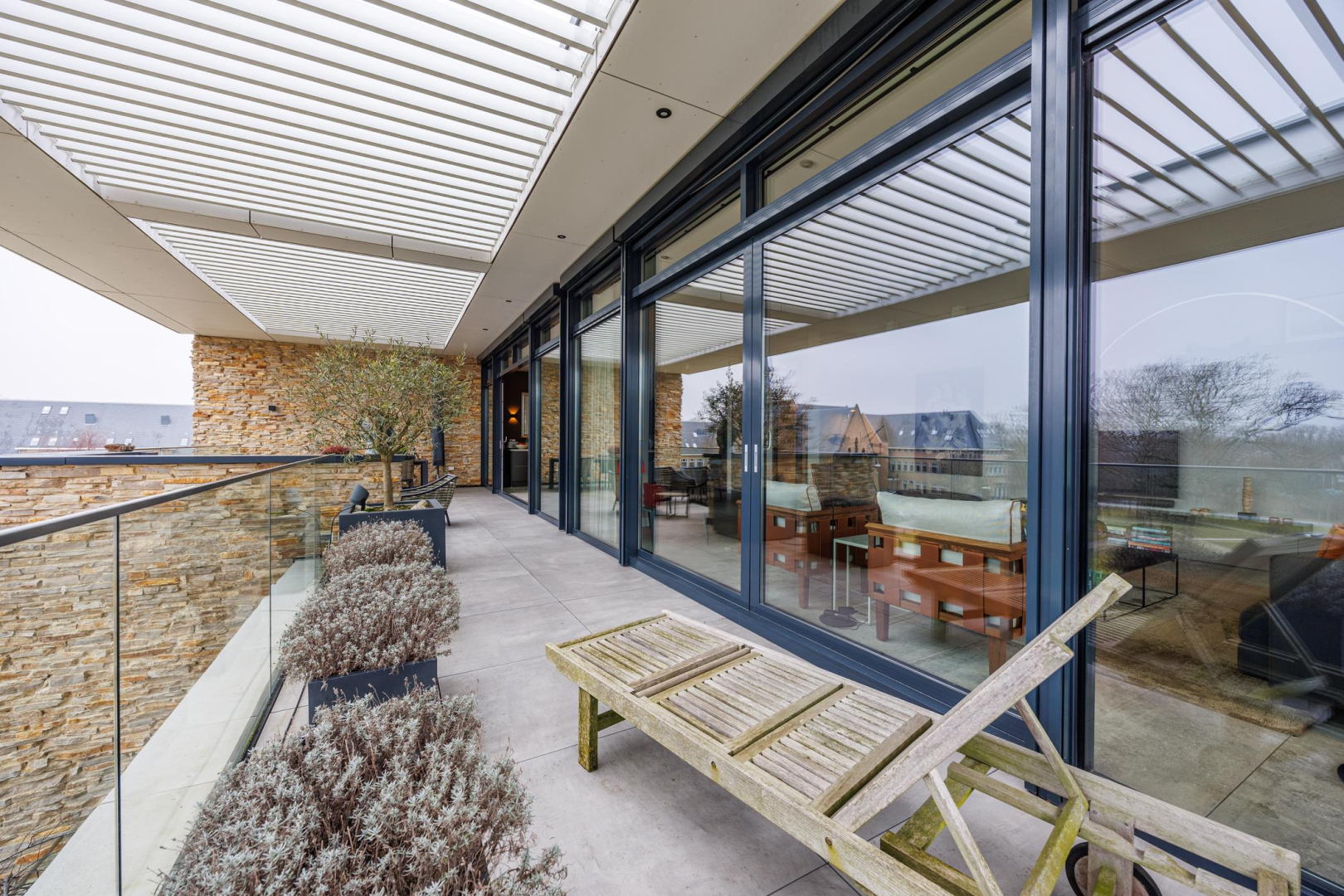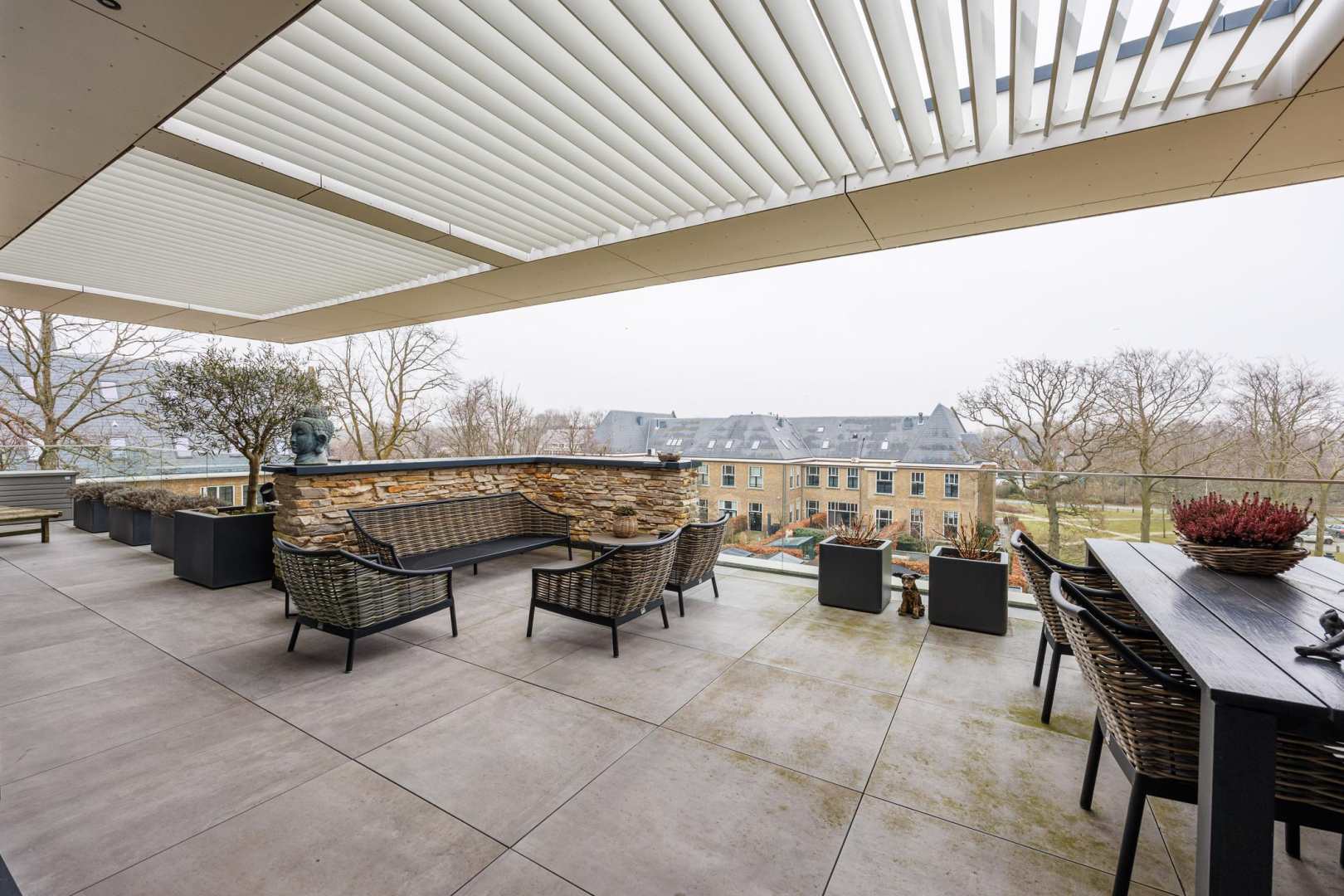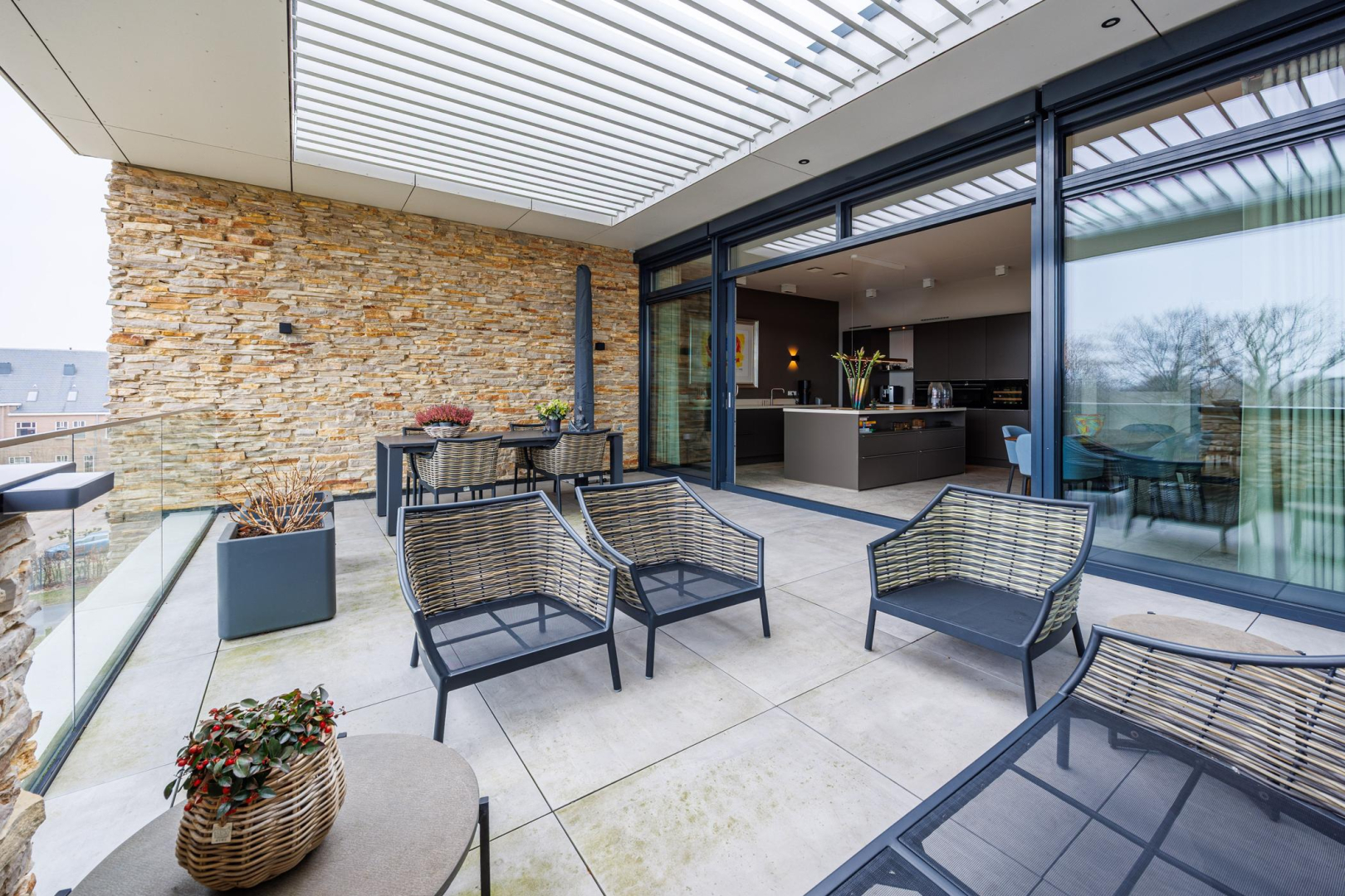 Het zonnige terras op het Zuidoosten sluit qua stijl naadloos aan bij de inrichting binnen. Het bijzondere natuursteen vindt u ook hier terug en samen met de glazen balkon afscheidingen, de lamellen en de warme, grote terras tegels, waant u zich hier in het buitenland. Met totaal 58 m² aan terras is er volop ruimte om te relaxen, loungen, alsmede te dineren aan een grote gezellige eettafel.
