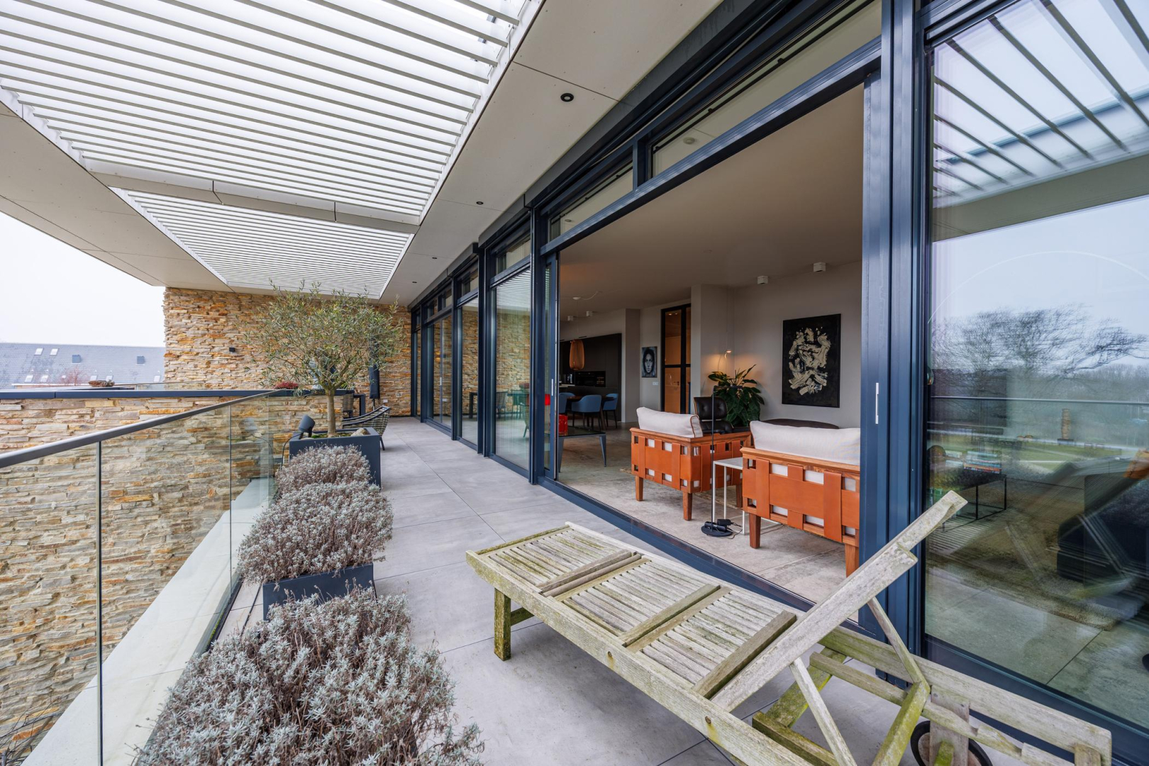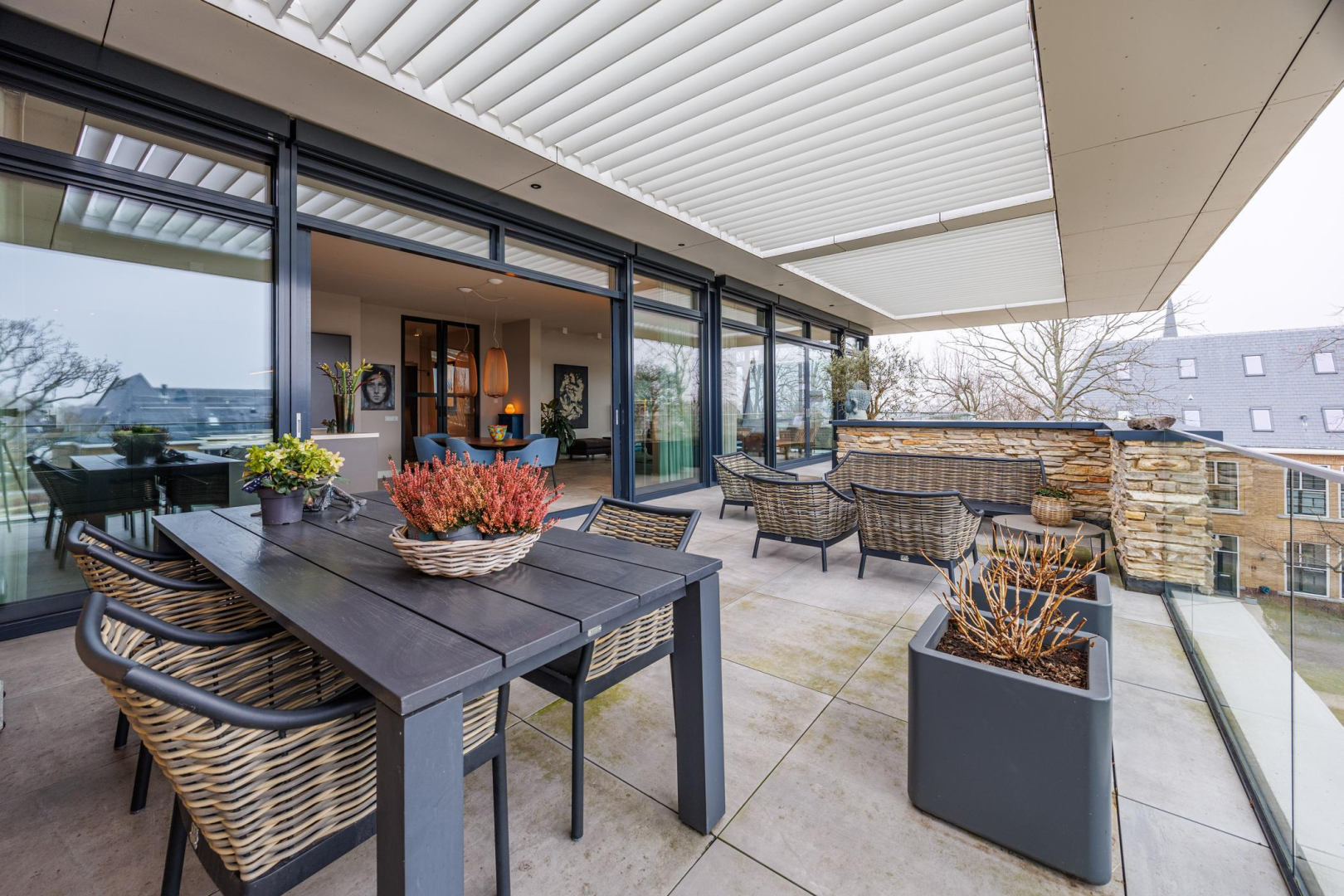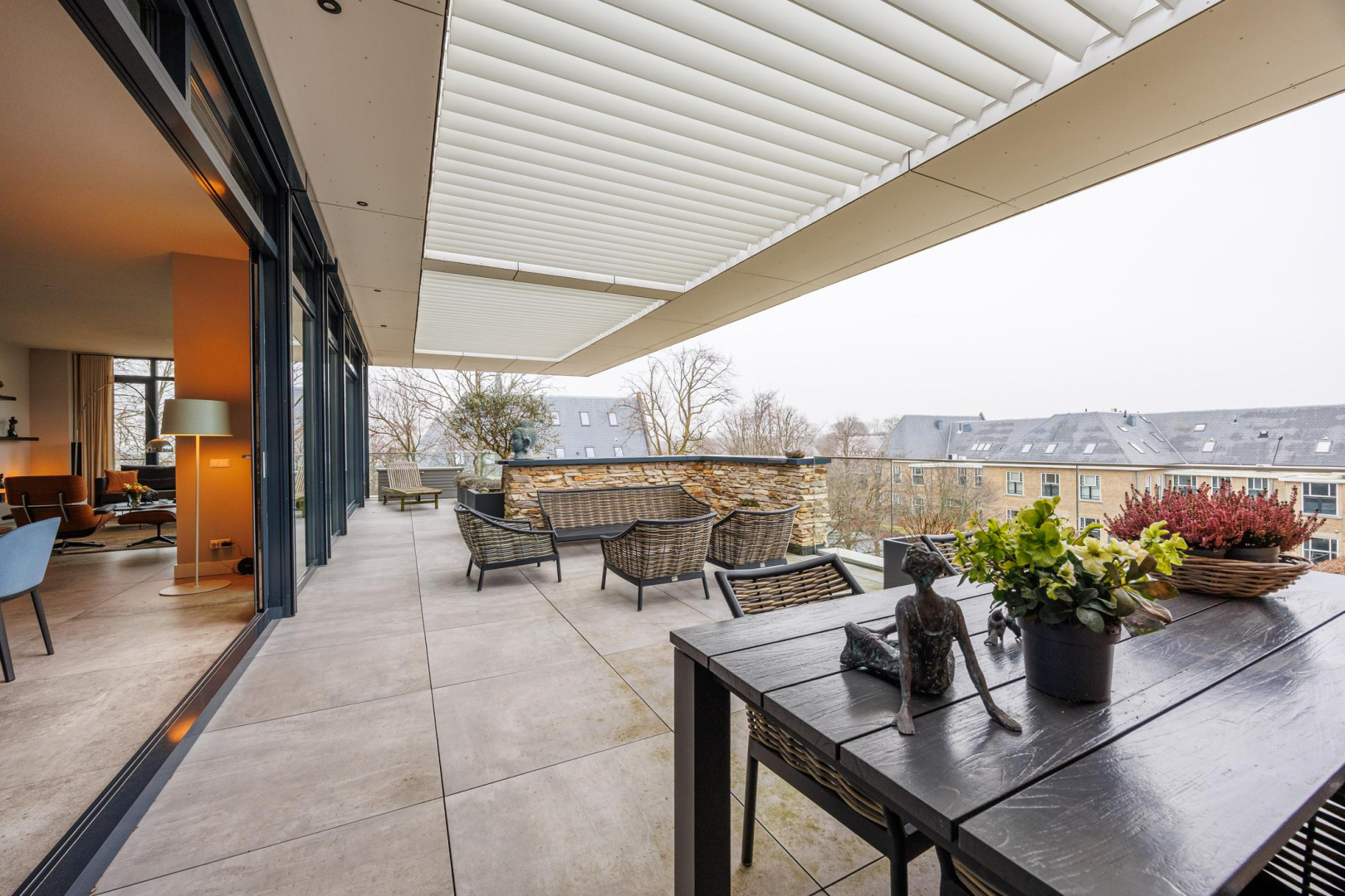 Het zonnige terras op het Zuidoosten sluit qua stijl naadloos aan bij de inrichting binnen. Het bijzondere natuursteen vindt u ook hier terug en samen met de glazen balkon afscheidingen, de lamellen en de warme, grote terras tegels, waant u zich hier in het buitenland. Met totaal 58 m² aan terras is er volop ruimte om te relaxen, loungen, alsmede te dineren aan een grote gezellige eettafel.