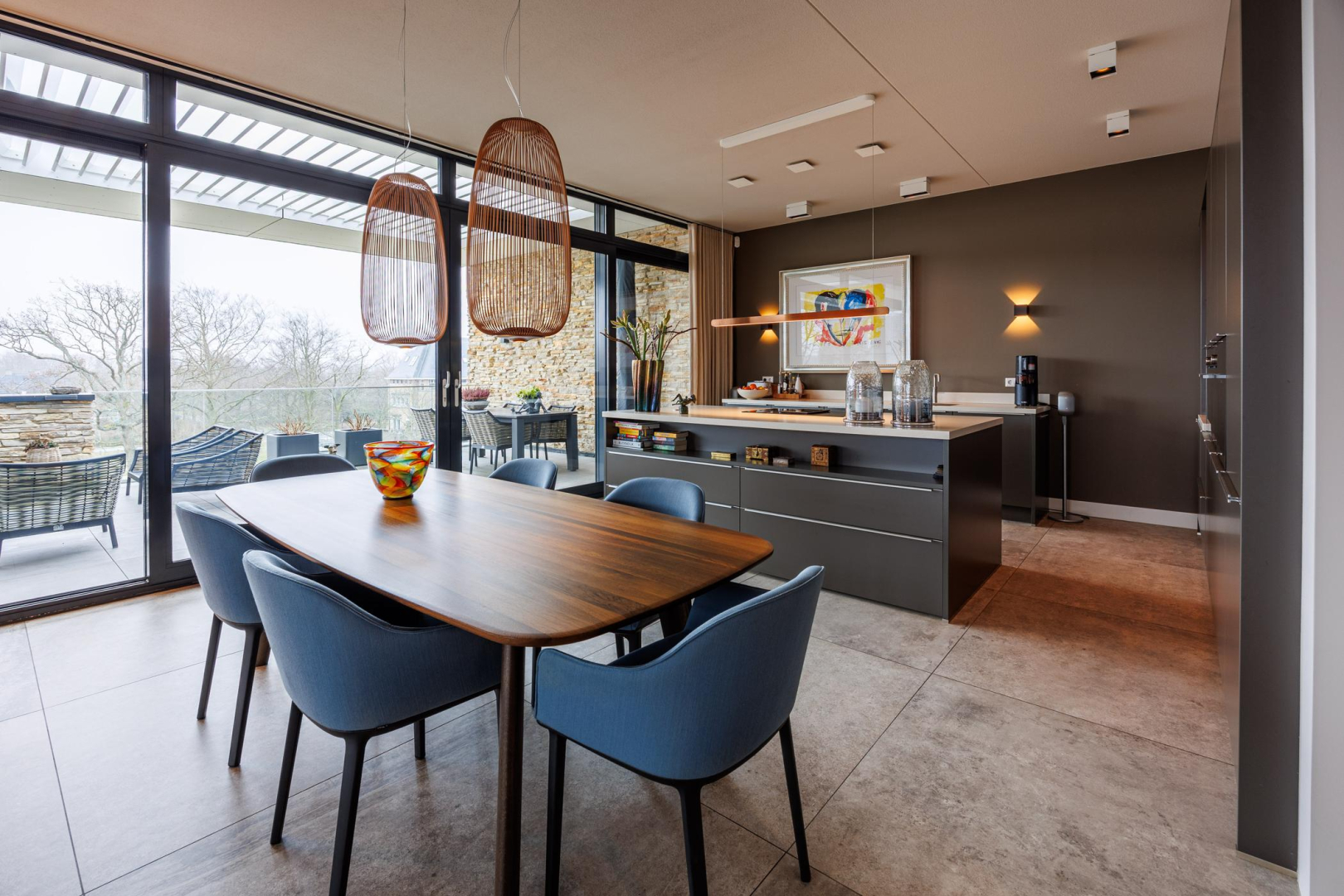 Via de dubbele glazen deuren komt u in de sfeervolle living. De royale plafondhoogte van maar liefst 3,00 meter, in combinatie met de verdiepingshoge ramen en de schuifpui naar het terras, zorgt voor een indrukwekkend ruimtelijk gevoel en een overvloed aan daglicht. Binnen en buiten lopen hier naadloos in elkaar over. Het woongedeelte biedt een comfortabel zitgedeelte met een prachtig uitzicht en vormt een heerlijke plek om te ontspannen. De grote vloertegels in een warme tint, het hoge afwerkingsniveau en de open indeling versterken de aangename sfeer van luxe, rust en warmte.