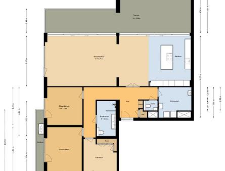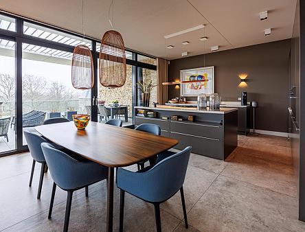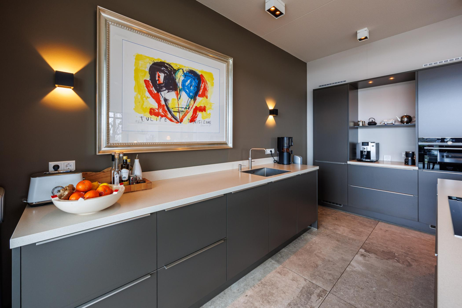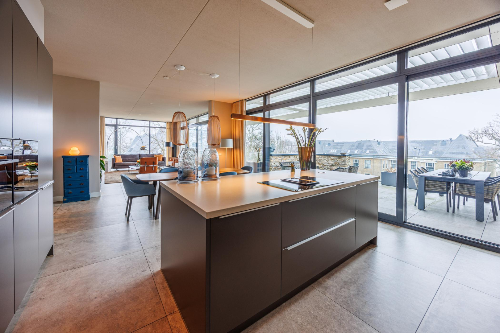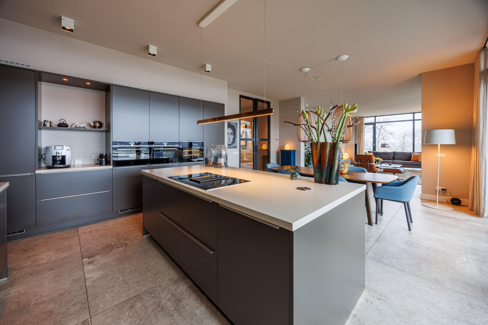De keuken staat in directe verbinding met de living en het royale terras en vormt daarmee een natuurlijk verlengstuk van de leefruimte. De maatwerkopstelling is uitgevoerd met hoogwaardige inbouwapparatuur en een stijlvol kookeiland, aangevuld met een apart spoelgedeelte en een sfeervolle koffiecorner. De combinatie van donkere keukenfronten met een licht aanrechtblad is smaakvol en sluit perfect aan bij de elegante uitstraling van het appartement. Het kookeiland is uitgerust met een inductiekookplaat met geïntegreerde afzuiging van Siemens en beschikt over een royaal werkblad met geïntegreerd elektrapunt. Daarnaast biedt het eiland veel praktische bergruimte dankzij de ruime lades en kasten aan beide zijden. Tegen de achterwand bevindt zich het spoelgedeelte met een vaatwasser, een spoelbak en een Quooker-kraan die naast warm en koud water ook kokend én gekoeld bruisend water levert. Het ruime werkblad en de uitgebreide kastruimte maken deze keuken niet alleen stijlvol, maar ook uiterst functioneel. In de maatwerk kastenwand vindt u een complete apparatuur wand met volop bergruimte, een koffiehoek, een oven/stoomoven, een combimagnetron/oven, een wijnklimaatkast, een hoge koelkast en een separate vriezer. Een keuken die comfort, luxe en gebruiksgemak op hoog niveau samenbrengt. In de leefkeuken is meer dan voldoende ruimte voor een royale eettafel, waardoor dit gedeelte zich uitstekend leent voor lange, gezellige diners. Ook hier zorgt de schuifpui voor een directe verbinding met het fijne terras. Op het terras is eveneens plaats voor een grote tafel, waardoor u op mooie zomerse avonden comfortabel met vrienden kunt tafelen en tot in de late uurtjes kunt genieten van het buitenleven in een sfeervolle setting.