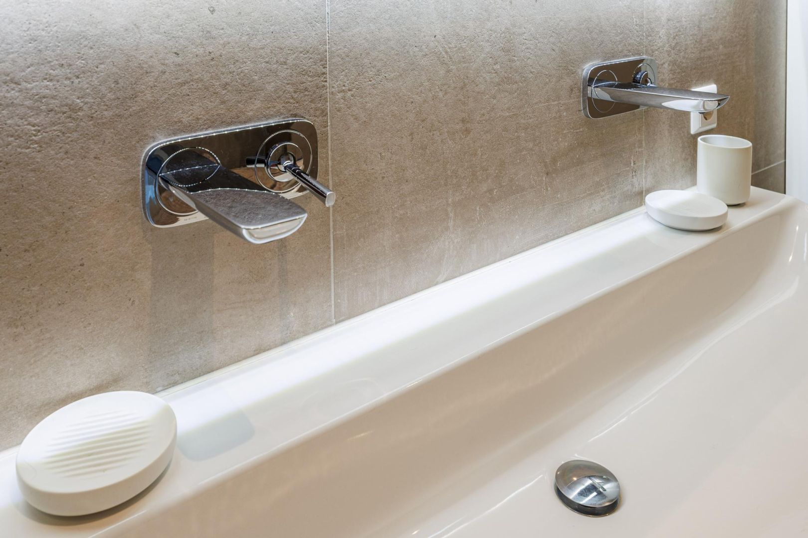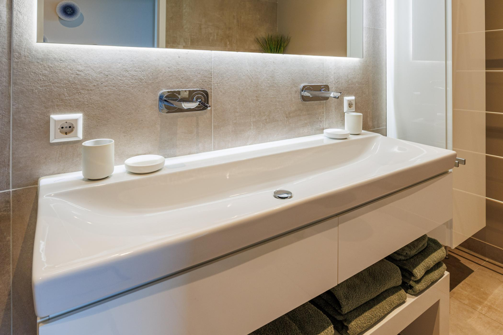De luxe badkamer is compleet uitgevoerd en voorzien van alle comfort. De ruime inloopdouche beschikt over een regendouche, handdouche en strak ingebouwde kranen, wat zorgt voor een moderne en serene uitstraling.