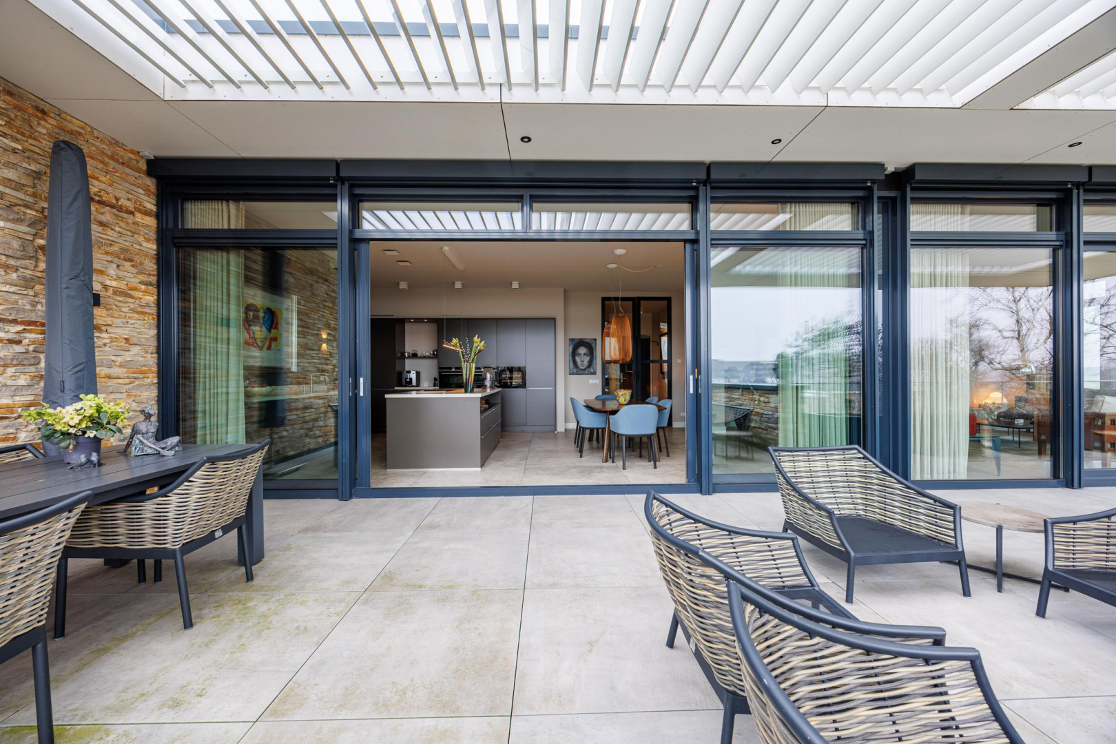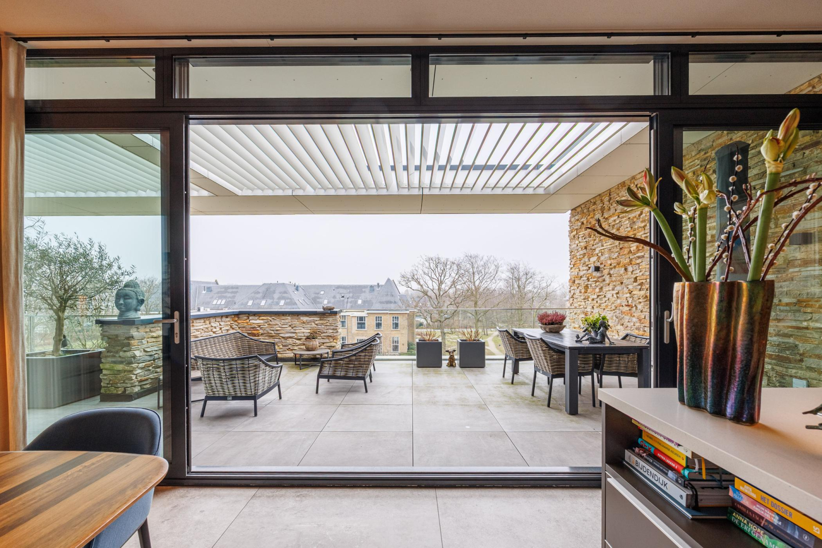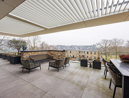 Het ruime, overkapte terras is voorzien van lamellen, waardoor u hier in alle seizoenen comfortabel kunt verblijven. Of het nu gaat om een ontspannen ontbijt in de ochtendzon of een sfeervol diner met vrienden in de avond: dit terras vormt een verlengstuk van uw woonruimte.