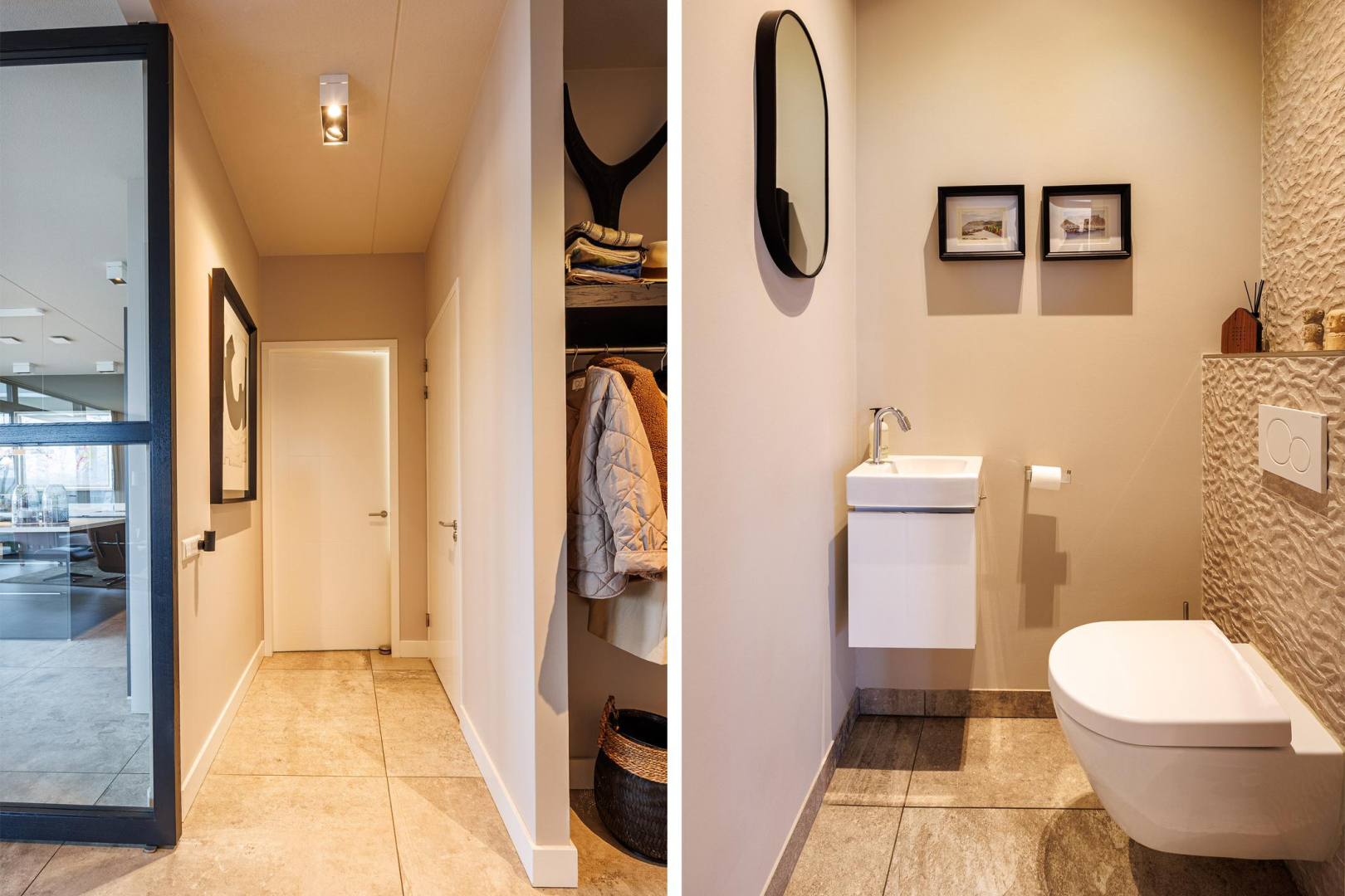 Bij binnenkomst via de voordeur heeft u direct een indrukwekkende zichtlijn door de dubbele, hoge taatsdeuren naar het geweldige terras, de prachtige omgeving en schitterende Hollandse luchten. De hal is praktisch én stijlvol ingericht en beschikt over een garderobenis, meterkast en een luxe toiletruimte, geheel uitgevoerd in het hoogwaardige afwerkingsniveau van het appartement, met een wandcloset en fontein. Aangrenzend bevindt zich een ruime en functionele bijkeuken met volop bergruimte. Deze ruimte is voorzien van een uitstortgootsteen, de opstelplaatsen voor wasapparatuur, de cv-installatie en de mechanische ventilatie.
