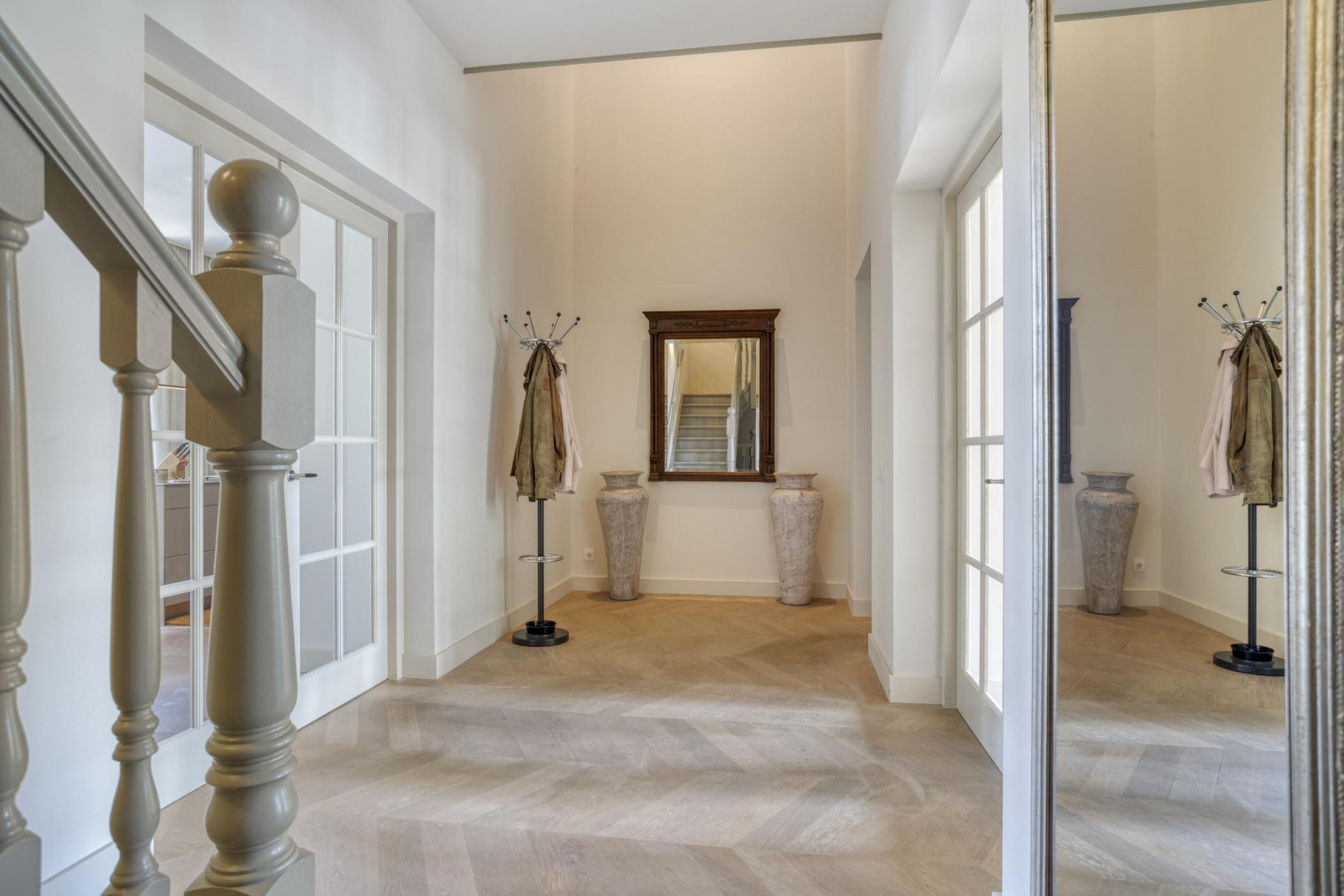 De voorzijde van het herenhuis biedt een heerlijk terras met vrij uitzicht over het landgoed. De dubbele voordeur geeft toegang tot de hal, een prachtige binnenkomst die u nieuwsgierig maakt naar de rest van de woning.