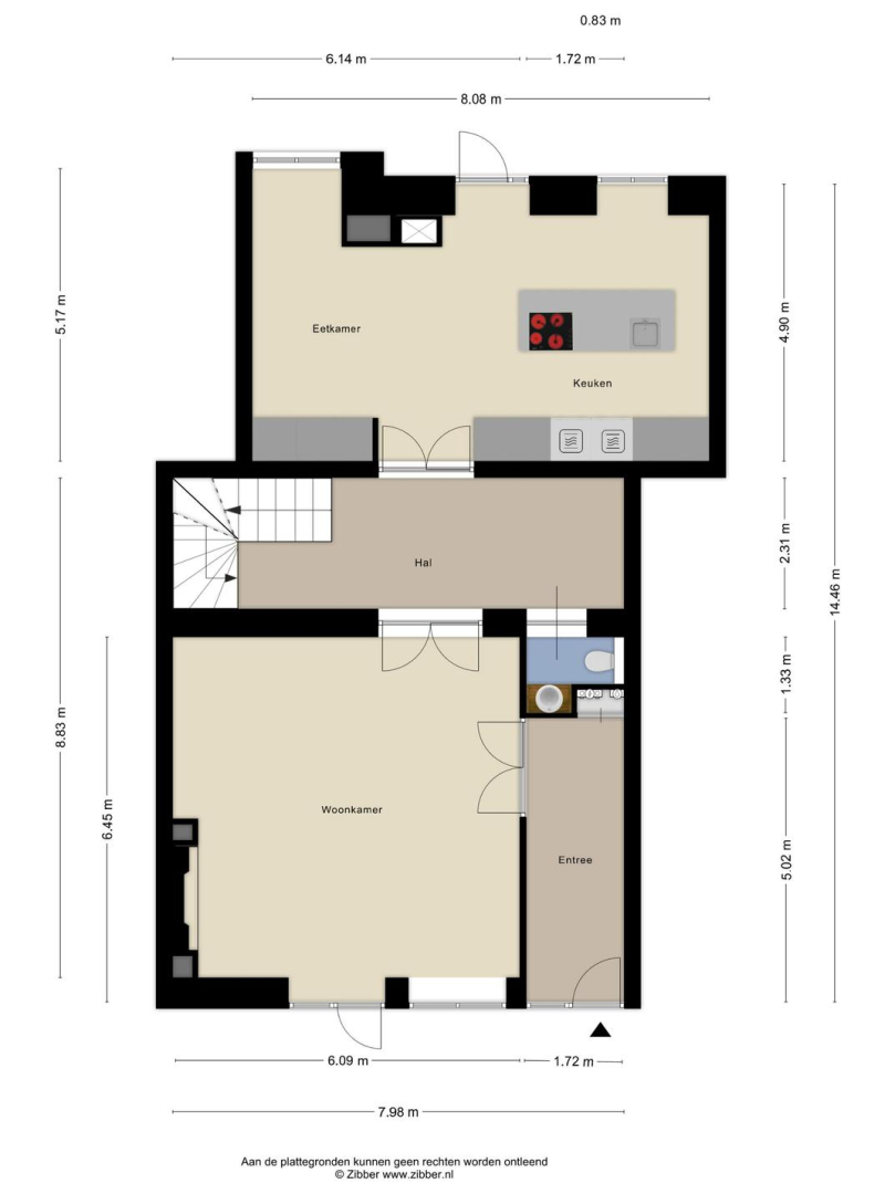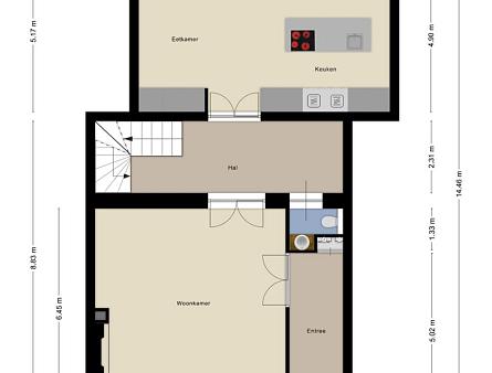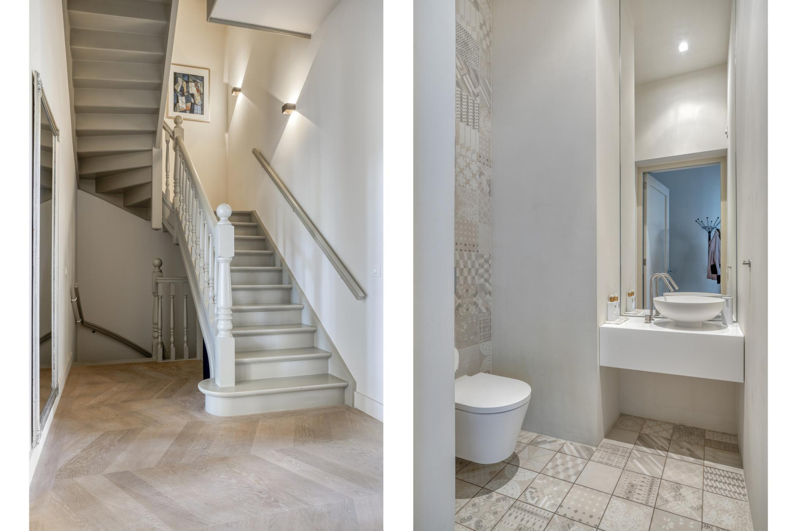 Via de hal bereikt u de royale woonkeuken. In de hal is er een prachtig trappenhuis, geheel in de stijl van de woning, en een ruim toilet met wandcloset en fontein. Tevens bevindt zich hier de trap naar de ondergelegen kelder.