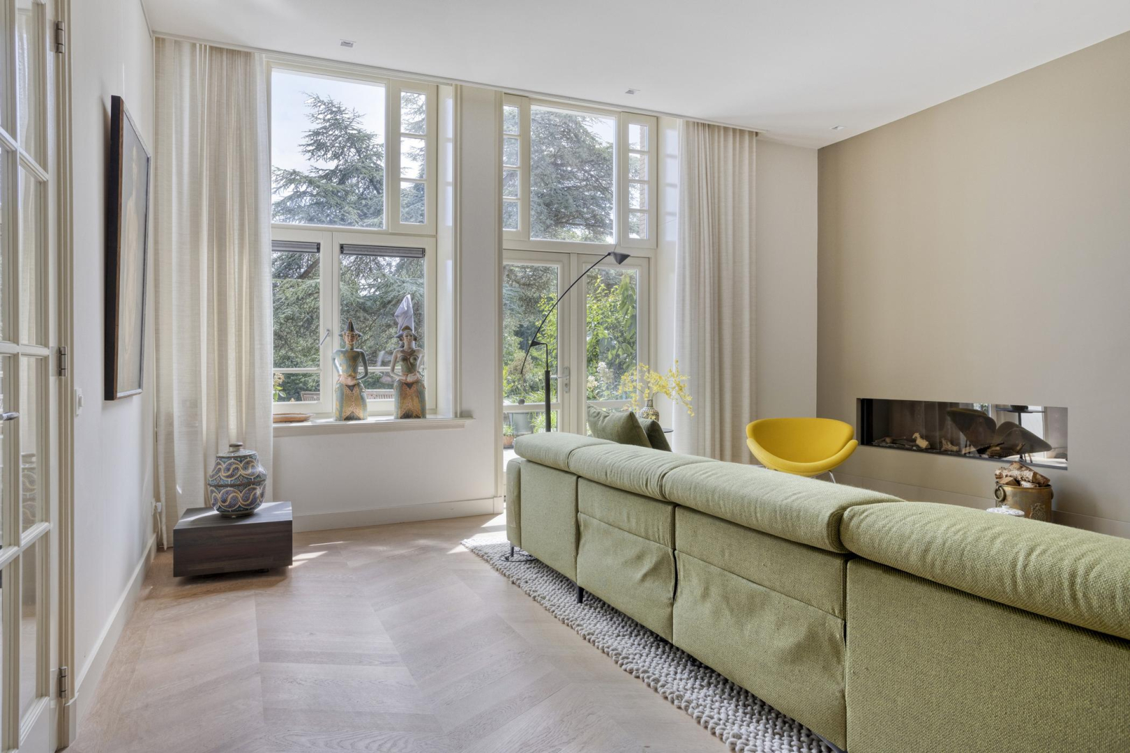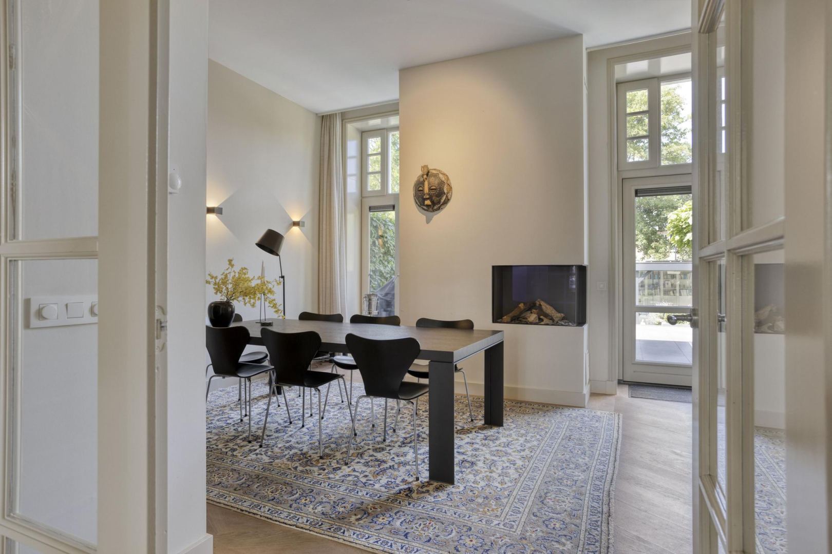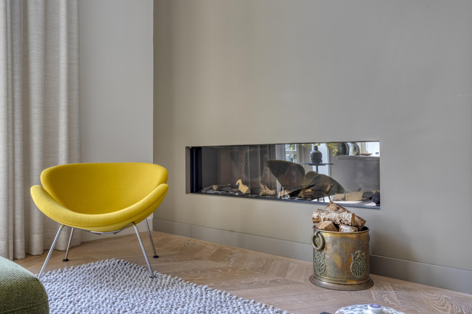 Vanuit de hal betreedt u, via de dubbele glazen deuren, de lichte woonkamer die een warme en uitnodigende sfeer ademt, mede door de gezellige gasgestookte haard. De gehele begane grond is voorzien van een prachtige Hongaarse punt vloer met vloerverwarming, wat luxe en comfort perfect combineert. Via de openslaande deuren in de woonkamer loopt u zo het terras op van dit fijne herenhuis, waar u een heerlijke plek heeft om te genieten van een kopje koffie in de ochtendzon.