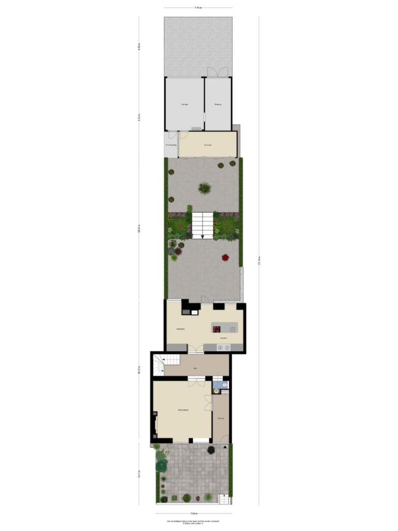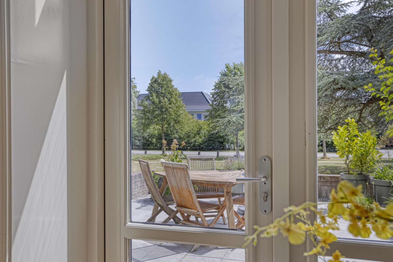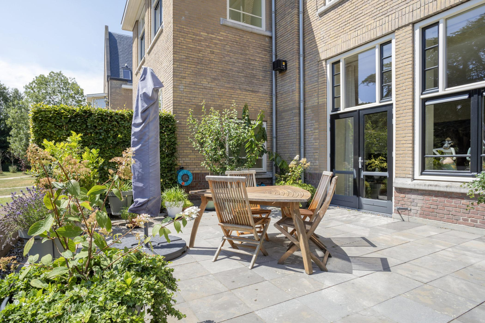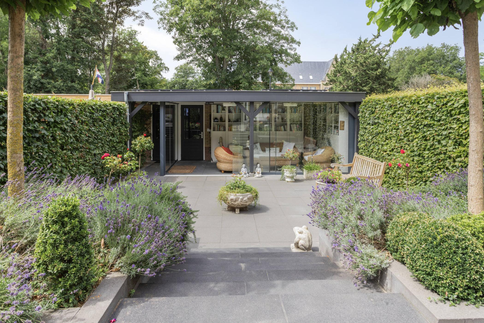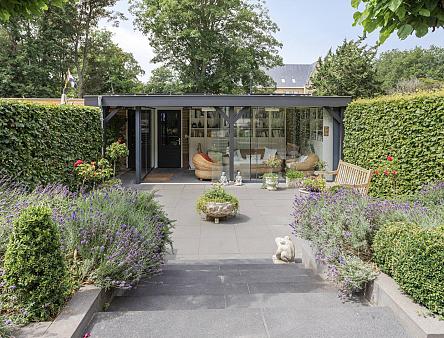 De heerlijk zonnige en onderhoudsarme achtertuin (aangelegd 2022) bereikt u via de woonkeuken of via de (dubbele) garage die achter de woning ligt. De garage heeft een elektrische roldeur en de aangrenzende tweede, kleinere garage/berging heeft openslaande deuren. In de achtertuin is het volop genieten, zowel in de zon als onder de luxe veranda met glazen wanden, afsluitbaar en voorzien van twee heaters.