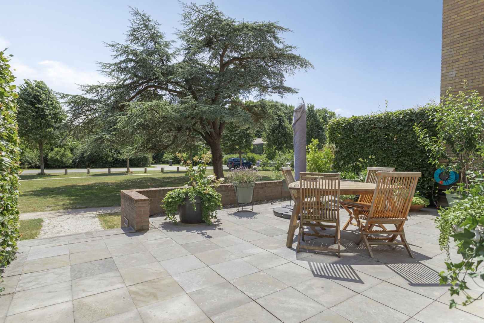 Aan de voorzijde is er een heerlijk terras op het zuidoosten met uitzicht op de prachtige blauwspar. De achtertuin is fijn breed en biedt veel privacy door de groene hagen en er zijn diverse borders waar groene beplanting is aangebracht.