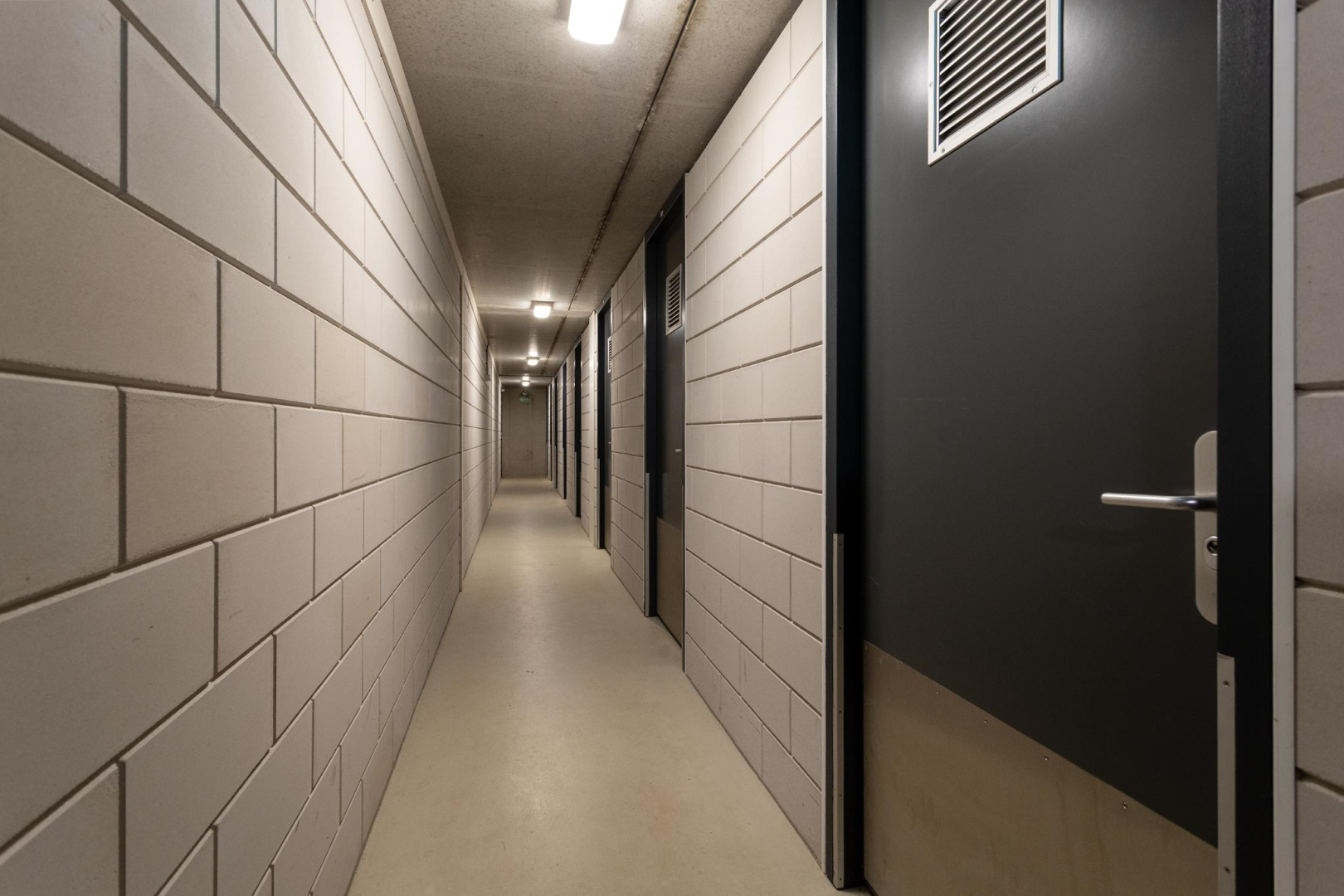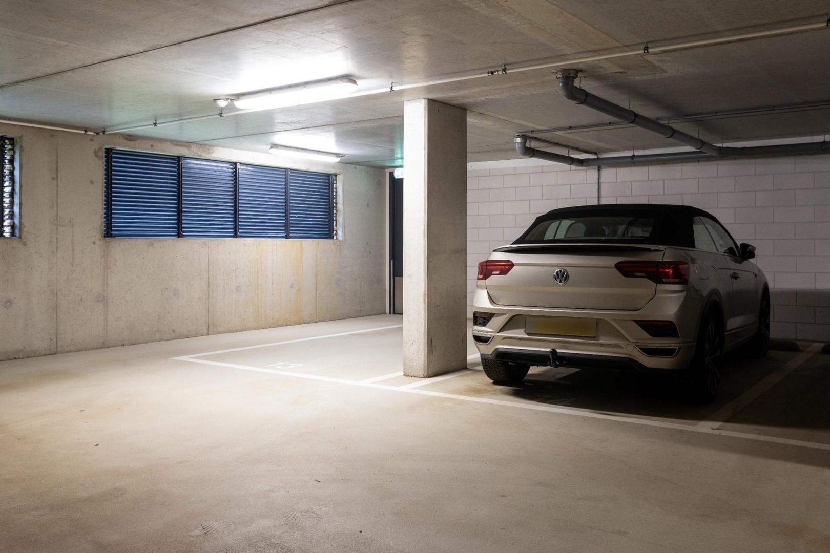 Via een flauwe hellingbaan komt u in de half verdiepte en afgesloten parkeergarage. De hellingbaan is voor winterse taferelen voorzien van rijbaanverwarming. Met uw persoonlijke afstandsbediening kunt u het elektrische hek openen en bent u op de fiets, dan is er een speciale loopdeur. Hier heeft u uw eigen 2 ruime parkeerplaatsen, alwaar een snellader laadpaal geïnstalleerd is. De parkeerplaatsen zijn gunstig gelegen, direct naast de toegang tot de berging.