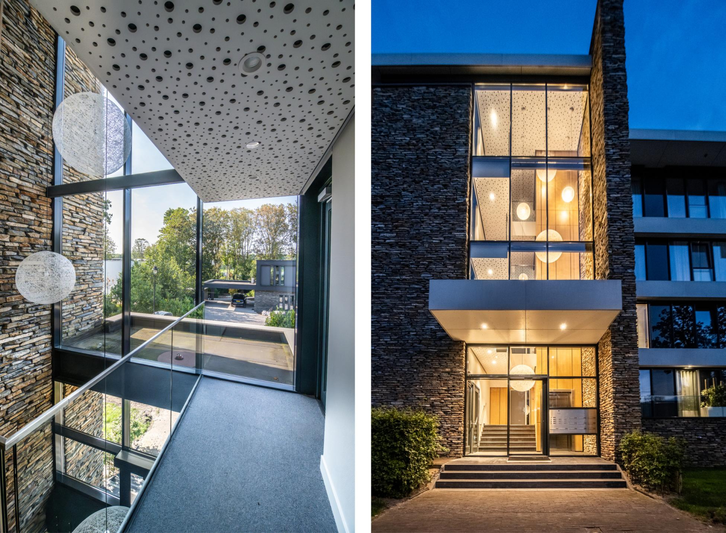 De natuurstenen gevels, het vele glas en de granieten trap geven direct een luxe uitstraling. Via een helling pad is de hoofdentree ook bereikbaar voor mindervaliden. De geweldige entree is zeker imposant te noemen met ook hier binnen als directe eyecatcher de natuurstenen wand, prachtige houtafwerking en de mooie lichtbollen. Hier vindt u de lift, trappenhuis, video intercom en de brievenbussen.