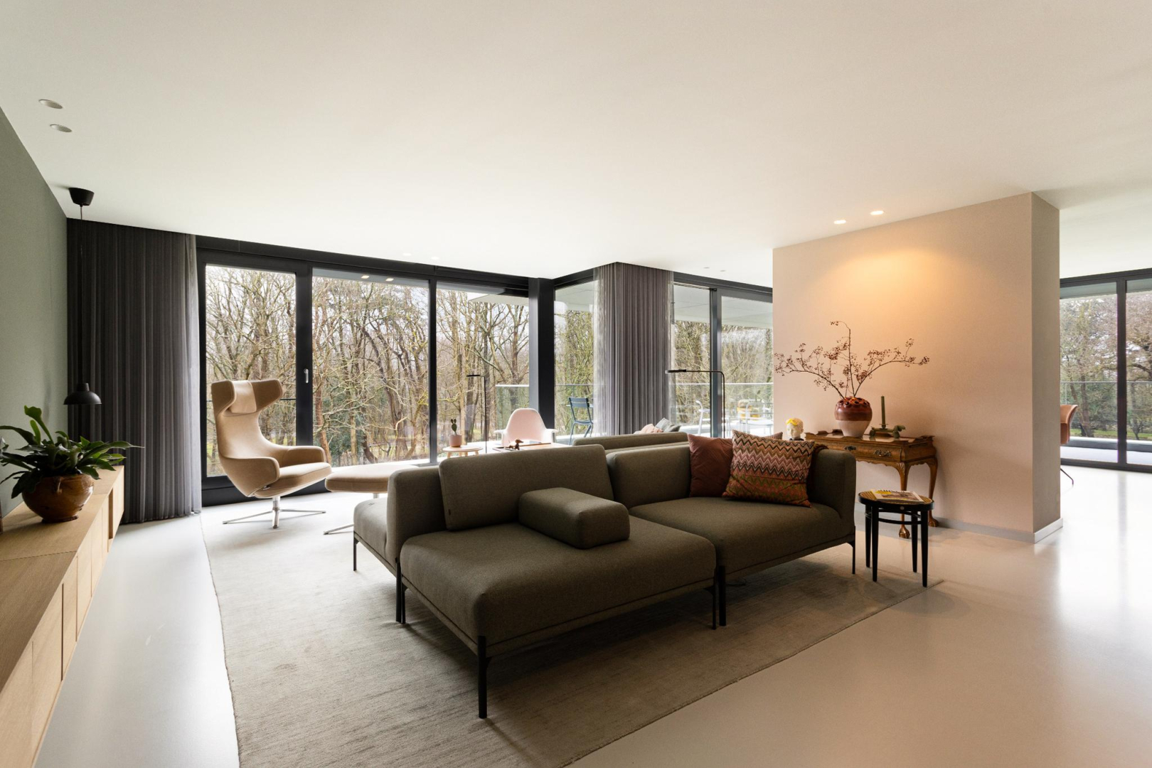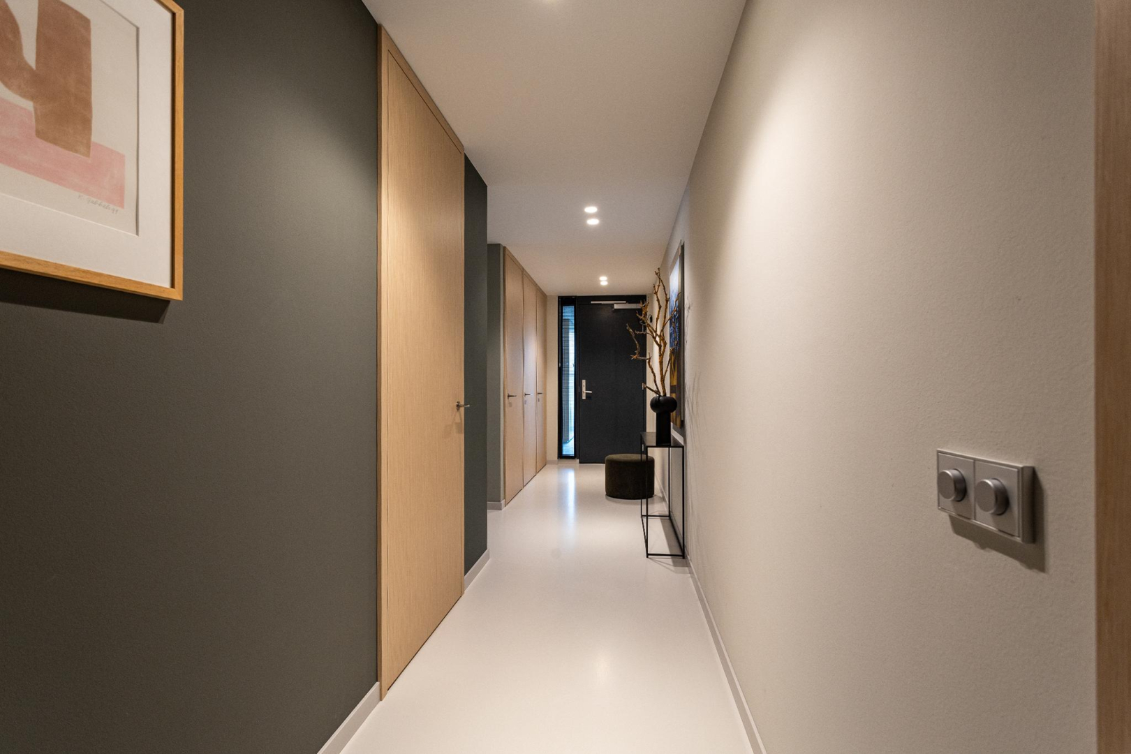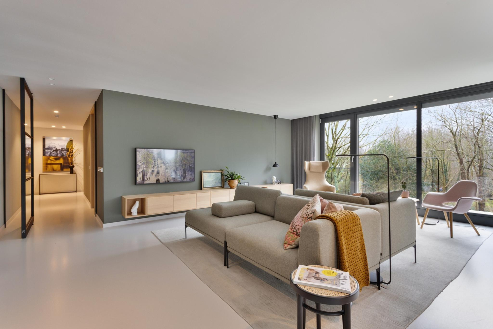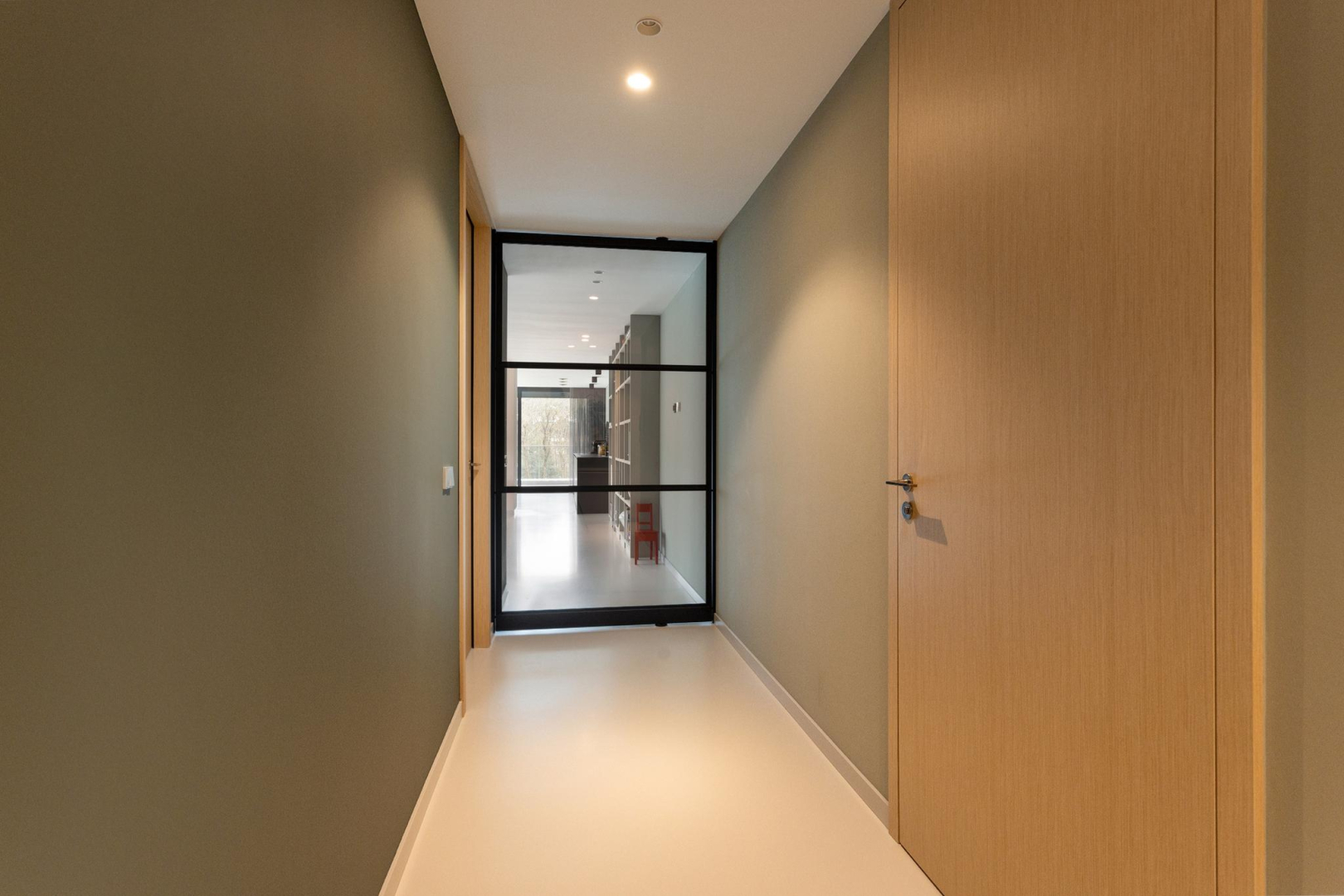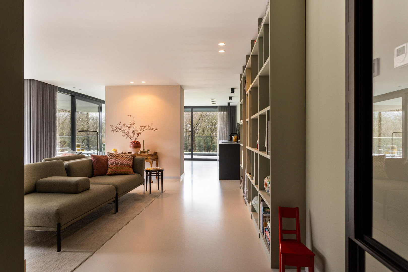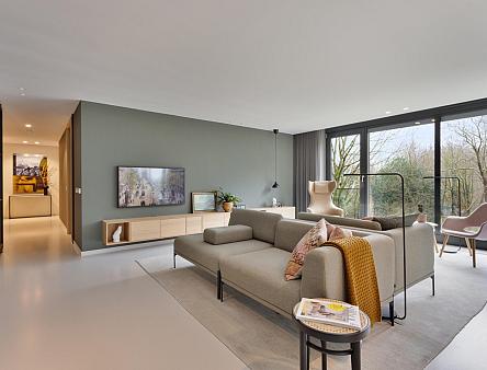 Vanuit de hal heeft u direct een mooie zichtlijn door de stalen taatsdeur van 120 cm breed (De Rooy) richting het terras en de prachtige groene omgeving en blauwe luchten. Het verlaagde plafond met Wever & Ducre inbouwspots en de verdiepingshoge ramen en schuifpui naar het terras geven een ruimtelijk effect, een optimale lichtinval èn zorgen ervoor dat binnen buiten wordt en buiten binnen. In de living is een comfortabel zitgedeelte met een fraai uitzicht over het park en een maatwerk vakken kast. De moderne gietvloer, het hoge afwerkingsniveau en de open ruimte, versterken de aangename sfeer van luxe en warmte.